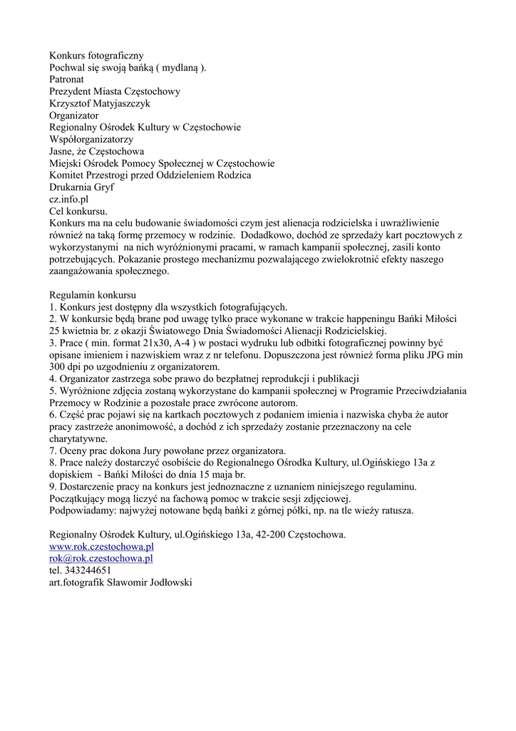 Konkurs fotograficzny Pochwal się swoją bańką ( mydlaną ). Patronat Prezydent Miasta Częstochowy Krzysztof Matyjaszczyk Organizator Regionalny Ośrodek Kultury w Częstochowie Współorganizatorzy Jasne, że Częstochowa Miejski Ośrodek Pomocy Społecznej w Częstochowie Komitet Przestrogi przed Oddzieleniem Rodzica Drukarnia Gryf cz.info.pl Cel konkursu. Konkurs ma na celu budowanie świadomości czym jest alienacja rodzicielska i uwrażliwienie również na taką formę przemocy w rodzinie. Dodadkowo, dochód ze sprzedaży kart pocztowych z wykorzystanymi na nich wyróżnionymi pracami, w ramach kampanii społecznej, zasili konto potrzebujących. Pokazanie prostego mechanizmu pozwalającego zwielokrotnić efekty naszego zaangażowania społecznego. Regulamin konkursu 1. Konkurs jest dostępny dla wszystkich fotografujących. 2. W konkursie będą brane pod uwagę tylko prace wykonane w trakcie happeningu Bańki Miłości 25 kwietnia br. z okazji Światowego Dnia Świadomości Alienacji Rodzicielskiej. 3. Prace ( min. format 21x30, A-4 ) w postaci wydruku lub odbitki fotograficznej powinny być opisane imieniem i nazwiskiem wraz z nr telefonu. Dopuszczona jest również forma pliku JPG min 300 dpi po uzgodnieniu z organizatorem. 4. Organizator zastrzega sobe prawo do bezpłatnej reprodukcji i publikacji 5. Wyróżnione zdjęcia zostaną wykorzystane do kampanii społecznej w Programie Przeciwdziałania Przemocy w Rodzinie a pozostałe prace zwrócone autorom. 6. Część prac pojawi się na kartkach pocztowych z podaniem imienia i nazwiska chyba że autor pracy zastrzeże anonimowość, a dochód z ich sprzedaży zostanie przeznaczony na cele charytatywne. 7. Oceny prac dokona Jury powołane przez organizatora. 8. Prace należy dostarczyć osobiście do Regionalnego Ośrodka Kultury, ul.Ogińskiego 13a z dopiskiem - Bańki Miłości do dnia 15 maja br. 9. Dostarczenie pracy na konkurs jest jednoznaczne z uznaniem niniejszego regulaminu. Początkujący mogą liczyć na fachową pomoc w trakcie sesji zdjęciowej. Podpowiadamy: najwyżej notowane będą bańki z górnej półki, np. na tle wieży ratusza. Regionalny Ośrodek Kultury, ul.Ogińskiego 13a, 42-200 Częstochowa. www.rok.czestochowa.pl [email protected] tel. 343244651 art.fotografik Sławomir Jodłowski