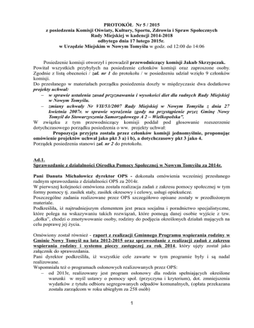 PROTOKÓŁ Nr 5 / 2015 z posiedzenia Komisji Oświaty, Kultury, Sportu, Zdrowia i Spraw Społecznych Rady Miejskiej w kadencji 2014-2018 odbytego dnia 17 lutego 2015r. w Urzędzie Miejskim w Nowym Tomyślu w godz. od 12:00 do 14:06 Posiedzenie komisji otworzył i prowadził przewodniczący komisji Jakub Skrzypczak. Powitał wszystkich przybyłych na posiedzenie członków komisji oraz zaproszone osoby. Zgodnie z listą obecności / zał. nr 1 do protokołu / w posiedzeniu udział wzięło 9 członków komisji. Do przesłanego w materiałach porządku posiedzenia doszły w międzyczasie dwa dodatkowe projekty uchwał: w sprawie ustalenia zasad przyznawania i wysokości diet dla radnych Rady Miejskiej w Nowym Tomyślu. zmiany uchwały Nr VII/53/2007 Rady Miejskiej w Nowym Tomyślu z dnia 27 kwietnia 2007r. w sprawie wyrażenia zgody na przystąpienie przez Gminę Nowy Tomyśl do Stowarzyszenia Samorządowego A 2 – Wielkopolska”. W związku z tym przewodniczący komisji poddał pod głosowanie rozszerzenie dotychczasowego porządku posiedzenia o ww. projekty uchwał: Propozycja przyjęta została przez członków komisji jednomyślnie, proponując omówienie projektów uchwał jako pkt 3 a) i b), a dotychczasowy pkt 3 jako 4. Porządek posiedzenia stanowi zał. nr 2 do protokołu. Ad.1. Sprawozdanie z działalności Ośrodka Pomocy Społecznej w Nowym Tomyślu za 2014r. Pani Danuta Michałowicz dyrektor OPS - dokonała omówienia wcześniej przesłanego radnym sprawozdania z działalności OPS za 2014r. W pierwszej kolejności omówiona została realizacja zadań z zakresu pomocy społecznej w tym formy pomocy tj. zasiłek stały, zasiłek okresowy i celowy, usługi opiekuńcze. Poszczególne zadania realizowane przez OPS szczegółowo opisane zostały w przedłożonym materiale. Podkreśliła, iż najtrudniejszym elementem jest praca socjalna i poradnictwo specjalistyczne, które polega na wskazywaniu takich rozwiązań, które pomogą danej osobie wyjście z tzw. „dołka”, chodzi o zmotywowanie osoby, rodziny do podjęcia określonych działań mających na celu poprawę jej życia. Omówiony został również - raport z realizacji Gminnego Programu wspierania rodziny w Gminie Nowy Tomyśl na lata 2012-2015 oraz sprawozdanie z realizacji zadań z zakresu wspierania rodziny i systemu pieczy zastępczej za rok 2014, który ujęty został jako załącznik do sprawozdania. Pani dyrektor podkreśliła, iż wszystkie cele zawarte w tym programie były i są nadal realizowane. Wspomniała też o programach osłonowych realizowanych przez OPS: od 2013r, realizowany jest program osłonowy dla rodzin spełniających określone warunki w myśl ustawy o pomocy społ. (przyczyna i kryterium), dot. zmniejszenia wydatków z tytułu odbioru segregowanych odpadów komunalnych, (opłata przekazana została zarządcom w roku ubiegłym za 258 osób) 1 Karta Rodziny 3+ - gminna (w roku ubiegłym do programu przystąpiło 275 rodzin), Karta Dużej Rodziny /krajowa ( program rządowy w naszej gminie skorzystało z tego 77 rodzin), Wielkopolska Karta Rodziny (nie jest to jeszcze dograne pierwsze wnioski wydawane będą w marcu br. Wlkp. Karta Rodziny będzie zawierała również logo naszej gminy i osoby, które mają naszą gminną kartę będą mogły korzystać z uprawnień które daje ta Wielkopolska Karta). Przewodniczący komisji zaproponował w tym miejscu dyskusję nad przedstawionym do tej pory materiałem: Radny Jan Klimko – poprosił o podanie definicji bezrobocia, pytał kto jest osobą bezrobotną w rozumieniu OPS? Dyrektor Michałowicz – wyjaśniła, iż w pomocy społecznej za osobę bezrobotną uważana jest osoba, która jest zarejestrowana w Powiatowym Urzędzie Pracy. Podawane w sprawozdaniu dane w tym zakresie są danymi z PUP. Odpowiadając na pytanie radnego Radwana, wyjaśniła sprawę dot. dzieci z innych gmin przebywających w rodzinach zastępczych na naszym terenie. Stwierdziła, iż są to zadania PCPR. Nasza gmina płaci za dzieci przebywające w placówkach czy rodzinach zastępczych kiedy rodzice biologiczni pochodzą z naszej gminy. Zwróciła uwagę, iż są czasami wskazania ze strony psychologa, by dziecko było właśnie dalej od miejsca dotychczasowego zamieszkania. Ponadto są przypadki konieczności umieszczenia dziecka w placówce specjalistycznej, której na naszym terenie czy też w powiecie, a nawet województwie nie ma. Poruszona została przez radnego też kwestia możliwości korzystania dzieci z rodzin wielodzietnych z większej ilości wycieczek szkolnych dotowanych, w tej ustalonej w uchwale kwocie do 500 zł. Chodziło o to, by skorzystanie z jednej tańszej wycieczki na początku roku nie zamykało drogi do korzystania z kolejnych. Padło pytanie czy są możliwości zmiany w tym zakresie. Pani dyrektor wyjaśniła, iż zawsze jest możliwość dokonania zmiany uchwały. W trakcie przygotowywania tej uchwały prowadzone były rozmowy z dyrektorami szkół, którzy informowali, że na te krótsze, tańsze wycieczki dzieci jeżdżą, ale nie wyjeżdżają na te dłuższe i droższe, gdyż rodziny wielodzietnej na to zazwyczaj nie stać. Gdyby jednak zacząć te dopłaty za krótsze wycieczki sumować to na pewno generowałoby to określone wyższe środki. Odpowiedziała też na pytanie dotyczące zmian przepisów wyjaśniając, iż od 2 lat oczekuje się na reformę w pomocy społecznej, która jest zapowiadana. Są dwa warianty przygotowywane przez Ministerstwo Zdrowia, dotyczące zmian, które zupełnie przeorganizowałyby strukturę ośrodka, ale i pierwszy i drugi projekt upadł w konsultacjach z Ministerstwem Finansów. Są zapowiedzi, że ministerstwo pracuje nad trzecim wariantem i od stycznia 2016 ma wejść w życie. Wyjaśniła też sprawę pobierania zasiłków przez gospodarstwo domowe, czyli osoby pozostające we wspólnym gospodarstwie, ale niekoniecznie jako rodzina typu mąż, żona i dzieci, może to być tak samo rodzeństwo wspólni