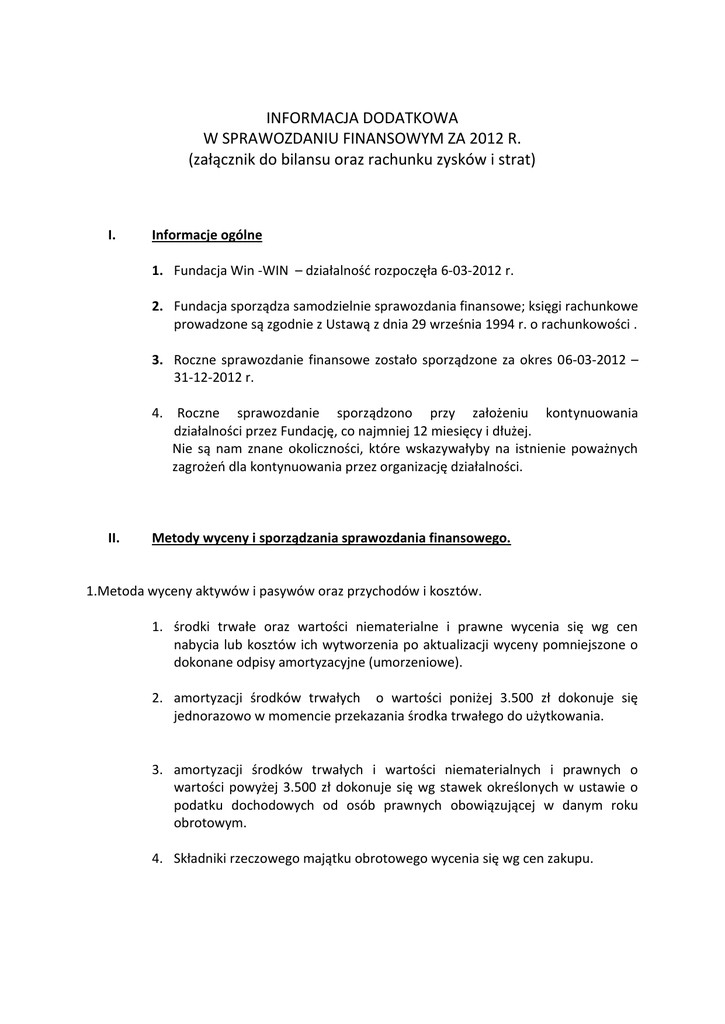 INFORMACJA DODATKOWA W SPRAWOZDANIU FINANSOWYM ZA 2012 R. (załącznik do bilansu oraz rachunku zysków i strat) I. Informacje ogólne 1. Fundacja Win -WIN – działalność rozpoczęła 6-03-2012 r. 2. Fundacja sporządza samodzielnie sprawozdania finansowe; księgi rachunkowe prowadzone są zgodnie z Ustawą z dnia 29 września 1994 r. o rachunkowości . 3. Roczne sprawozdanie finansowe zostało sporządzone za okres 06-03-2012 – 31-12-2012 r. 4. Roczne sprawozdanie sporządzono przy założeniu kontynuowania działalności przez Fundację, co najmniej 12 miesięcy i dłużej. Nie są nam znane okoliczności, które wskazywałyby na istnienie poważnych zagrożeń dla kontynuowania przez organizację działalności. II. Metody wyceny i sporządzania sprawozdania finansowego. 1.Metoda wyceny aktywów i pasywów oraz przychodów i kosztów. 1. środki trwałe oraz wartości niematerialne i prawne wycenia się wg cen nabycia lub kosztów ich wytworzenia po aktualizacji wyceny pomniejszone o dokonane odpisy amortyzacyjne (umorzeniowe). 2. amortyzacji środków trwałych o wartości poniżej 3.500 zł dokonuje się jednorazowo w momencie przekazania środka trwałego do użytkowania. 3. amortyzacji środków trwałych i wartości niematerialnych i prawnych o wartości powyżej 3.500 zł dokonuje się wg stawek określonych w ustawie o podatku dochodowych od osób prawnych obowiązującej w danym roku obrotowym. 4. Składniki rzeczowego majątku obrotowego wycenia się wg cen zakupu. 2 5. Należności, zobowiązania i kredyty wycenia się wg kwot wymagających zapłaty na dzień bilansowy. 6. Środki pieniężne wycenia się wg wartości nominalnej. 7. Kapitały wycenia się wg wartości nominalnej. 8. Przychody i koszty – zgodnie z zasadą memoriału ujęte są wszelkie osiągnięte przychody i koszty dotyczące danego roku obrotowego, niezależnie od terminu ich zapłaty. Wszelkie poniesione koszty rozliczane są bieżąco lub w czasie, jeżeli dotyczą następnych okresów sprawozdawczych. 2. Zmiany metod księgowości i wyceny w roku obrotowym. Fundacja rozpoczęła działalność w roku obrotowym. 3. Zmiany sposobu sporządzania sprawozdania finansowego w stosunku do roku poprzedniego. Fundacja rozpoczęła działalność w roku obrotowym. 4. Informacje o znaczących zdarzeniach jakie nastąpiły po dniu bilansowym a nie uwzględnionych w bilansie i rachunku zysków i strat. Po dniu bilansowym nie wystąpiły zdarzenia mające wpływ na sytuację finansową Fundacji. 5. Informacje o znaczących zdarzeniach dotyczących lat ubiegłych ujętych w sprawozdaniu finansowym roku obrotowego. Fundacja rozpoczęła działalność w roku obrotowym. II Uzupełniające dane i aktywach i pasywach bilansu. 1. Zakres zmian wartości środków trwałych. W roku 2012 nie zakupiono środków trwałych amortyzowanych w czasie. Zakupione środki trwałe są wpisywane do osobnej ewidencji i księgowane w koszty w momencie przyjęcia do używania. 2. Wartość gruntów otrzymanych w użytkowanie wieczyste. Fundacja nie użytkuje wieczyście gruntów. 3 3. Wartość nie amortyzowanych środków trwałych użytkowanych na podstawie umowy najmu dzierżawy i innych umów. Fundacja nie użytkuje obcych środków trwałych. DODATKOWE OBJAŚNIENIA DO BILANSU Aktywa obrotowe Środki pieniężne w kasie i na rachunkach bankowych Łącznie 5 280,93 5 280,93 Pasywa - zobowiązania i rezerwy Zobowiązania krótkoterminowe – faktury niewymagalne zapłacone w 01/2013 r. Rozrachunki z budżetami – podatek PIT 4 Łącznie III. 2 500 2 717 5 217 Uzupełniające dane o przychodach i kosztach oraz wyniku finansowym. Nie wystąpiły pozycje różniące podstawę opodatkowania podatkiem dochodowym od wyniku finansowego. Przychody ogółem Koszty ogółem Dochód 124 600,00 zł 124 536,07 zł 63,93 zł Toruń, dnia 31 marzec 2013 rok Sporządził: Zatwierdził: