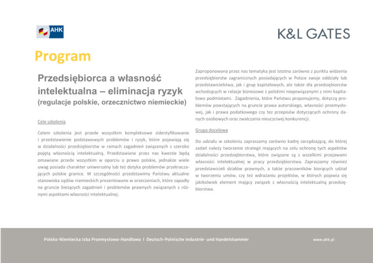 Program Przedsiębiorca a własność intelektualna – eliminacja ryzyk (regulacje polskie, orzecznictwo niemieckie) Cele szkolenia Celem szkolenia jest przede wszystkim kompleksowe zidentyfikowanie i przedstawienie podstawowych problemów i ryzyk, które pojawiają się w działalności przedsiębiorstw w ramach zagadnień związanych z szeroko pojętą własnością intelektualną. Przedstawiane przez nas kwestie będą omawiane przede wszystkim w oparciu o prawo polskie, jednakże wiele uwag posiada charakter uniwersalny lub też dotyka problemów przekraczających polskie granice. W szczególności przedstawimy Państwu aktualne stanowiska sądów niemieckich prezentowane w orzeczeniach, które zapadły na gruncie bieżących zagadnień i problemów prawnych związanych z różnymi aspektami własności intelektualnej. Zaproponowana przez nas tematyka jest istotna zarówno z punktu widzenia przedsiębiorstw zagranicznych posiadających w Polsce swoje oddziały lub przedstawicielstwa, jak i grup kapitałowych, ale także dla przedsiębiorców wchodzących w relacje biznesowe z polskimi niepowiązanymi z nimi kapitałowo podmiotami. Zagadnienia, które Państwu proponujemy, dotyczą problemów powstających na gruncie prawa autorskiego, własności przemysłowej, jak i prawa podatkowego czy tez przepisów dotyczących ochrony danych osobowych oraz zwalczania nieuczciwej konkurencji. Grupa docelowa Do udziału w szkoleniu zapraszamy zarówno kadrę zarządzającą, do której zadań należy tworzenie strategii mających na celu ochronę tych aspektów działalności przedsiębiorstwa, które związane są z wszelkimi przejawami własności intelektualnej w pracy przedsiębiorstwa. Zapraszamy również przedstawicieli działów prawnych, a także pracowników biorących udział w tworzeniu umów, czy też wdrażaniu projektów, w których pojawia się jakikolwiek element mający związek z własnością intelektualną przedsiębiorstwa. Rejestracja: 9-9:30 Blok prezentacji: 9:30-12:30 (z przerwą kawową 15 min) 12:30-13:30 Przerwa obiadowa Blok prezentacji: 13:30-16:30 (z przerwą kawową 15 min) I) Jak skutecznie nabyć prawa własności intelektualnej? 1) Jak zapewnić sobie jak najwięcej praw? 2) Umowy z pracownikami 3) Umowy „śmieciowe” 4) Umowy zawierane z agencjami reklamowymi 5) Umowa z modelką/modelem Ewa Rusak, Oskar Tułodziecki V) IP, IT i prawo mediów: aktualne tematy w Niemczech 1) Znaki towarowe 2) Nieuczciwa konkurencja 3) Prawo autorskie 4) Ochrona danych osobowych 5) Prawo mediów Martin von Albrecht II) Aspekty podatkowe nabywania praw własności intelektualnej 1) Podatki dochodowe 2) Amortyzacja 3) VAT Piotr Augustyniak VI) Jak chronić tajemnicę przedsiębiorstwa przed konkurencją? 1) Czym właściwie jest tajemnica przedsiębiorstwa? 2) Tajemnica przedsiębiorstwa w orzecznictwie sądów polskich 3) Umowy z pracownikami: umowy o zachowaniu poufności oraz o zakazie konkurencji Ewa Rusak, Marta Wysokińska III) Zarządzanie własnością intelektualną 1) Rola i znaczenie praw własności intelektualnej 2) Podmioty praw autorskich i praw własności przemysłowej 3) Metody ochrony własności intelektualnej w przedsiębiorstwie Ewelina Madej, Michał Ziółkowski IV) Własność intelektualna jako narzędzie planowania podatkowego 1) Jurysdykcje zagraniczne 2) Rodzaje umów między licencjobiorcą a licencjodawcą 3) Działania niedozwolone Piotr Augustyniak VII) Dane osobowe - utrapienie każdego przedsiębiorcy? 1) Czy pracodawca może przetwarzać wszystkie dane osobowe pracownika? 2) Przetwarzanie danych osobowych w grupie kapitałowej 3) Dane osobowe kontrahentów 4) Audyt danych osobowych? Ewelina Madej, Dorota Koseła VIII) Reklama 1) Granice reklamy - reklama jako czyn nieuczciwej konkurencji 2) Przegląd orzecznictwa oraz najnowszych uchwał Komisji Etyki Reklamy Marta Wysokińska, Oskar Tułodziecki Preleganci Oskar Tułodziecki Radca prawny, Partner, K&L Gates, Warszawa Oskar Tułodziecki zajmuje się prawem własności intelektualnej oraz prawem mediów, a także prawem cywilnym i gospodarczym. Doradza klientom w zakresie ochrony praw własności intelektualnej, opracowywania projektów i negocjowania umów. Oprócz doradztwa w zakresie prawa autorskiego i znaków towarowych, występuje w imieniu swoich klientów w sprawach dotyczących tajemnicy handlowej, ochrony danych osobowych oraz ochrony baz danych. Znaczną część jego praktyki stanowią postępowania sądowe z zakresu własności intelektualnej i nieuczciwej konkurencji, a także przeciwdziałanie piractwu i podrabianiu produktów. Reprezentuje licznych klientów w zakresie nielegalnego importowania oraz dystrybucji nielegalnych towarów. Współpracuje również z organami celnymi i innymi organami egzekucyjnymi w Polsce, a także w wielu innych państwach Europy ŚrodkowoWschodniej. Piotr Augustyniak, LL.M. Doradca podatkowy, Partner, K&L Gates, Warszawa Piotr Augustyniak jest specjalistą prawa podatkowego, doradcą podatkowym. Jego doświadczenie obejmuje wsparcie klientów polskich i zagranicznych oraz międzynarodowych korporacji m.in. w zakresie planowania podatkowego, organizacji struktur działalności gospodarczej, nabywania, wydzielania i sprzedaży spółek. Jego praktyka skupia się na międzynarodowym prawie podatkowym, w tym planowaniu podatkowym dotyczącym zapobiegania podwójnemu opodatkowaniu zarówno spółek, jak i zamożnych klientów indywidualnych (High Net Worth Individuals). Z sukcesem reprezentuje klientów w sporach sądowych jak również postępowaniach kontrolnych i podatkowych w szczególności zakresie VAT, CIT i PIT. Dr. Martin von Albrecht Partner, K&L Gates, Berlin Dr. Martin von Albrecht zajmuje się przede wszystkim prawem mediów. Posiada także bogate doświadczenie w doradzaniu wiodącym niemieckim i międzynarodowym firmom w zakresie prawa autorskiego, nieuczciwej konkurencji i finansowania w sektorze filmowym, telewizyjnym i muzycznym. Jest