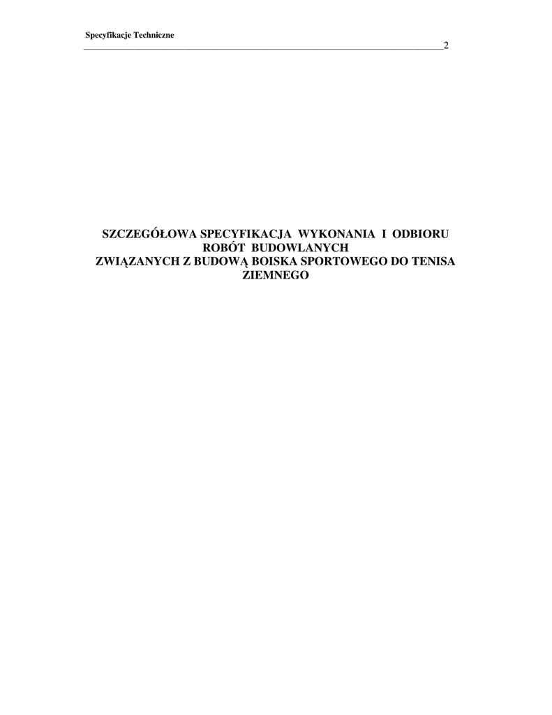 Specyfikacje Techniczne _____________________________________________________________________________________2 SZCZEGÓŁOWA SPECYFIKACJA WYKONANIA I ODBIORU ROBÓT BUDOWLANYCH ZWIĄZANYCH Z BUDOWĄ BOISKA SPORTOWEGO DO TENISA ZIEMNEGO Specyfikacje Techniczne _____________________________________________________________________________________2 SPECYFIKACJA TECHNICZNA WYKONANIA I ODBIORU ROBÓT BUDOWLANYCH opracowana na podstawie rozporządzenia Ministra Infrastruktury z dnia 2 września 2004 r. (Dz.U. Nr 202 poz. 2072) „w sprawie szczegółowego zakresu i formy projektowej, specyfikacji technicznych wykonania i odbioru robót budowlanych oraz programu funkcjonalno-użytkowego” i na podstawie rozporządzenia Komisji (WE) Nr 2151/2003 z dnia 16 grudnia 2003 r. w sprawie „Wspólnego Słownika Zamówień (CPV)” SST-1. Zagospodarowanie terenu, budowa boiska 1. WSTĘP 1.1. Przedmiot i zakres specyfikacji Niniejsza specyfikacja obejmuje wymagania dotyczące wykonania i odbioru robót związanych z zagospodarowaniem terenu i wykonania boiska w ramach inwestycji „Budowa boiska do tenisa ziemnego – działka nr 269, miejscowość Rogowo, pow. Rypin”. Inwestor – Gmina Rogowo, pow. Rypin. 1.2. Określenia podstawowe Określenia podstawowe użyte w niniejszej Specyfikacji Technicznej są zgodne z obowiązującymi (aktualnymi) odpowiednimi normami i określeniami zawartymi w ST-0 „Wymagania ogólne”. 1.3. Klasyfikacja robót wg Wspólnego Słownika Zamówień (CPV) Kod CPV 45212221-1 45111200-0 45112720-8 36400000-5 45342000-6 Opis Roboty budowlane w zakresie budowy boisk sportowych. Roboty w zakresie przygotowania terenu pod budowę i roboty ziemne. Roboty w zakresie kształtowania terenów sportowych i rekreacyjnych. Artykuły i sprzęt sportowy. Wznoszenie ogrodzeń. 1.4. Zakres robót objętych ST Roboty, których dotyczy specyfikacja, obejmują wszystkie czynności umożliwiające i mające na celu wykonanie zagospodarowania terenu i wykonanie boisk w następującym zakresie: • boisko do tenisa ziemnego o wymiarach płyty 10,97 x 23,77 z wyposażeniem. • chodnik, • ogrodzenia boiska tenisa ziemnego, • wyposażenie boiska, • zieleń. 1.5.Prace towarzyszące • • przygotowanie placu budowy i jego likwidacja po zakończeniu prac budowlanych porządkowanie terenu boisk podczas wyjazdu samochodów z placu budowy. Specyfikacje Techniczne _____________________________________________________________________________________3 1.6.Informacja o terenie budowy Działka przeznaczona pod budowę boiska oznaczona numerem 269 stanowi własność Gminy Rogowo i leży w bezpośrednim sąsiedztwie boisk sportowych. Stanowi go teren płaski ze skłonem do istniejącego rowu melioracyjnego. Teren ten jest bez uzbrojenia podziemnego. Posiada wspólny dojazd dla wszystkich boisk sportowych. 1.7. Zabezpieczenie interesów osób trzecich Na czas budowy będzie wykorzystywana tylko działka nr 269. Należy zachować warunki bezpieczeństwa podczas transportu materiałów i urządzeń. Ponadto należy przewidzieć miejsce do składowania materiałów budowlanych. 1.8. Dokumenty odniesienia Dokumenty będące podstawą do wykonania robót budowlanych: • przedmiar robót • projekt budowlany • odpowiednie normy • aprobaty techniczne zastosowanych produktów • warunki Techniczne Wykonania i Odbioru Robót Budowlano-Montażowych 1.9.Określenia podstawowe Określenia podane w niniejszej SST są zgodne z obowiązującymi odpowiednimi normami. 1.10. Ogólne wymagania dotyczące robót Wykonawca robót jest odpowiedzialny za jakość ich wykonania oraz za zgodność robót z dokumentacją projektową, ST, obowiązującymi normami oraz z poleceniami Inspektora nadzoru. 2. MATERIAŁY Wszystkie materiały stosowane do wykonywania robót muszą odpowiadać wymaganiom niniejszej ST, polskim normom, atestom higienicznym dopuszczającym materiał do powszechnego stosowania. Materiałem stosowanym do wykonania robót są: 2.1. Materiały do wykonania boiska sportowego: nawierzchnia z trawy syntetycznej grubości 20 mm, podbudowa systemowa pod nawierzchnie - warstwa dolna wykonana z kamienia łamanego Ø 31,5/61 mm grubość warstwy 15 cm - warstwa górna wykonana z kamienia łamanego Ø 0/31,5 mm lub grubość warstwy 5 cm - warstwa wyrównawcza z miału kamiennego 1-4 mm Dopuszczalne odchyłki: 5mm na odcinku 3 m. • • Nawierzchnia z trawy syntetycznej pełnopiaskowej systemu DOMO SERVICE. Specyfikacje Techniczne _____________________________________________________________________________________4 Trawa syntetyczna winna charakteryzować się następującymi właściwościami: • wysoka estetyka oraz wytrzymałość • odporność na odbarwienia pod wpływem promieni słonecznych • możliwość długotrwałego użytkowania w zróżnicowanych warunków atmosferycznych • zapewnienie użytkownikom odpowiedniego komfortu gry Stosowane trawy syntetyczne powinny posiadać aprobatę ITB. Powierzchnia płyty boiska (w ogrodzeniu) - 685,0 m2 Powierzchnia płyty boiska do gry – 260,76 m2 2.2. Materiały do wykonania chodnika: • kostka betonowa polbruk w kolorze szarym, • obrzeże betonowe, • piasek do wykonania podsypki, • żwir. 2.3. Wyposażenie boisk • • • • słupki do siatki do tenisa, siatka do gry, ławki drewniane na cokole z prefabrykatów żelbetowych dla graczy (w ogrodzeniu), siedziska dla widzów z tworzywa sztucznego (dla widzów). 2.4. Inne elementy uzupełniające • • ogrodzenie stalowe z siatki wysokości 2,5 – 4,0 m z wejściami beton B20 2.5. Zieleń • • nasiona traw, ziemia ogrodnicza do sadzenia. 3. SPRZĘT Roboty związane z zagospodarowaniem terenu i małą architekturą mogą być wykonywane ręcznie lub mechanicznie przy użyciu dowolnego typu sprzętu. 4. TRANSPORT Materiały na budowę powinny być przewożone właściwymi, zalecanymi przez producenta środkami transportu, oraz zgodnie z przepisami BHP i ruchu drogowego. 5. WYKONYWANIE ROBÓT