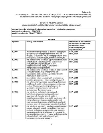 Załącznik do uchwały nr ... Senatu UW z dnia 30 maja 2012 r. w sprawie określenia efektów kształcenia dla kierunku studiów Pedagogika specjalna i edukacja społeczna EFEKTY KSZTAŁCENIA tabela odniesień efektów kierunkowych do efektów obszarowych nazwa kierunku studiów; Pedagogika specjalna i edukacja społeczna poziom kształcenia: I STOPIEŃ profil kształcenia: PRAKTYCZNY Wiedza Symbol Efekty kształcenia K_W01 ma elementarną wiedzę z zakresu pedagogiki specjalnej i pedagogiki społecznej oraz ich miejscu w systemie nauk pedagogicznych oraz powiązaniu z innymi dyscyplinami naukowymi ma podstawową wiedzę o typowych strukturach i instytucjach (edukacyjnych, kulturowych, politycznych) wspierających osoby niepełnosprawne, osoby wykluczone i marginalizowane społecznie ma podstawową wiedzę o relacjach społecznych pomiędzy osobą niepełnosprawną lub wykluczoną społecznie a jej środowiskiem i instytucjami społecznymi zna rodzaje więzi społecznych w zakresie w zakresie pedagogiki i nauk współpracujących ma elementarną wiedzę o psychospołecznych problemach osób z niepełnosprawnością oraz osób wykluczonych i marginalizowanych społecznie oraz uwarunkowaniach ich społecznego funkcjonowania ma wiedzę o metodach, narzędziach i technikach diagnozowania problemów rozwojowych funkcjonalnych osób z niepełnosprawnością oraz osób wykluczonych i marginalizowanych pozwalającą opisywać uwarunkowania procesu rehabilitacji, edukacji i pomocy oraz struktury odpowiednich instytucji. ma wiedzę o normach i regułach organizujących proces edukacji, terapii, rehabilitacji i pomocy osobom z niepełnosprawnością oraz osobom wykluczonym i marginalizowanym społecznie. zna podstawowe normy i reguły funkcjonowania odpowiednich instytucji edukacyjnych, pomocowych i wspierających. K_W02 K_W03 K_W04 K_W05 K_W06 K_W07 1 Odniesienie do efektów kształcenia w obszarze kształcenia nauk humanistycznych i społecznych S1P_W01 H1P_W01 S1P_W02 H1P_W02 S1P_W03 H1P_W03 S1P_W04 S1P_W05 H1P_W02 S1P_W06 S1P_W07 K_W08 K_W09 K_W10 K_W11 K_W12 ma wiedzę o mechanizmach i uwarunkowaniach procesu rehabilitacji, edukacji, wpierania i pomocy osobom z niepełnosprawnością oraz osobom wykluczonym i marginalizowanym społecznie i ich ewolucyjnym i rozwojowym charakterze ma wiedzę o poglądach na mechanizmy i uwarunkowania procesu rehabilitacji, edukacji, wpierania i pomocy osobom z niepełnosprawnością oraz osobom wykluczonym i marginalizowanym społecznie zna i rozumie podstawowe pojęcia i zasady ochrony praw autorskich zna podstawowe zasady i formy tworzenia instytucji edukacyjnych, terapeutycznych, pomocowych i wpierających S1P_W08 ma podstawową wiedzę o bezpieczeństwie i higienie pracy w instytucjach edukacyjnych, kulturalnych, mediach H1P_W09 S1P_W09 S1P_W010 H1P_W10 SP_W011 Umiejętności Symbol Efekty kształcenia K_U01 potrafi prawidłowo interpretować proces edukacji, rehabilitacji, terapii, wpierania i pomocy osobom z niepełnosprawnością oraz osobom wykluczonym i marginalizowanym społecznie, oraz określić jego znaczenie potrafi wykorzystać i integrować wiedzę teoretyczną z zakresu pedagogiki specjalnej i społecznej oraz nauk pokrewnych w celu analizy złożonych problemów, wychowania, kształcenia i wspomagania rozwoju osób z niepełnosprawnością oraz osób wykluczonych i marginalizowanych społecznie potrafi diagnozować i analizować potrzeby oraz proces edukacji, rehabilitacji, terapii, wpierania i pomocy osobom z niepełnosprawnością oraz osobom wykluczonym i marginalizowanym społecznie. potrafi przewidywać praktyczne skutki procesu edukacji, rehabilitacji, terapii, wpierania i pomocy osobom z niepełnosprawnością oraz osobom wykluczonym i marginalizowanym społecznie. umie wykorzystać podstawowe narzędzia do diagnozy i ewaluacji powyższych procesów K_U02 K_U03 K_U04 2 Odniesienie do efektów kształcenia w obszarze kształcenia nauk humanistycznych i społecznych S1P_U01 H1P_U01 S1P_U02 S1P_U03 S1P_U04 K_U05 K_U06 K_U07 K_U08 K_U09 K_U10 K_U11 K_U12 K_U13 K_U14 Symbol K-K01 potrafi posługiwać się systemem klasyfikacji rodzaju stopnia niepełnosprawność oraz normami i regułami systemu edukacji i pomocy w celu projektowania właściwych działań pedagogicznych potrafi wykorzystać zdobytą wiedzę i opanowane umiejętności w czasie praktyki zawodowej posiada umiejętność analizy proponowanego rozwiązania konkretnych problemów edukacyjnych, terapeutycznych i pomocowych, proponuje odpowiednie rozstrzygnięcia w tym zakresie oraz potrafi je wdrożyć posiada umiejętność rozumienia i analizowania zjawisk w procesie edukacji, rehabilitacji, terapii, wpierania i pomocy osobom z niepełnosprawnością oraz osobom wykluczonym i marginalizowanym społecznie. posiada umiejętności przygotowywania prac seminaryjnych, dyplomowych, projektów badawczych z wykorzystaniem podstawowych teorii, terminologii i źródeł z zakresu pedagogiki specjalnej i pedagogiki społecznej posiada umiejętność przygotowania prezentacji ustnych, medialnych z wykorzystaniem podstawowych teorii, terminologii i źródeł z zakresu pedagogiki specjalnej i pedagogiki społecznej ma umiejętności językowe w zakresie pedagogiki specjalnej i pedagogiki społecznej zgodnie z wymaganiami określonymi dla poziomu b2 europejskiego systemu opisu kształcenia językowego posiada umiejętność przygotowania różnych prac pisemnych i ustnych w języku obcym na poziomie B2 wykorzystuje wybrane techniki multimedialne i media w działalności edukacyjnej i zawodowej posiada umiejętność wykorzystania zdobytej podczas praktyki wiedzy zawodowej Kompetencje społeczne Efekty kształcenia ma pogłębioną świadomość wiedzy i umiejętności w zakresie pomocy osobom z niepełnosprawnością oraz osobom wykluczonym i marginalizowanym społecznie. rozumie potrzebę ciągłego rozwoju osobistego i doskonalenia zawodowego 3 S1P_U05 S1P_U06 S1P_U07 S1P_U08 S1P_U09 H1P_U01