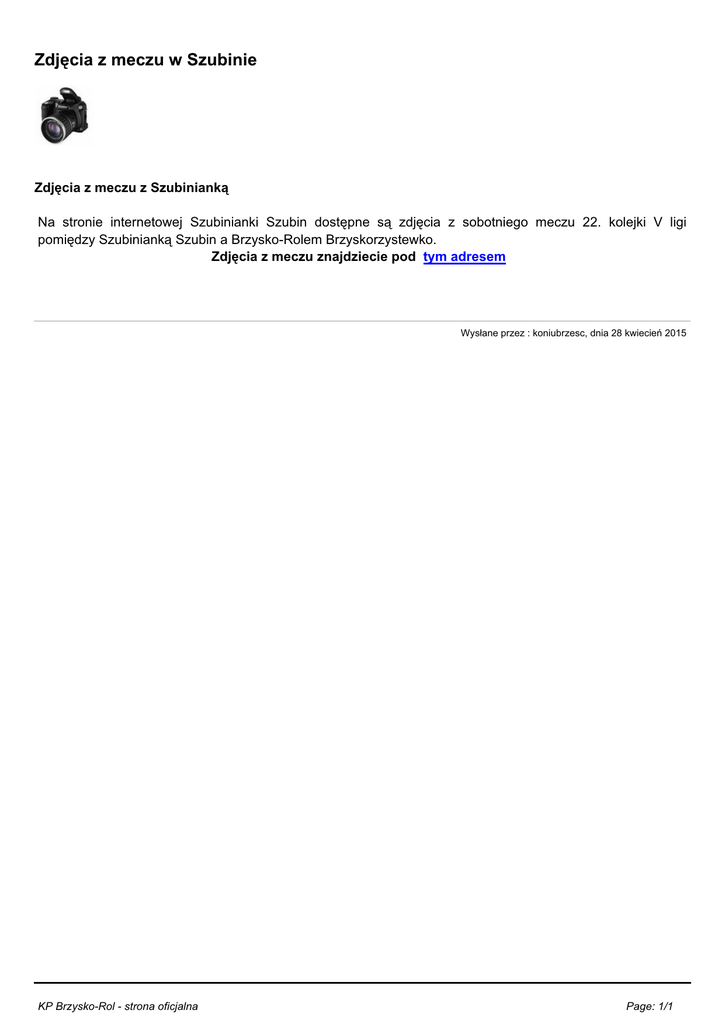 Zdjęcia z meczu w Szubinie Zdjęcia z meczu z Szubinianką Na stronie internetowej Szubinianki Szubin dostępne są zdjęcia z sobotniego meczu 22. kolejki V ligi pomiędzy Szubinianką Szubin a Brzysko-Rolem Brzyskorzystewko. Zdjęcia z meczu znajdziecie pod tym adresem Wysłane przez : koniubrzesc, dnia 28 kwiecień 2015 KP Brzysko-Rol - strona oficjalna Page: 1/1