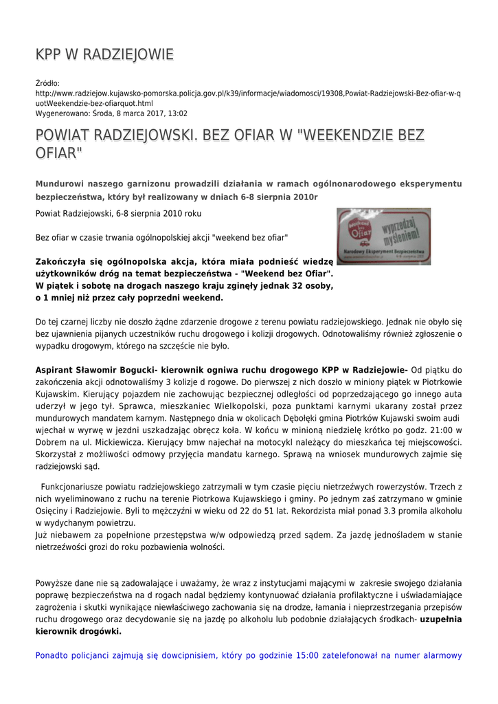 KPP W RADZIEJOWIE Źródło: http://www.radziejow.kujawsko-pomorska.policja.gov.pl/k39/informacje/wiadomosci/19308,Powiat-Radziejowski-Bez-ofiar-w-q uotWeekendzie-bez-ofiarquot.html Wygenerowano: Środa, 8 marca 2017, 13:02 POWIAT RADZIEJOWSKI. BEZ OFIAR W "WEEKENDZIE BEZ OFIAR" Mundurowi naszego garnizonu prowadzili działania w ramach ogólnonarodowego eksperymentu bezpieczeństwa, który był realizowany w dniach 6-8 sierpnia 2010r Powiat Radziejowski, 6-8 sierpnia 2010 roku Bez ofiar w czasie trwania ogólnopolskiej akcji "weekend bez ofiar" Zakończyła się ogólnopolska akcja, która miała podnieść wiedzę użytkowników dróg na temat bezpieczeństwa - "Weekend bez Ofiar". W piątek i sobotę na drogach naszego kraju zginęły jednak 32 osoby, o 1 mniej niż przez cały poprzedni weekend. Do tej czarnej liczby nie doszło żądne zdarzenie drogowe z terenu powiatu radziejowskiego. Jednak nie obyło się bez ujawnienia pijanych uczestników ruchu drogowego i kolizji drogowych. Odnotowaliśmy również zgłoszenie o wypadku drogowym, którego na szczęście nie było. Aspirant Sławomir Bogucki- kierownik ogniwa ruchu drogowego KPP w Radziejowie- Od piątku do zakończenia akcji odnotowaliśmy 3 kolizje d rogowe. Do pierwszej z nich doszło w miniony piątek w Piotrkowie Kujawskim. Kierujący pojazdem nie zachowując bezpiecznej odległości od poprzedzającego go innego auta uderzył w jego tył. Sprawca, mieszkaniec Wielkopolski, poza punktami karnymi ukarany został przez mundurowych mandatem karnym. Następnego dnia w okolicach Dębołęki gmina Piotrków Kujawski swoim audi wjechał w wyrwę w jezdni uszkadzając obręcz koła. W końcu w minioną niedzielę krótko po godz. 21:00 w Dobrem na ul. Mickiewicza. Kierujący bmw najechał na motocykl należący do mieszkańca tej miejscowości. Skorzystał z możliwości odmowy przyjęcia mandatu karnego. Sprawą na wniosek mundurowych zajmie się radziejowski sąd. Funkcjonariusze powiatu radziejowskiego zatrzymali w tym czasie pięciu nietrzeźwych rowerzystów. Trzech z nich wyeliminowano z ruchu na terenie Piotrkowa Kujawskiego i gminy. Po jednym zaś zatrzymano w gminie Osięciny i Radziejowie. Byli to mężczyźni w wieku od 22 do 51 lat. Rekordzista miał ponad 3.3 promila alkoholu w wydychanym powietrzu. Już niebawem za popełnione przestępstwa w/w odpowiedzą przed sądem. Za jazdę jednośladem w stanie nietrzeźwości grozi do roku pozbawienia wolności. Powyższe dane nie są zadowalające i uważamy, że wraz z instytucjami mającymi w zakresie swojego działania poprawę bezpieczeństwa na d rogach nadal będziemy kontynuować działania profilaktyczne i uświadamiające zagrożenia i skutki wynikające niewłaściwego zachowania się na drodze, łamania i nieprzestrzegania przepisów ruchu drogowego oraz decydowanie się na jazdę po alkoholu lub podobnie działających środkach- uzupełnia kierownik drogówki. Ponadto policjanci zajmują się dowcipnisiem, który po godzinie 15:00 zatelefonował na numer alarmowy radziejowskiej Policji informując o rzekomym wypadku drogowym, do którego miało dojść w okolicach Osięcin. Z relacji mężczyzny, dzwoniącego z "komórki" wynikało, że auto osobowe wjechało pod pojazd ciężarowy, a osoby biorące udział w tym zdarzeniu drogowym wymagają pomocy służb medycznych. We wskazane miejsce udał się patrol w celu potwierdzenia zgłoszenia. Jednak zgłoszenie okazało się fałszywe. Wdrożone zostało postępowanie mające na celu ukaranie osoby, która powiadomiła ze złośliwości lub swawoli, wywołując niepotrzebną czynność fałszywym alarmem i informacją czym wprowadziła w błąd Policję, za co grozi kara aresztu, ograniczenia wolności albo grzywny. Autor: red2.kpra Publikacja: red2.kpra Ocena: 0/5 (0) Tweetnij