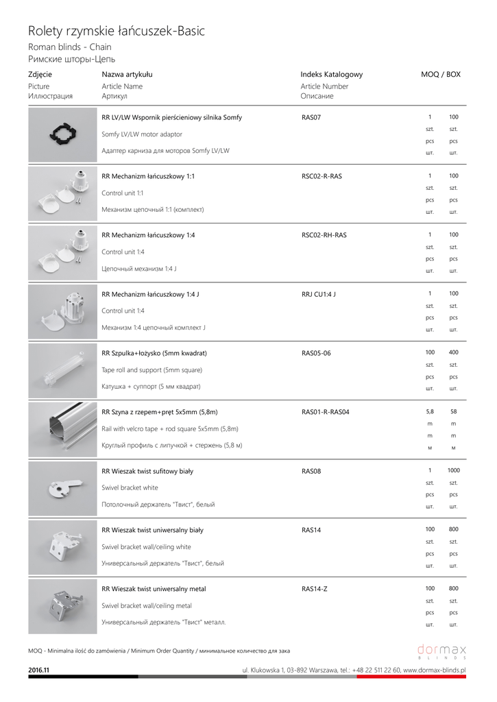 Rolety rzymskie łańcuszek-Basic Roman blinds - Chain Римские шторы-Цепь Zdjęcie Nazwa artykułu Indeks Katalogowy Picture Иллюстрация Article Name Артикул Article Number Описание RR LV/LW Wspornik pierścieniowy silnika Somfy RAS07 Somfy LV/LW motor adaptor Адаптер карниза для моторов Somfy LV/LW RR Mechanizm łańcuszkowy 1:1 RSC02-R-RAS Control unit 1:1 Механизм цепочный 1:1 (комплект) RR Mechanizm łańcuszkowy 1:4 RSC02-RH-RAS Control unit 1:4 Цепочный механизм 1:4 J RR Mechanizm łańcuszkowy 1:4 J RRJ CU1:4 J Control unit 1:4 Механизм 1:4 цепочный комплект J RR Szpulka+łożysko (5mm kwadrat) RAS05-06 Tape roll and support (5mm square) Катушка + суппорт (5 мм квадрат) RR Szyna z rzepem+pręt 5x5mm (5,8m) RAS01-R-RAS04 Rail with velcro tape + rod square 5x5mm (5,8m) Круглый профиль с липучкой + стержень (5,8 м) RR Wieszak twist sufitowy biały RAS08 Swivel bracket white Потолочный держатель "Твист", белый RR Wieszak twist uniwersalny biały RAS14 Swivel bracket wall/ceiling white Универсальный держатель "Твист", белый RR Wieszak twist uniwersalny metal RAS14-Z Swivel bracket wall/ceiling metal Универсальный держатель "Твист" металл. MOQ / BOX 1 100 szt. szt. pcs pcs шт. шт. 1 100 szt. szt. pcs pcs шт. шт. 1 100 szt. szt. pcs pcs шт. шт. 1 100 szt. szt. pcs pcs шт. шт. 100 400 szt. szt. pcs pcs шт. шт. 5,8 58 m m m m м м 1 1000 szt. szt. pcs pcs шт. шт. 100 800 szt. szt. pcs pcs шт. шт. 100 800 szt. szt. pcs pcs шт. шт. MOQ - Minimalna ilość do zamówienia / Minimum Order Quantity / минимальное количество для зака 2016.11 ul. Klukowska 1, 03-892 Warszawa, tel.: +48 22 511 22 60, www.dormax-blinds.pl Rolety rzymskie łańcuszek-Basic Roman blinds - Chain Римские шторы-Цепь Zdjęcie Nazwa artykułu Indeks Katalogowy Picture Иллюстрация Article Name Артикул Article Number Описание RR Zaślepka szyny RAS03-R End cap for rail Заглушка карниза RRO Hamulec (5mm kwadrat) 712F668 Spindle stop (5mm square) Тормозной механизм (5 мм квадрат) RR RRO Mechanizm łańcuszkowy 1:1 RSC02-R-RAS-O Control unit 1:1 Механизм 1:1 цепочный комплект RRO Mechanizm łańcuszkowy 1:2 WŻ RAS02-R1-2-O Control unit 1:2 Цепочный механизм 1:2 RRO Mechanizm łańcuszkowy 1:4 RSC02-RH-RAS-O Control unit 1:4 Цепочный механизм 1:4 RRO Szpulka+łożysko (5mm kwadrat) RAS05-06-O Tape roll and support (5mm square) Катушка + суппорт (5 мм квадрат) RRO Szyna z rzepem+pręt 5x5mm (5,8m) RAS01-R-O-RAS04 Rail with velcro tape + rod square 5x5mm (5,8m) Карниз с липучкой + стержень 5x5 мм (5,8 м) RRO Zaślepka szyny RAS03-R-O End cap for rail Заглушка карниза MOQ / BOX 1 500 szt. szt. pcs pcs шт. шт. 1 100 szt. szt. pcs pcs шт. шт. 1 100 szt. szt. pcs pcs шт. шт. 1 100 szt. szt. pcs pcs шт. шт. 1 100 szt. szt. pcs pcs шт. шт. 100 400 szt. szt. pcs pcs шт. шт. 5,8 58 m m m m м м 1 500 szt. szt. pcs pcs шт. шт. MOQ - Minimalna ilość do zamówienia / Minimum Order Quantity / минимальное количество для зака 2016.11 ul. Klukowska 1, 03-892 Warszawa, tel.: +48 22 511 22 60, www.dormax-blinds.pl