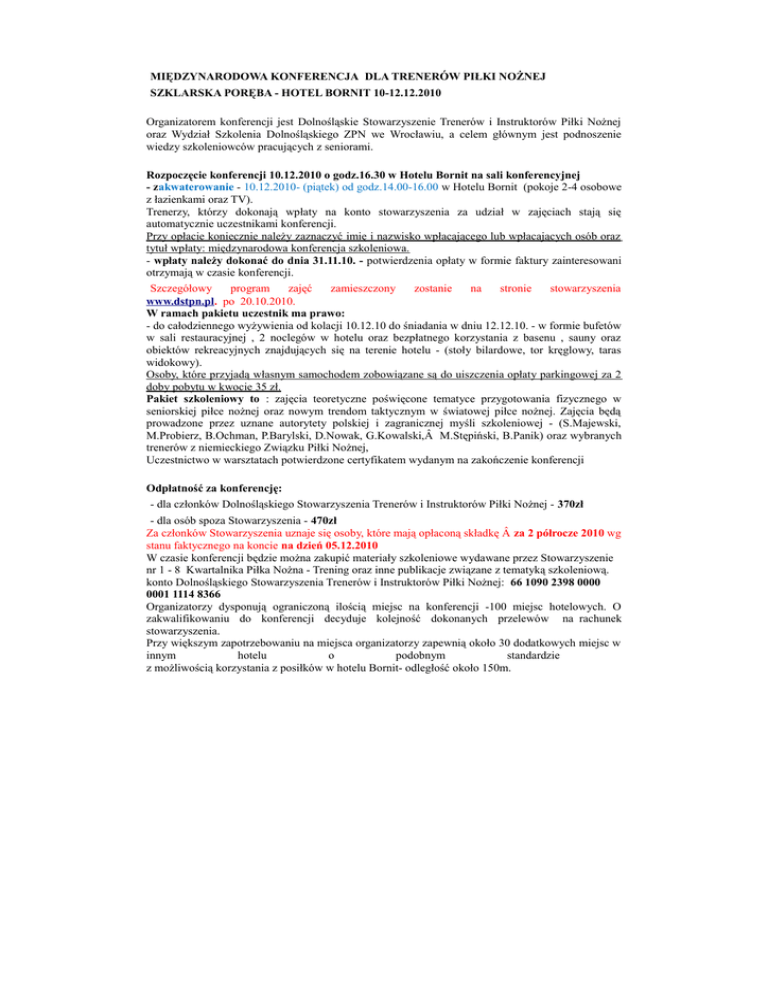 MIĘDZYNARODOWA KONFERENCJA DLA TRENERÓW PIŁKI NOŻNEJ SZKLARSKA PORĘBA - HOTEL BORNIT 10-12.12.2010 Organizatorem konferencji jest Dolnośląskie Stowarzyszenie Trenerów i Instruktorów Piłki Nożnej oraz Wydział Szkolenia Dolnośląskiego ZPN we Wrocławiu, a celem głównym jest podnoszenie wiedzy szkoleniowców pracujących z seniorami. Rozpoczęcie konferencji 10.12.2010 o godz.16.30 w Hotelu Bornit na sali konferencyjnej - zakwaterowanie - 10.12.2010- (piątek) od godz.14.00-16.00 w Hotelu Bornit (pokoje 2-4 osobowe z łazienkami oraz TV). Trenerzy, którzy dokonają wpłaty na konto stowarzyszenia za udział w zajęciach stają się automatycznie uczestnikami konferencji. Przy opłacie koniecznie należy zaznaczyć imię i nazwisko wpłacającego lub wpłacających osób oraz tytuł wpłaty: międzynarodowa konferencja szkoleniowa. - wpłaty należy dokonać do dnia 31.11.10. - potwierdzenia opłaty w formie faktury zainteresowani otrzymają w czasie konferencji. Szczegółowy program zajęć zamieszczony zostanie na stronie stowarzyszenia www.dstpn.pl. po 20.10.2010. W ramach pakietu uczestnik ma prawo: - do całodziennego wyżywienia od kolacji 10.12.10 do śniadania w dniu 12.12.10. - w formie bufetów w sali restauracyjnej , 2 noclegów w hotelu oraz bezpłatnego korzystania z basenu , sauny oraz obiektów rekreacyjnych znajdujących się na terenie hotelu - (stoły bilardowe, tor kręglowy, taras widokowy). Osoby, które przyjadą własnym samochodem zobowiązane są do uiszczenia opłaty parkingowej za 2 doby pobytu w kwocie 35 zł. Pakiet szkoleniowy to : zajęcia teoretyczne poświęcone tematyce przygotowania fizycznego w seniorskiej piłce nożnej oraz nowym trendom taktycznym w światowej piłce nożnej. Zajęcia będą prowadzone przez uznane autorytety polskiej i zagranicznej myśli szkoleniowej - (S.Majewski, M.Probierz, B.Ochman, P.Barylski, D.Nowak, G.Kowalski, M.Stępiński, B.Panik) oraz wybranych trenerów z niemieckiego Związku Piłki Nożnej, Uczestnictwo w warsztatach potwierdzone certyfikatem wydanym na zakończenie konferencji Odpłatność za konferencję: - dla członków Dolnośląskiego Stowarzyszenia Trenerów i Instruktorów Piłki Nożnej - 370zł - dla osób spoza Stowarzyszenia - 470zł Za członków Stowarzyszenia uznaje się osoby, które mają opłaconą składkę  za 2 półrocze 2010 wg stanu faktycznego na koncie na dzień 05.12.2010 W czasie konferencji będzie można zakupić materiały szkoleniowe wydawane przez Stowarzyszenie nr 1 - 8 Kwartalnika Piłka Nożna - Trening oraz inne publikacje związane z tematyką szkoleniową. konto Dolnośląskiego Stowarzyszenia Trenerów i Instruktorów Piłki Nożnej: 66 1090 2398 0000 0001 1114 8366 Organizatorzy dysponują ograniczoną ilością miejsc na konferencji -100 miejsc hotelowych. O zakwalifikowaniu do konferencji decyduje kolejność dokonanych przelewów na rachunek stowarzyszenia. Przy większym zapotrzebowaniu na miejsca organizatorzy zapewnią około 30 dodatkowych miejsc w innym hotelu o podobnym standardzie z możliwością korzystania z posiłków w hotelu Bornit- odległość około 150m.