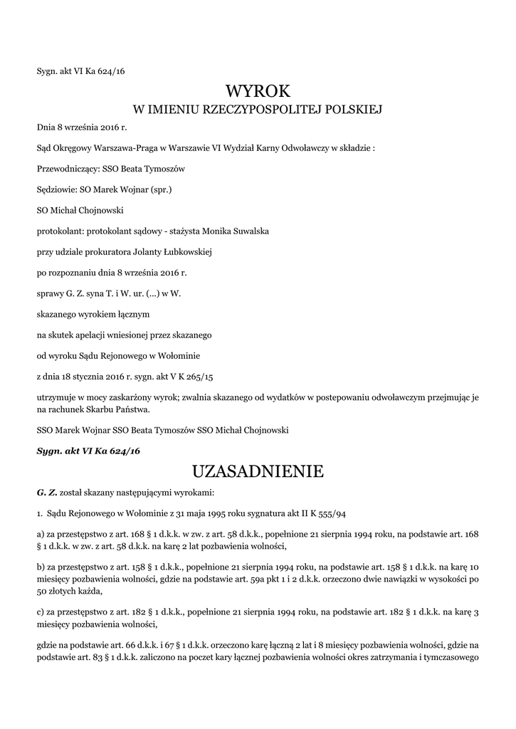 Sygn. akt VI Ka 624/16 WYROK W IMIENIU RZECZYPOSPOLITEJ POLSKIEJ Dnia 8 września 2016 r. Sąd Okręgowy Warszawa-Praga w Warszawie VI Wydział Karny Odwoławczy w składzie : Przewodniczący: SSO Beata Tymoszów Sędziowie: SO Marek Wojnar (spr.) SO Michał Chojnowski protokolant: protokolant sądowy - stażysta Monika Suwalska przy udziale prokuratora Jolanty Łubkowskiej po rozpoznaniu dnia 8 września 2016 r. sprawy G. Z. syna T. i W. ur. (...) w W. skazanego wyrokiem łącznym na skutek apelacji wniesionej przez skazanego od wyroku Sądu Rejonowego w Wołominie z dnia 18 stycznia 2016 r. sygn. akt V K 265/15 utrzymuje w mocy zaskarżony wyrok; zwalnia skazanego od wydatków w postepowaniu odwoławczym przejmując je na rachunek Skarbu Państwa. SSO Marek Wojnar SSO Beata Tymoszów SSO Michał Chojnowski Sygn. akt VI Ka 624/16 UZASADNIENIE G. Z. został skazany następującymi wyrokami: 1. Sądu Rejonowego w Wołominie z 31 maja 1995 roku sygnatura akt II K 555/94 a) za przestępstwo z art. 168 § 1 d.k.k. w zw. z art. 58 d.k.k., popełnione 21 sierpnia 1994 roku, na podstawie art. 168 § 1 d.k.k. w zw. z art. 58 d.k.k. na karę 2 lat pozbawienia wolności, b) za przestępstwo z art. 158 § 1 d.k.k., popełnione 21 sierpnia 1994 roku, na podstawie art. 158 § 1 d.k.k. na karę 10 miesięcy pozbawienia wolności, gdzie na podstawie art. 59a pkt 1 i 2 d.k.k. orzeczono dwie nawiązki w wysokości po 50 złotych każda, c) za przestępstwo z art. 182 § 1 d.k.k., popełnione 21 sierpnia 1994 roku, na podstawie art. 182 § 1 d.k.k. na karę 3 miesięcy pozbawienia wolności, gdzie na podstawie art. 66 d.k.k. i 67 § 1 d.k.k. orzeczono karę łączną 2 lat i 8 miesięcy pozbawienia wolności, gdzie na podstawie art. 83 § 1 d.k.k. zaliczono na poczet kary łącznej pozbawienia wolności okres zatrzymania i tymczasowego aresztowania od 22 sierpnia 1994 roku do 31 maja 1995 roku, gdzie postanowieniem Sądu Wojewódzkiego w Warszawie z 27 lipca 1995 roku (XI Wz 1028/95) warunkowo przedterminowo zwolniono skazanego z odbycia reszty kary, a następnie postanowieniem Sądu Wojewódzkiego w Warszawie z 17 lutego 1997 roku (XI Kow/OWZ 41/97), odwołano warunkowe przedterminowe zwolnienie z części dotyczącej reszty nieodbytej kary, 2. Sądu Rejonowego w Wołominie z 14 czerwca 1996 roku sygnatura akt II K 217/96 a) za przestępstwo z art. 210 § 1 d.k.k. w zw. z art. 60 § 1 d.k.k., popełnione 26 września 1995 roku, na podstawie art. 210 § 11 d.k.k. w zw. z art. 60 § 1 d.k.k. w zw. z 36 § 2 i 3 d.k.k na karę 2 lat pozbawienia wolności i 200 złotych grzywny, b) za przestępstwo z art. 11 § 1 d.k.k. w zw. z art. 208 d.k.k., popełnione 26 września 1995 roku, na podstawie art. 208 d.k.k. w zw. z art. 11 § 1 d.k.k. w zw. z art. 36 § 2 i 3 d.k.k. na karę roku i 6 miesięcy pozbawienia wolności i 200 złotych grzywny, gdzie na podstawie art. 66 d.k.k., 67 § 1 d.k.k. i 70 § 1 d.k.k. orzeczono karę łączną 2 lat i 8 miesięcy pozbawienia wolności oraz karę łączną 300 złotych grzywny, a na podstawie art. 83 § 1 d.k.k. zaliczono na poczet kary łącznej pozbawienia wolności okres tymczasowego aresztowania od 26 września 1995 roku do 14 czerwca 1996 roku, gdzie postanowieniem Sądu Wojewódzkiego we Włocławku z 17 grudnia 1996 roku (III Wz 790/96) warunkowo przedterminowo zwolniono skazanego z odbycia reszty kary, a zarządzeniem Prezesa Sądu Rejonowego w Wołominie z 13 maja 1998 roku (II K 217/96) umorzono zaległe należności sądowe w postaci orzeczonej grzywny w wysokości 300 złotych, gdzie następnie postanowieniem Sądu Wojewódzkiego w Warszawie z 15 kwietnia 1998 roku (XI Kow/OWZ 210/98) odwołano warunkowe przedterminowe zwolnienie z części dotyczącej reszty nieodbytej kary, a postanowieniem Sądu Rejonowego w Wołominie z 18 grudnia 1998 roku (II K 217/96) zaliczono skazanemu okres odbytej kary pozbawienia wolności od 26 września 1995 roku do 20 grudnia 1996 roku, a następnie postanowieniem Sądu Rejonowego w Wołominie z 29 grudnia 1998 roku zamieniono karę roku i 6 miesięcy pozbawienia wolności na karę aresztu w wymiarze 30 dni, a na poczet kary 30 dni aresztu zaliczono okres tymczasowego aresztowania od 26 września 1995 roku do 26 października 1995 roku i tę karę uznano za wykonaną oraz rozwiązano karę łączną 2 lat i 8 miesięcy pozbawienia wolności oraz karę łączną 300 złotych grzywny, a na podstawie art. 46 d.k.w. i art. 4 § 4 d.k.k. orzeczono zatracie skazania za czyn określony w art. 11 § 1 d.k.k. w zw. z art. 208 d.k.k. stanowiący wykroczenie z art. 119 § 1 d.k.w., 3. Sądu Rejonowego w Wołominie z 21 stycznia 1998 roku sygnatura akt II K 242/97 za przestępstwo z art. 210 § 1 d.k.k. w zw. z art. 60 § 2 d.k.k., popełnione 8 marca 1997 roku, na podstawie art. 210 § 11 d.k.k. w zw. z art. 36 § 2 i 3 d.k.k. i art. 60 § 2 k.k. na karę 2 lat pozbawienia wolności i 200 złotych grzywny, gdzie na podstawie art. 83 § 1 d.k.k. zaliczono na poczet kary pozbawienia wolności okres zatrzymania i tymczasowego aresztowania od 9 marca 1997 roku do 21 stycznia 1998 roku, gdzie postanowieniem Sądu Rejonowego w Wołominie z 23 stycznia 1998 roku (II K 242/97) sprostowano oczywistą omyłkę w obliczeniu okresu zaliczenia na poczet orzeczonej kary pozbawienia wolności tymczasowego aresztowania, uznając, jako termin końcowy 19 czerwca 1997 roku, gdzie następnie postanowieniem Sądu Rejonowego w Wołominie z 23 kwietnia 1998 roku (II K 242/97) sprostowano postanowienie Sądu Rejonowego w Wołominie z 23 stycznia 1998 roku (II K 242/97) i zaliczono skazanemu na poczet orzeczonej kary 2 lat pozbawienia wolności okres tymczasowego aresztowania od 9 marca 1997 roku do 20 czerwca 1997 roku, gdzie następnie postanowieniem Sądu Okręgowego w Radomiu z 19 grudnia 2002 roku warunkowo przedterminowo zwolniono skazanego z odbycia reszty kary pozbawienia wolności, 4. Sądu Rejonowego w Radomiu z 25 września 2002 roku sygnatura akt VII 