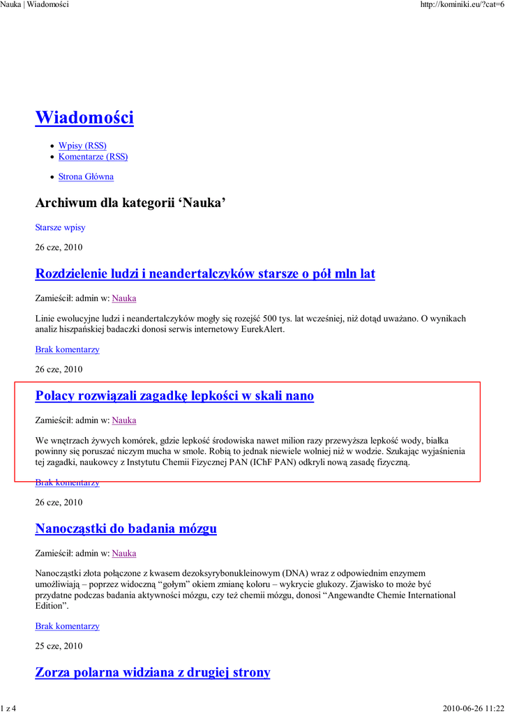Nauka | Wiadomości 1z4 http://kominiki.eu/?cat=6 Wpisy (RSS) Komentarze (RSS) Strona Główna Starsze wpisy 26 cze, 2010 Zamieścił: admin w: Nauka Linie ewolucyjne ludzi i neandertalczyków mogły się rozejść 500 tys. lat wcześniej, niż dotąd uważano. O wynikach analiz hiszpańskiej badaczki donosi serwis internetowy EurekAlert. Brak komentarzy 26 cze, 2010 Zamieścił: admin w: Nauka We wnętrzach żywych komórek, gdzie lepkość środowiska nawet milion razy przewyższa lepkość wody, białka powinny się poruszać niczym mucha w smole. Robią to jednak niewiele wolniej niż w wodzie. Szukając wyjaśnienia tej zagadki, naukowcy z Instytutu Chemii Fizycznej PAN (IChF PAN) odkryli nową zasadę fizyczną. Brak komentarzy 26 cze, 2010 Zamieścił: admin w: Nauka Nanocząstki złota połączone z kwasem dezoksyrybonukleinowym (DNA) wraz z odpowiednim enzymem umożliwiają – poprzez widoczną “gołym” okiem zmianę koloru – wykrycie glukozy. Zjawisko to może być przydatne podczas badania aktywności mózgu, czy też chemii mózgu, donosi “Angewandte Chemie International Edition”. Brak komentarzy 25 cze, 2010 2010-06-26 11:22