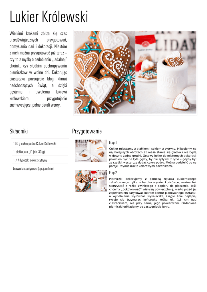 Powered by TCPDF (www.tcpdf.org) Lukier Królewski Wielkimi krokami zbliża się czas przedświątecznych przygotowań, obmyślania dań i dekoracji. Niektóre z nich można przygotować już teraz – czy to z myślą o ozdobieniu „jadalnej” choinki, czy słodkim pochrupywaniu pierniczków w wolne dni. Dekorując ciasteczka poczujecie błogi klimat nadchodzących Świąt, a dzięki gęstemu i trwałemu lukrowi królewskiemu przygotujecie zachwycające, pełne detali wzory. Składniki 150 g cukru pudru Cukier Królewski 1 białko jaja „L” (ok. 33 g) 1 / 4 łyżeczki soku z cytryny barwniki spożywcze (opcjonalnie) Przygotowanie Etap 1 Cukier mieszamy z białkiem i sokiem z cytryny. Miksujemy na najmniejszych obrotach aż masa stanie się gładka i nie będą widoczne żadne grudki. Gotowy lukier do misternych dekoracji powinien być na tyle gęsty, by nie spływał z łyżki – gdyby był za rzadki, wystarczy dodać cukru pudru. Można podzielić go na porcje i wymieszać z kolorowymi barwnikami. Etap 2 Pierniczki dekorujemy z pomocą rękawa cukierniczego zakończonego tylką o bardzo wąskiej końcówce, można też skorzystać z rożka zwiniętego z papieru do pieczenia. Jeśli chcemy „pokolorować” większą powierzchnię, warto przed jej zapełnieniem zarysować lukrem kontur planowanego kształtu, a wypełnienie wyrównać wykałaczką. Ciągłe linie najlepiej rysuje się trzymając końcówkę rożka ok. 1,5 cm nad ciasteczkiem, nie przy samej jego powierzchni. Ozdobione pierniczki odkładamy do zastygnięcia lukru.