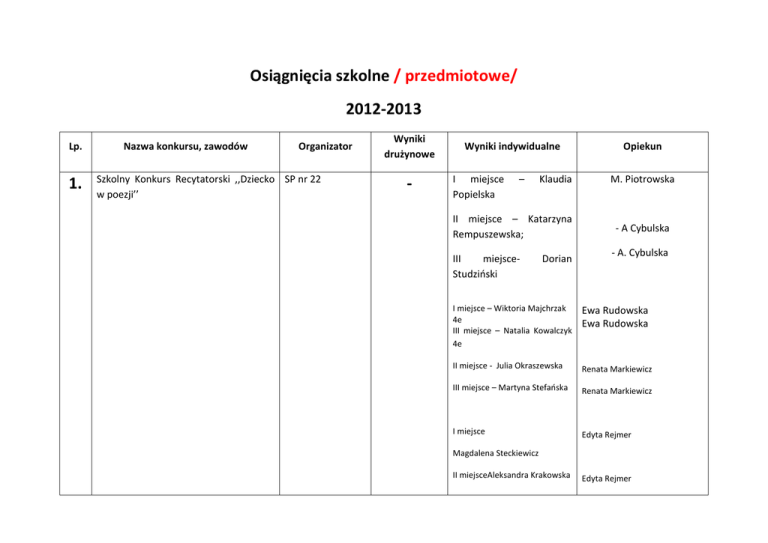 Osiągnięcia szkolne / przedmiotowe/ 2012-2013 Lp. 1. Nazwa konkursu, zawodów Organizator Szkolny Konkurs Recytatorski ,,Dziecko SP nr 22 w poezji’’ Wyniki drużynowe - Wyniki indywidualne I miejsce Popielska – Klaudia II miejsce – Katarzyna Rempuszewska; III miejsceStudziński Dorian Opiekun M. Piotrowska - A Cybulska - A. Cybulska I miejsce – Wiktoria Majchrzak 4e III miejsce – Natalia Kowalczyk 4e Ewa Rudowska Ewa Rudowska II miejsce - Julia Okraszewska Renata Markiewicz III miejsce – Martyna Stefańska Renata Markiewicz I miejsce Edyta Rejmer Magdalena Steckiewicz II miejsceAleksandra Krakowska Edyta Rejmer 2. XI edycja Powiatowego Konkursu Literackiego pod patronatem Książnicy Płockiej ,,Piszę książkę’’ SP nr 22 - Wyróżnienie –Jakub Gałecki. Wyróżnienie- Natalia Gawinek 4e II miejsce – Aleksander Krom - 3. Szkolny Konkurs Literacko- Plastyczny na Najpiękniejszą Kartę i Życzenia Bożonarodzeniowe. SP nr 22 Wyróżnienie – Izabela Lewandowska Wyróżnienie - Agata Fighiera I miejsce – Julia Taborek II miejsce – Mikołaj Jędrak II miejsce – Maciej Markiewicz III miejsce – Jakub Pszczółkowski III miejsce – Zuzanna Bieńkowska Wyróżnienie – Patryk Litwin Wyróżnienie: Zuzanna A. Cybulska Ewa Rudowska M. Piotrowska A. Sosnowska B. Sokolnicka B. Solokolnicka A. Cybulska B. Sokolnicka A.Cybulska B. Sokolnicka A. Cybulska B. Sokolnicka Kamińska Wyróżnienie – Klaudia Popielska M. Piotrowska I miejsce w szkole: Julia Mosakowska Ogólnopolski Konkurs Polonistyczny „Fraszka” etap szkolny Małgorzata Piotrowska Wyróżnienia: Julia Ners A.Cybulska Zuzanna Tokarska R. Markiewicz Martyna Stefańska R. Markiewicz Julia Kołodziejska R. Markiewicz M. Piotrowska Julia Walczak A. Sosnowska Martyna Prusińska Klaudia Szrajber Mikołaj Mikołajewski Aleksandra Domagała Justyna Matacz Oskar Jarębski Edyta Rejmer Alicja Grabowska Anna Lemańska Ogólnopolska Olimpiada Polonistyczna ,,Olimpus’’ Olimpus Warszawa KLASA 4. Edyta Rejmer Alicja Gogół XIII miejsce laureat Edyta Rejmer Patrycja Jaworek XIII laureat Edyta Rejmer Weronika Goździk XV laureat Edyta Rejmer Filip Sosnowski XVII Edyta Rejmer Alicja Stawicka XVII Edyta Rejmer Aleksandra Kowalska XIX Alicja Zdun Edyta Rejmer Edyta Rejmer Dominika Lenczewska Ewa Rudowska Laureat XII miejsca- Natalia Gawinek 4e Laureat XII miejsca- Karol Pius 4e Ewa Rudowska Ewa Rudowska Ewa Rudowska Laureat XIII miejsca- Martyna Szeligowska 4e Ewa Rudowska Mateusz Kwiatkowski 4e XVI Ewa Rudowska Michał Szulborski 4e XVIII Ewa Rudowska Bartosz Rutkowski 4e XXII Anna Choroszewska 4e XXVIII Agata Fighiera 4c X B. Sokolnicka Julia Mielcarek 4d XIV B. Sokolnicka Oliwia Ogończyk Mąkowska 4d XIV B. Sokolnicka B. Sokolnicka Bartosz Ziółek 4c XIV Alicja Sieczkowska 4d Aleksandra Dębska 4c XVI B. Sokolnicka B. Sokolnicka KLASA 5. Martyna Stefańska-18 m Julia Kołodziejska 18 m-ce Zuzanna Piłat-16 m-ce Zuzanna Tokarska 19 m-ce Oliwia Wiktorowska 20 Wiktor Budek 20 Joanna Krasnopolska 21 Magdalena Tyszka 22 R. Markiewicz R. Markiewicz R. Markiewicz Maja Kołodziejska 22 R. Markiewicz Oliwia Drozdowska 22 R. Markiewicz Emilia Mendrala 22 R. Markiewicz Aleksandra Świder 29 R. Markiewicz R. Markiewicz Dominika Ronek – VIII miejsce , laureat Klaudia Popielska – X miejsce, laureat R. Markiewicz R. Markiewicz R. Markiewicz Weronika Siebierska – XIV miejsce, laureat Aleksander Krom – XVII miejsce Maciej Markiewicz – XVII miejsce A. Sosnowska M. Piotrowska M. Piotrowska Zuzanna Bieńkowska – XVII miejsce M. Piotrowska KLASA 6. B. Sokolnicka Julia Ners XIV laureat B. Sokolnicka Justyna Matacz XIV laureat Julia Piotrowska XV laureat Oskar Jarębski XVI miejsce Anna Lemańska XX miejsce A. Cybulska Edyta Rejmer Klaudia Szrajber – XIII miejsce, laureat Andżelika Kostewicz – XVIII miejsce Aleksandra Domagała – XVIII Edyta Rejmer Edyta Rejmer Edyta Rejmer A. Sosnowska Piotr Ruciński – XIX miejsce Julia Mosakowska – XIII miejsce, laureat Michał Rączkowski – XVII miejsce A. Sosnowska A. Sosnowska A. Sosnowska M. Piotrowska M. Piotrowska 4. Miejsce i rola rodziny na przełomie wieków Akcja Katolicka Diecezji Płockiej - I miejsce - Patrycja Patentas 6. Międzyszkolny Konkurs „ŚmieciMY” Stowarzyszenie Gmin Turystycznych Pojezierza Gostynińskiego - I miejsce – Alan Mikosza II miejsce - Agata Marczak III miejsce - Jakub Jasiński Ks. Adam Milewski Halina Mielcarek Ewa Kucharska Ewa Kucharska 7. Międzyszkolny Konkurs „Na tropie podstępnych używek” 8. Ogólnopolska Olimpiada Olimpus sesja jesienna 2012 – język angielski 9. 10. SP nr 22 Olimpus Kuratoryjny Konkurs Matematyczny MKO Ogólnopolski Konkurs Przedmiotowy EDI EDI „Biblia i przypowieści biblijne” - II miejsce Martyna Prusińska, Kaja Brzezińska Klasa IV: IV miejsce Alicja Sieczkowska VIII miejsce Bartosz Ziółek XVI miejsce Agata Fighiera XVII miejsce Dawid Zalech XVII miejsce Kaja Kraśniewska XVII miejsce Natalia Kowalczyk XX miejsce Szymon Dembowski XX miejsce Lessnau Klaudia XX miejsce Zuzanna Dobaczewska Klasa V: XIII miejsce Dominika Ronek XVII miejsce Jan Czerwiński XVII Zuzanna Bieńkowska XX miejsce Klaudia Popielska Klasa VI: XIII miejsce Aleksandra Kozicińska XV miejsce Ruciński Piotr XV miejsce Tomasz Tomaszewski - Ewa Kucharska Joanna Omińska Anna Bielińska Anna Bielińska Anna Bielińska Anna Bielińska Anna Bielińska Anna Bielińska Marlena Błachowicz Anna Bielińska Joanna Omińska Monika Krystek Andżelika Łuciakiewicz Monika Krystek Anna Bielińska Anna Bielińska Anna Bielińska Filip Kulas kl. 6f – zakwalifikował się do etapu rejonowego Alicja Sojka XV miejsce- Grabowska Alicja6e Anna Zdrojewska XXI miejsce- Druś Patryk-6d 11. „Janusz Korczak – wielki przyjaciel dzieci” Konkurs interdyscyplinarny dla uczniów szkół podstawowych województwa mazowieckiego powołany przez Mazowieckiego Kuratora Oświaty OEIiZK Warszawa Tytuł laureata 12. Międzyszkolny Konkurs Informatyc
