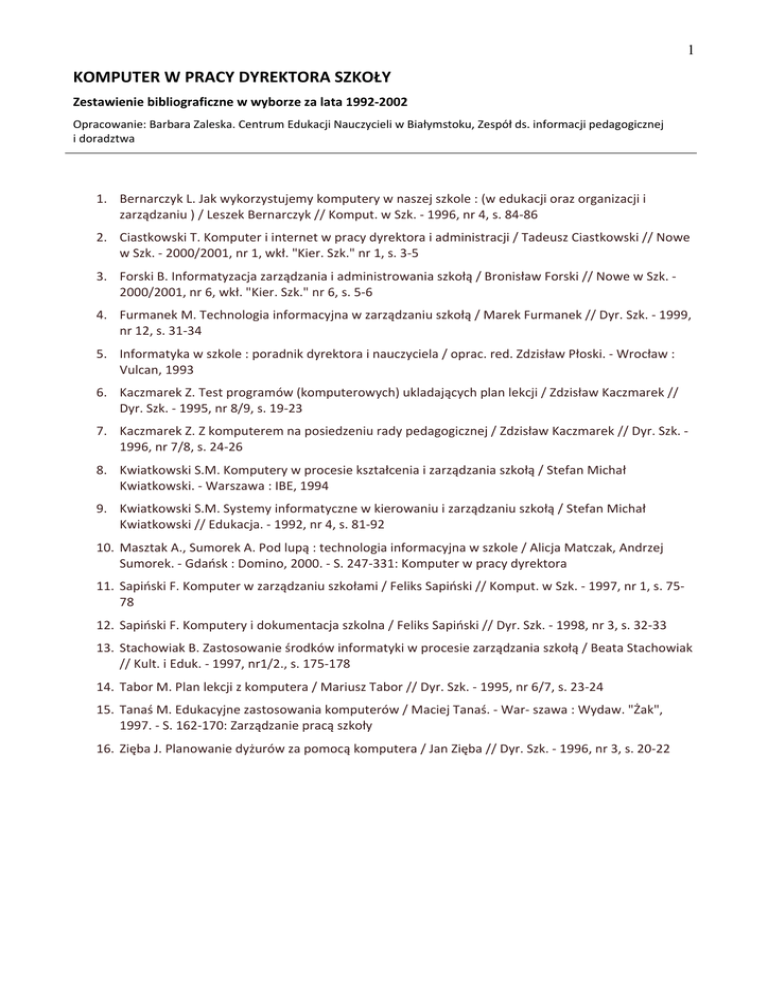 1 KOMPUTER W PRACY DYREKTORA SZKOŁY Zestawienie bibliograficzne w wyborze za lata 1992-2002 Opracowanie: Barbara Zaleska. Centrum Edukacji Nauczycieli w Białymstoku, Zespół ds. informacji pedagogicznej i doradztwa 1. Bernarczyk L. Jak wykorzystujemy komputery w naszej szkole : (w edukacji oraz organizacji i zarządzaniu ) / Leszek Bernarczyk // Komput. w Szk. - 1996, nr 4, s. 84-86 2. Ciastkowski T. Komputer i internet w pracy dyrektora i administracji / Tadeusz Ciastkowski // Nowe w Szk. - 2000/2001, nr 1, wkł. "Kier. Szk." nr 1, s. 3-5 3. Forski B. Informatyzacja zarządzania i administrowania szkołą / Bronisław Forski // Nowe w Szk. 2000/2001, nr 6, wkł. "Kier. Szk." nr 6, s. 5-6 4. Furmanek M. Technologia informacyjna w zarządzaniu szkołą / Marek Furmanek // Dyr. Szk. - 1999, nr 12, s. 31-34 5. Informatyka w szkole : poradnik dyrektora i nauczyciela / oprac. red. Zdzisław Płoski. - Wrocław : Vulcan, 1993 6. Kaczmarek Z. Test programów (komputerowych) ukladających plan lekcji / Zdzisław Kaczmarek // Dyr. Szk. - 1995, nr 8/9, s. 19-23 7. Kaczmarek Z. Z komputerem na posiedzeniu rady pedagogicznej / Zdzisław Kaczmarek // Dyr. Szk. 1996, nr 7/8, s. 24-26 8. Kwiatkowski S.M. Komputery w procesie kształcenia i zarządzania szkołą / Stefan Michał Kwiatkowski. - Warszawa : IBE, 1994 9. Kwiatkowski S.M. Systemy informatyczne w kierowaniu i zarządzaniu szkołą / Stefan Michał Kwiatkowski // Edukacja. - 1992, nr 4, s. 81-92 10. Masztak A., Sumorek A. Pod lupą : technologia informacyjna w szkole / Alicja Matczak, Andrzej Sumorek. - Gdańsk : Domino, 2000. - S. 247-331: Komputer w pracy dyrektora 11. Sapiński F. Komputer w zarządzaniu szkołami / Feliks Sapiński // Komput. w Szk. - 1997, nr 1, s. 7578 12. Sapiński F. Komputery i dokumentacja szkolna / Feliks Sapiński // Dyr. Szk. - 1998, nr 3, s. 32-33 13. Stachowiak B. Zastosowanie środków informatyki w procesie zarządzania szkołą / Beata Stachowiak // Kult. i Eduk. - 1997, nr1/2., s. 175-178 14. Tabor M. Plan lekcji z komputera / Mariusz Tabor // Dyr. Szk. - 1995, nr 6/7, s. 23-24 15. Tanaś M. Edukacyjne zastosowania komputerów / Maciej Tanaś. - War- szawa : Wydaw. "Żak", 1997. - S. 162-170: Zarządzanie pracą szkoły 16. Zięba J. Planowanie dyżurów za pomocą komputera / Jan Zięba // Dyr. Szk. - 1996, nr 3, s. 20-22