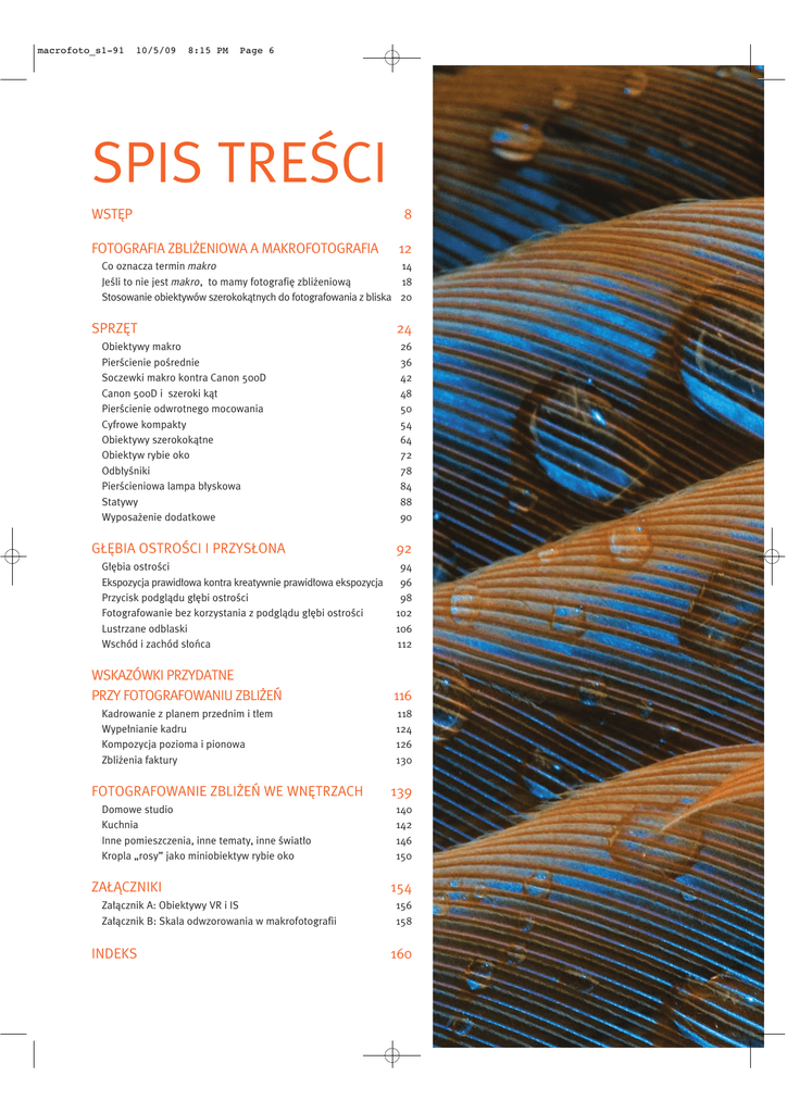 macrofoto_s1-91 10/5/09 8:15 PM Page 6 SPIS TREÂCI WST¢P FOTOGRAFIA ZBLI˚ENIOWA A MAKROFOTOGRAFIA 8 12 Co oznacza termin makro 14 JeÊli to nie jest makro, to mamy fotografi´ zbli˝eniowà 18 Stosowanie obiektywów szerokokàtnych do fotografowania z bliska 20 SPRZ¢T Obiektywy makro PierÊcienie poÊrednie Soczewki makro kontra Canon 500D Canon 500D i szeroki kàt PierÊcienie odwrotnego mocowania Cyfrowe kompakty Obiektywy szerokokàtne Obiektyw rybie oko Odb∏yÊniki PierÊcieniowa lampa b∏yskowa Statywy Wyposa˝enie dodatkowe G¸¢BIA OSTROÂCI I PRZYS¸ONA G∏´bia ostroÊci Ekspozycja prawid∏owa kontra kreatywnie prawid∏owa ekspozycja Przycisk podglàdu g∏´bi ostroÊci Fotografowanie bez korzystania z podglàdu g∏´bi ostroÊci Lustrzane odblaski Wschód i zachód s∏oƒca 24 26 36 42 48 50 54 64 72 78 84 88 90 92 94 96 98 102 106 112 WSKAZÓWKI PRZYDATNE PRZY FOTOGRAFOWANIU ZBLI˚E¡ 116 Kadrowanie z planem przednim i t∏em Wype∏nianie kadru Kompozycja pozioma i pionowa Zbli˝enia faktury 118 124 126 130 FOTOGRAFOWANIE ZBLI˚E¡ WE WN¢TRZACH Domowe studio Kuchnia Inne pomieszczenia, inne tematy, inne Êwiat∏o Kropla „rosy” jako miniobiektyw rybie oko ZA¸ÑCZNIKI Za∏àcznik A: Obiektywy VR i IS Za∏àcznik B: Skala odwzorowania w makrofotografii INDEKS 139 140 142 146 150 154 156 158 160