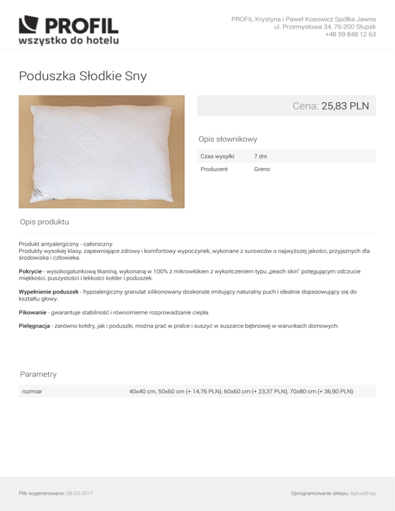 PROFIL Krystyna i Paweł Kosowicz Spółka Jawna ul. Przemysłowa 34, 76-200 Słupsk +48 59 848 12 63 Poduszka Słodkie Sny Cena: 25,83 PLN Opis słownikowy Czas wysyłki 7 dni Producent Greno Opis produktu Produkt antyalergiczny - całoroczny. Produkty wysokiej klasy, zapewniające zdrowy i komfortowy wypoczynek, wykonane z surowców o najwyższej jakości, przyjaznych dla środowiska i człowieka. Pokrycie - wysokogatunkową tkaniną, wykonaną w 100% z mikrowłókien z wykończeniem typu „peach skin” potęgującym odczucie miękkości, puszystości i lekkości kołder i poduszek. Wypełnienie poduszek - hypoalergiczny granulat silikonowany doskonale imitujący naturalny puch i idealnie dopasowujący się do kształtu głowy. Pikowanie - gwarantuje stabilność i równomierne rozprowadzanie ciepła. Pielęgnacja - zarówno kołdry, jak i poduszki, można prać w pralce i suszyć w suszarce bębnowej w warunkach domowych. Parametry rozmiar Plik wygenerowano: 08-03-2017 Powered by TCPDF (www.tcpdf.org) 40x40 cm, 50x60 cm (+ 14,76 PLN), 60x60 cm (+ 23,37 PLN), 70x80 cm (+ 36,90 PLN) Oprogramowanie sklepu: AptusShop