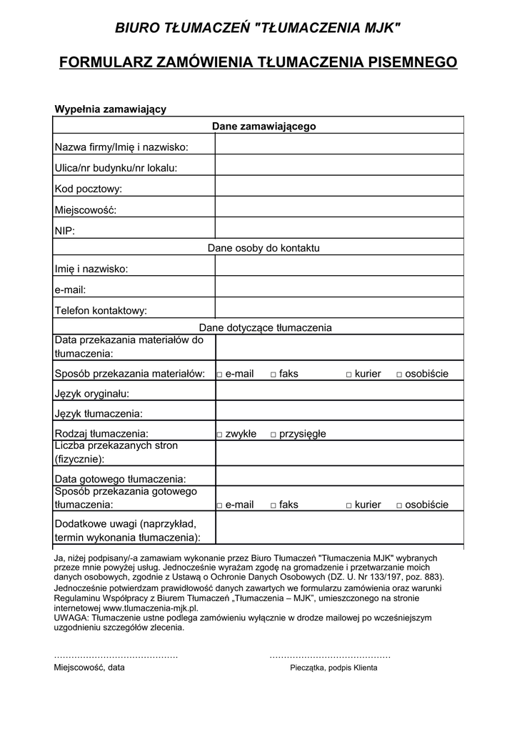 BIURO TŁUMACZEŃ "TŁUMACZENIA MJK" FORMULARZ ZAMÓWIENIA TŁUMACZENIA PISEMNEGO Wypełnia zamawiający Dane zamawiającego Nazwa firmy/Imię i nazwisko: Ulica/nr budynku/nr lokalu: Kod pocztowy: Miejscowość: NIP: Dane osoby do kontaktu Imię i nazwisko: e-mail: Telefon kontaktowy: Dane dotyczące tłumaczenia Data przekazania materiałów do tłumaczenia: Sposób przekazania materiałów: □ e-mail □ faks □ zwykłe □ przysięgłe □ e-mail □ faks □ kurier □ osobiście □ kurier □ osobiście Język oryginału: Język tłumaczenia: Rodzaj tłumaczenia: Liczba przekazanych stron (fizycznie): Data gotowego tłumaczenia: Sposób przekazania gotowego tłumaczenia: Dodatkowe uwagi (naprzykład, termin wykonania tłumaczenia): Ja, niżej podpisany/-a zamawiam wykonanie przez Biuro Tłumaczeń "Tłumaczenia MJK" wybranych przeze mnie powyżej usług. Jednocześnie wyrażam zgodę na gromadzenie i przetwarzanie moich danych osobowych, zgodnie z Ustawą o Ochronie Danych Osobowych (DZ. U. Nr 133/197, poz. 883). Jednocześnie potwierdzam prawidłowość danych zawartych we formularzu zamówienia oraz warunki Regulaminu Współpracy z Biurem Tłumaczeń „Tłumaczenia – MJK”, umieszczonego na stronie internetowej www.tlumaczenia-mjk.pl. UWAGA: Tłumaczenie ustne podlega zamówieniu wyłącznie w drodze mailowej po wcześniejszym uzgodnieniu szczegółów zlecenia. ……………………………………. Miejscowość, data …………………………………… Pieczątka, podpis Klienta
