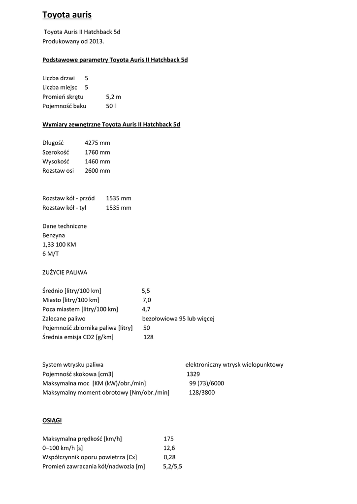 Toyota auris Toyota Auris II Hatchback 5d Produkowany od 2013. Podstawowe parametry Toyota Auris II Hatchback 5d Liczba drzwi 5 Liczba miejsc 5 Promień skrętu Pojemność baku 5,2 m 50 l Wymiary zewnętrzne Toyota Auris II Hatchback 5d Długość Szerokość Wysokość Rozstaw osi 4275 mm 1760 mm 1460 mm 2600 mm Rozstaw kół - przód Rozstaw kół - tył 1535 mm 1535 mm Dane techniczne Benzyna 1,33 100 KM 6 M/T ZUŻYCIE PALIWA Średnio [litry/100 km] Miasto [litry/100 km] Poza miastem [litry/100 km] Zalecane paliwo Pojemność zbiornika paliwa [litry] Średnia emisja CO2 [g/km] 5,5 7,0 4,7 bezołowiowa 95 lub więcej 50 128 System wtrysku paliwa Pojemność skokowa [cm3] Maksymalna moc [KM (kW)/obr./min] Maksymalny moment obrotowy [Nm/obr./min] OSIĄGI Maksymalna prędkość [km/h] 0–100 km/h [s] Współczynnik oporu powietrza [Cx] Promień zawracania kół/nadwozia [m] 175 12,6 0,28 5,2/5,5 elektroniczny wtrysk wielopunktowy 1329 99 (73)/6000 128/3800 ZAWIESZENIE Przód kolumny Tył MacPhersona belka skrętna HAMULCE Przód tarczowe wentylowane Tył tarczowe pełne (ø 277 mm) (ø 270 mm) MASY I WYMIARY Masa własna [kg] min./maks. Masa całkowita pojazdu [kg] min./maks. Poj. bagażnika [litry] Długość/szerokość/wysokość wnętrza [mm] Prześwit [mm] 1185/1280 1735/1815 360 1830/1485/1180 (1155 z dachem Skyview) 140