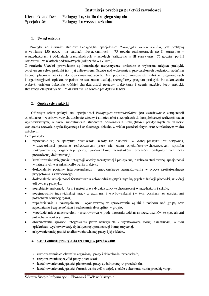 Instrukcja przebiegu praktyki zawodowej Kierunek studiów: Specjalność: 1. Pedagogika, studia drugiego stopnia Pedagogika wczesnoszkolna Uwagi wstępne Praktyka na kierunku studiów: Pedagogika, specjalność: Pedagogika wczesnoszkolna, jest praktyką w wymiarze 150 godz. na studiach niestacjonarnych: 75 godzin realizowanych po II semestrze – w przedszkołach i oddziałach przedszkolnych w szkołach (zaliczenie w III sem.) oraz 75 godzin po III semestrze – w szkołach podstawowych (zaliczenie w IV sem.). Z ramienia Uczelni prowadzone są konsultacje merytoryczne związane z wyborem miejsca praktyki, określeniem celów praktyki jak i jej zaliczeniem. Nadzór nad wykonaniem przydzielonych studentowi zadań na terenie placówki należy do opiekuna-nauczyciela. Na podstawie niniejszych założeń programowych i organizacyjnych opiekun wspólnie ze studentem ustalają szczegółowy program praktyki. Po zakończeniu praktyki opiekun dokonuje krótkiej charakterystyki postawy praktykanta i ocenia przebieg jego praktyki. Realizacja obu praktyk w II roku studiów. Zaliczenie praktyki w II roku. 2. Ogólne cele praktyki Głównym celem praktyki na specjalności Pedagogika wczesnoszkolna, jest kształtowanie kompetencji opiekuńczo – wychowawczych, zdobycie wiedzy i umiejętności niezbędnych do kompleksowej realizacji zadań wychowawczych, a także umożliwienie studentom doskonalenia umiejętności praktycznych w zakresie wspierania rozwoju psychofizycznego i społecznego dziecka w wieku przedszkolnym oraz w młodszym wieku szkolnym. Cele praktyki: zapoznanie się ze specyfiką przedszkola, szkoły lub placówki, w której praktyka jest odbywana, w szczególności poznanie realizowanych przez nią zadań opiekuńczo-wychowawczych, sposobu funkcjonowania, organizacji pracy, pracowników, uczestników procesów pedagogicznych oraz prowadzonej dokumentacji; kształtowanie umiejętności integracji wiedzy teoretycznej i praktycznej z zakresu studiowanej specjalności w naturalnych warunkach odbywania praktyki, doskonalenie postawy interpersonalnego i emocjonalnego zaangażowania w proces profesjonalnego przygotowania zawodowego, doskonalenie umiejętności formułowania celów edukacyjnych wynikających z funkcji placówki, w której odbywa się praktyka, pogłębianie znajomości form i metod pracy dydaktyczno-wychowawczej w przedszkolu i szkole, podejmowanie indywidualnej pracy z uczniami i wychowankami (w tym uczniami ze specjalnymi potrzebami edukacyjnymi), współdziałanie z nauczycielem - wychowawcą w sprawowaniu opieki i nadzoru nad grupą oraz zapewnianiu bezpieczeństwa i zachowania dyscypliny w grupie, współdziałanie z nauczycielem - wychowawcą w podejmowaniu działań na rzecz uczniów ze specjalnymi potrzebami edukacyjnymi, obserwowanie sposobu integrowania przez nauczyciela - wychowawcę różnej działalności, w tym opiekuńczo-wychowawczej, dydaktycznej, pomocowej i terapeutycznej, nabywanie umiejętności analizowania własnej pracy i jej efektów. 3. Cele i zadania praktyki do realizacji w przedszkolu: rozpoznawanie całokształtu organizacji pracy i działalności przedszkola, rozpoznawanie specyfiki pracy przedszkola, kształtowanie umiejętności planowania pracy dydaktycznej w przedszkolu, kształtowanie umiejętności formułowania celów zajęć, a także dokumentowania przedsięwzięć, Wyższa Szkoła Informatyki i Ekonomii TWP w Olsztynie poznawanie wychowanków, ich sytuacji społecznej, potrzeb, zainteresowań i zdolności, zdobywanie umiejętności nawiązywania kontaktów interpersonalnych z dziećmi i ich rodzicami/opiekunami, samodzielne prowadzenie działań opiekuńczo-wychowawczych z grupą i poszczególnymi wychowankami, opracowanie całodniowego scenariusza zajęć w dowolnej grupie wiekowej, organizacja i prowadzenie zajęć wychowawczo-dydaktycznych w oparciu o samodzielnie opracowane scenariusze, animowanie aktywności grupy i współdziałania jej uczestników, organizowanie pracy uczniów w grupach zadaniowych, podejmowanie indywidualnej współpracy z dziećmi, a także podejmowanie działań wychowawczych o charakterze interwencyjnym w sytuacjach konfliktu i zagrożenia bezpieczeństwa. Student zobowiązany jest do hospitacji zajęć przez pierwsze dni pobytu w przedszkolu oraz do samodzielnego prowadzenia zajęć w ogólnym wymiarze 35 godzin. Pozostała część praktyki (40 godz.) powinna być przeznaczona na: aktywny udział w organizowaniu pobytu dzieci w przedszkolu, poznanie specyfiki pracy wychowawcy, obserwowanie: interakcji wychowawca – dziecko oraz interakcji między dziećmi; procesów komunikowania interpersonalnego i społecznego w grupach wychowawczych, ich prawidłowości i zakłóceń; czynności podejmowanych przez wychowawcę; dynamiki grupy i ról pełnionych przez uczestników grupy, zachowania dzieci; aktywności poszczególnych dzieci, działań podejmowanych przez wychowawcę na rzecz zapewnienia bezpieczeństwa i zachowania dyscypliny w grupie, współdziałanie z wychowawcą w sprawowaniu opieki i nadzoru nad grupą oraz zapewnieniu bezpieczeństwa; poznawanie wychowanków, ich sytuacji społecznej, potrzeb, zainteresowań i zdolności, a także wstępne diagnozowanie dysfunkcji i zaburzeń, zapoznanie się z przepisami oraz dokumentacją regulującą działalność przedszkola, przygotowanie materiałów do samodzielnie prowadzonych zajęć. 4. Cele i zadania praktyki do realizacji w szkole: rozpoznawanie całokształtu organizacji pracy i działalności szkoły, rozpoznawanie specyfiki pracy szkoły w klasach od I do III w zakresie wczesnej edukacji, kształtowanie umiejętności w zakresie planowania i prowadzenia zajęć dydaktyczno-wychowawczych na podstawie programu nauczania oraz rozkładu materiału, kształtowanie umiejętności formułowania celów zajęć, oceniania pracy i osiągnięć wychowanków, a także dokumentowania przedsięwzięć, zdobywanie umiejętności nawiązywania kontaktów interperso