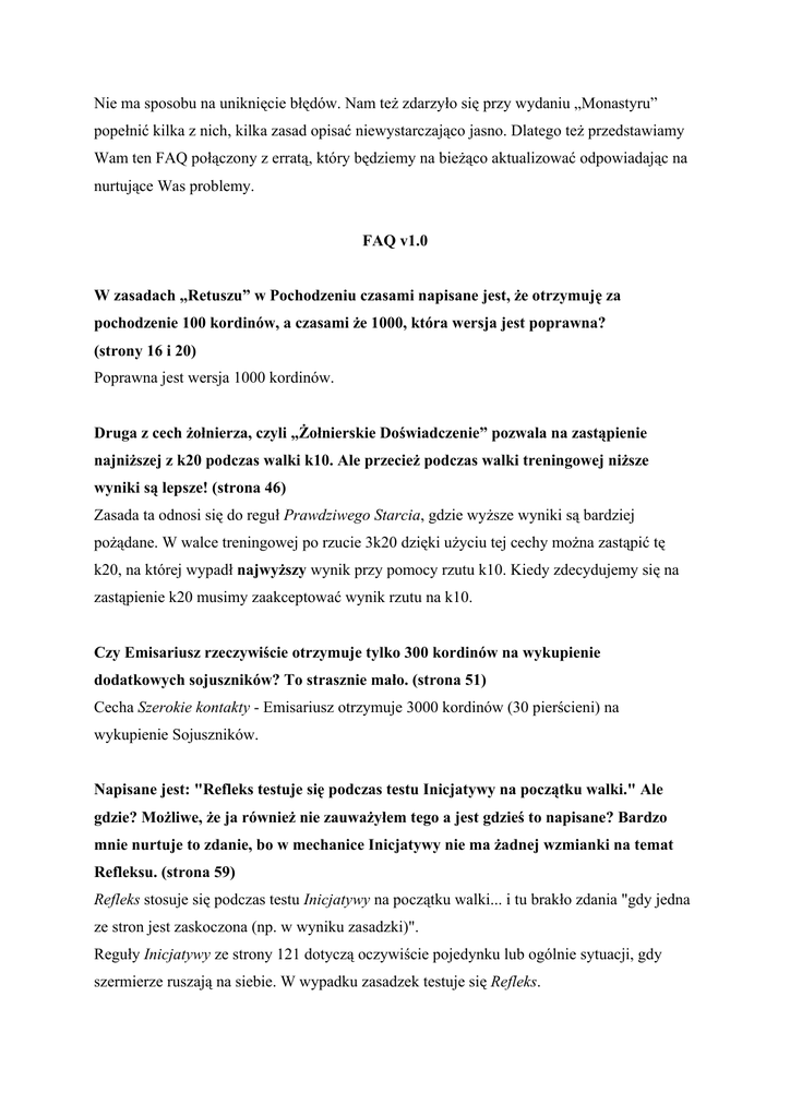 Nie ma sposobu na uniknięcie błędów. Nam też zdarzyło się przy wydaniu „Monastyru” popełnić kilka z nich, kilka zasad opisać niewystarczająco jasno. Dlatego też przedstawiamy Wam ten FAQ połączony z erratą, który będziemy na bieżąco aktualizować odpowiadając na nurtujące Was problemy. FAQ v1.0 W zasadach „Retuszu” w Pochodzeniu czasami napisane jest, że otrzymuję za pochodzenie 100 kordinów, a czasami że 1000, która wersja jest poprawna? (strony 16 i 20) Poprawna jest wersja 1000 kordinów. Druga z cech żołnierza, czyli „Żołnierskie Doświadczenie” pozwala na zastąpienie najniższej z k20 podczas walki k10. Ale przecież podczas walki treningowej niższe wyniki są lepsze! (strona 46) Zasada ta odnosi się do reguł Prawdziwego Starcia, gdzie wyższe wyniki są bardziej pożądane. W walce treningowej po rzucie 3k20 dzięki użyciu tej cechy można zastąpić tę k20, na której wypadł najwyższy wynik przy pomocy rzutu k10. Kiedy zdecydujemy się na zastąpienie k20 musimy zaakceptować wynik rzutu na k10. Czy Emisariusz rzeczywiście otrzymuje tylko 300 kordinów na wykupienie dodatkowych sojuszników? To strasznie mało. (strona 51) Cecha Szerokie kontakty - Emisariusz otrzymuje 3000 kordinów (30 pierścieni) na wykupienie Sojuszników. Napisane jest: "Refleks testuje się podczas testu Inicjatywy na początku walki." Ale gdzie? Możliwe, że ja również nie zauważyłem tego a jest gdzieś to napisane? Bardzo mnie nurtuje to zdanie, bo w mechanice Inicjatywy nie ma żadnej wzmianki na temat Refleksu. (strona 59) Refleks stosuje się podczas testu Inicjatywy na początku walki... i tu brakło zdania "gdy jedna ze stron jest zaskoczona (np. w wyniku zasadzki)". Reguły Inicjatywy ze strony 121 dotyczą oczywiście pojedynku lub ogólnie sytuacji, gdy szermierze ruszają na siebie. W wypadku zasadzek testuje się Refleks. W opisie biegłości „Cios głową” jest napisane " w walce w Zwarciu, Atakujący może zadać lekką tłuczoną ranę kosztem 1 PP a nie 3 PP". Czy nie powinno być "kosztem 2 PP, a nie 4 PP? (strona 70) Tak. Kosztem 2 PP a nie 4PP. Jeżeli jestem armatorem statku i mój statek właśnie wrócił z wyprawy, to ile mam czekać zanim ponownie wypłynie? (strona 84) Przeładunek zabiera zazwyczaj kilka dni, także można uznać, że statek wypływa w tym samym miesiącu, w którym przypłynął. Innymi słowy nie ma przestoju czasowego, a statek cały czas na siebie zarabia. Czy to normalne, że dzierżawa budynku dostarcza tak niewielki (10 kordinów) fundusze? Przecież to zupełnie nieopłacalne. (strona 84) Dzierżawa budynku - Dochód wynosi 100 kordinów (było 10 kordinów) rocznie za każde zainwestowane 5 Pierścieni. Doria miała być podupadającym państwem, a jak widzę, jakie są wpływy z Wasali w porównaniu do ich ceny, to nie mogę w to uwierzyć. (strona 85) Wpływy z podatków od wasali - Wartość wynosi 10 Wsi (było 1 Wieś). Przy wykonywaniu Testu ukrycia napisane jest, że potrzebuje 8 Punktów Sukcesu, żeby podejść na zasięg bezpośredni i aż 9 PS aby zbliżyć się na jeden metr, dlaczego? (strona 106) Oczywiście cyfry te należy zamienić. 8 Punktów Sukcesu wymagane jest, aby podejść na zasięg jednego metra, a 9 PS by zbliżyć się na bezpośrednią odległość do celu. W trzecim kroku Walki Treningowej napisane jest, że do ustalenia Inicjatywy wybiera się kość o najwyższym wyniku, a przecież jest to w tej wersji walki najgorsza kość, czyli jej oddanie nie jest żadną stratą. (strona 121) To znów efekt pewnej niedoskonałości w korelacji pomiędzy Walką Treningową a Prawdziwą. Przy Walce Treningowej do ustalenia Inicjatywy potrzebna jest kość o jak najniższym wyniku. Niższy wynik na k20 to zwycięstwo w walce o inicjatywę. Wydając 2 PP o ile zwiększam rzut kostką? O dwa "oczka"? Czy może o jedno „oczko”? (strona 123). Zwiększa się o jedno oczko. Czemu przy ciężkiej broni bitewnej kara za Budowę jest dopiero poniżej 12 punktów tego współczynnika? (strona 125) To błąd. Powinno być: za każdy poziom współczynnika Budowa poniżej 16 punktów należy przyznać +1 PT podczas walki. Czasami w podręczniku pojawia się zwrot 3k30, czy naprawdę chodzi wtedy o rzut kością trzydzieściościenna? Nie, to literówka. Jeżeli gdzieś w podręczniku natkniecie się na tego potworka pamiętajcie, że chodzi o 3k20. Jakie rany otrzymuje się podczas walki treningowej, nie mogłem tego nigdzie znaleźć. Podczas Walki Treningowej wszystkie otrzymane rany są lekkie. Wiemy, że nie jest to zgodne z realizmem, ale Walka Treningowa ma być w zamyśle maksymalnie uproszczona. Do poważniejszych starć zdecydowanie lepsze jest Prawdziwe Starcie. O co chodzi z tymi Przebiciami i dlaczego niektóre bronie posiadają ten współczynnik na wyższym poziomie niż są w stanie wytrzymać nawet najlepsze zbroje. Zbroje w Monastyrze zostały zaprojektowane tak, żeby ich noszenie było nieopłacalne. Przebicie powoduje, że niweluje się Redukcję pancerza. Jeżeli na przykład uderzamy bronią z Przebiciem 1 w część ciała przeciwnika, która jest chroniona pancerzem o wartości Redukcji 2, to niwelowany jest jeden jej jeden poziom, czyli zbroja chroni jakby miała Redukcję na 1 (w tym konkretnym ciosie). Przebicie większe niż Redukcja nie powoduje zwiększenia obrażeń. Niektóre bronie posiadają Przebicie na poziomie aż 3, ponieważ w przyszłości dowiecie się o stworach, których pancerz jest daleko lepszy od zbroi płytowej. Czy dla akcji w Zwarciu przyznawane są jakieś punkty? Tak, do akcji w Zwarciu przyznawana jest liczba punktów wynosząca Atletyka x 1. Czy na akcje szermiercze Ruch na pewno powinienem dostać aż tyle punktów (Wysportowanie x3)? Nie, to błąd. Podobnie jak na pozostałe akcje (W zwarciu, czy Broń bitewna), także w Ruchu nie mnoży się ilości punktów z Umiejętności. Strzelanie w walce, jeżeli gracz chce strzelić dwukr