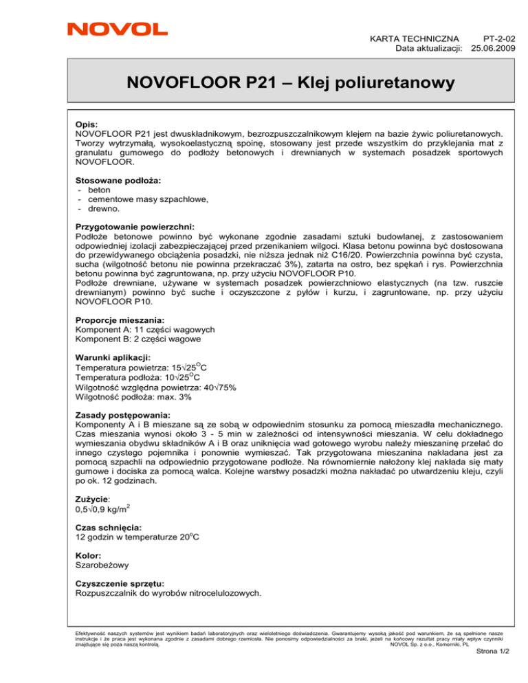KARTA TECHNICZNA PT-2-02 Data aktualizacji: 25.06.2009 NOVOFLOOR P21 – Klej poliuretanowy Opis: NOVOFLOOR P21 jest dwuskładnikowym, bezrozpuszczalnikowym klejem na bazie Ŝywic poliuretanowych. Tworzy wytrzymałą, wysokoelastyczną spoinę, stosowany jest przede wszystkim do przyklejania mat z granulatu gumowego do podłoŜy betonowych i drewnianych w systemach posadzek sportowych NOVOFLOOR. Stosowane podłoŜa: - beton - cementowe masy szpachlowe, - drewno. Przygotowanie powierzchni: PodłoŜe betonowe powinno być wykonane zgodnie zasadami sztuki budowlanej, z zastosowaniem odpowiedniej izolacji zabezpieczającej przed przenikaniem wilgoci. Klasa betonu powinna być dostosowana do przewidywanego obciąŜenia posadzki, nie niŜsza jednak niŜ C16/20. Powierzchnia powinna być czysta, sucha (wilgotność betonu nie powinna przekraczać 3%), zatarta na ostro, bez spękań i rys. Powierzchnia betonu powinna być zagruntowana, np. przy uŜyciu NOVOFLOOR P10. PodłoŜe drewniane, uŜywane w systemach posadzek powierzchniowo elastycznych (na tzw. ruszcie drewnianym) powinno być suche i oczyszczone z pyłów i kurzu, i zagruntowane, np. przy uŜyciu NOVOFLOOR P10. Proporcje mieszania: Komponent A: 11 części wagowych Komponent B: 2 części wagowe Warunki aplikacji: O Temperatura powietrza: 15÷25 C O Temperatura podłoŜa: 10÷25 C Wilgotność względna powietrza: 40÷75% Wilgotność podłoŜa: max. 3% Zasady postępowania: Komponenty A i B mieszane są ze sobą w odpowiednim stosunku za pomocą mieszadła mechanicznego. Czas mieszania wynosi około 3 - 5 min w zaleŜności od intensywności mieszania. W celu dokładnego wymieszania obydwu składników A i B oraz uniknięcia wad gotowego wyrobu naleŜy mieszaninę przelać do innego czystego pojemnika i ponownie wymieszać. Tak przygotowana mieszanina nakładana jest za pomocą szpachli na odpowiednio przygotowane podłoŜe. Na równomiernie nałoŜony klej nakłada się maty gumowe i dociska za pomocą walca. Kolejne warstwy posadzki moŜna nakładać po utwardzeniu kleju, czyli po ok. 12 godzinach. ZuŜycie: 2 0,5÷0,9 kg/m Czas schnięcia: o 12 godzin w temperaturze 20 C Kolor: SzarobeŜowy Czyszczenie sprzętu: Rozpuszczalnik do wyrobów nitrocelulozowych. Efektywność naszych systemów jest wynikiem badań laboratoryjnych oraz wieloletniego doświadczenia. Gwarantujemy wysoką jakość pod warunkiem, Ŝe są spełnione nasze instrukcje i Ŝe praca jest wykonana zgodnie z zasadami dobrego rzemiosła. Nie ponosimy odpowiedzialności za braki, jeŜeli na końcowy rezultat pracy miały wpływ czynniki znajdujące się poza naszą kontrolą. NOVOL Sp. z o.o., Komorniki, PL Strona 1/2 KARTA TECHNICZNA PT-2-02 Data aktualizacji: 25.06.2009 Warunki i czas przechowywania: Przechowywać w suchych i chłodnych pomieszczeniach z dala od źródeł ognia i ciepła. Unikać naświetlania promieniami słonecznymi . Zawartość opakowania naleŜy chronić przed wilgocią. Klej NOVOFLOOR P21 komponent A: 12 miesięcy w 20°C. Klej NOVOFLOOR P21 komponent B (utwardzacz): 6 miesięcy w 20°C. Przepisy BHP: Podane w Karcie Charakterystyki dla danego wyrobu. Opakowanie: Komponent A: 22kg Komponent B: 4kg Efektywność naszych systemów jest wynikiem badań laboratoryjnych oraz wieloletniego doświadczenia. Gwarantujemy wysoką jakość pod warunkiem, Ŝe są spełnione nasze instrukcje i Ŝe praca jest wykonana zgodnie z zasadami dobrego rzemiosła. Nie ponosimy odpowiedzialności za braki, jeŜeli na końcowy rezultat pracy miały wpływ czynniki znajdujące się poza naszą kontrolą. NOVOL Sp. z o.o., Komorniki, PL Strona 2/2