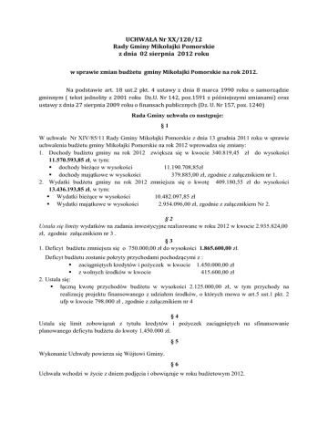 UCHWAŁA Nr XX/120/12 Rady Gminy Mikołajki Pomorskie z dnia 02 sierpnia 2012 roku w sprawie zmian budżetu gminy Mikołajki Pomorskie na rok 2012. Na podstawie art. 18 ust.2 pkt. 4 ustawy z dnia 8 marca 1990 roku o samorządzie gminnym ( tekst jednolity z 2001 roku Dz.U. Nr 142, poz.1591 z późniejszymi zmianami) oraz ustawy z dnia 27 sierpnia 2009 roku o finansach publicznych (Dz. U. Nr 157, poz. 1240) Rada Gminy uchwala co następuje: §1 W uchwale Nr XIV/85/11 Rady Gminy Mikołajki Pomorskie z dnia 13 grudnia 2011 roku w sprawie uchwalenia budżetu gminy Mikołajki Pomorskie na rok 2012 wprowadza się zmiany: 1. Dochody budżetu gminy na rok 2012 zwiększa się w kwocie 340.819,45 zł do wysokości 11.570.593,85 zł, w tym: dochody bieżące w wysokości 11.190.708,85zł dochody majątkowe w wysokości 379.885,00 zł, zgodnie z załącznikiem nr 1. 2. Wydatki budżetu gminy na rok 2012 zmniejsza się o kwotę 409.180,55 zł do wysokości 13.436.193,85 zł, w tym: Wydatki bieżące w wysokości 10.482.097,85 zł Wydatki majątkowe w wysokości 2.954.096,00 zł, zgodnie z załącznikiem Nr 2. §2 Ustala się limity wydatków na zadania inwestycyjne realizowane w roku 2012 w kwocie 2.935.824,00 zł, zgodnie załącznikiem nr 3 . §3 1. Deficyt budżetu zmniejsza się o 750.000,00 zł do wysokości 1.865.600,00 zł. Deficyt budżetu zostanie pokryty przychodami pochodzącymi z : zaciągniętych kredytów i pożyczek w kwocie 1.450.000,00 zł z wolnych środków w kwocie 415.600,00 zł 2. Ustala się: łączną kwotę przychodów budżetu w wysokości 2.125.000,00 zł, w tym przychody na realizację projektu finansowanego z udziałem środków, o których mowa w art.5 ust.1 pkt. 2 ufp w kwocie 798.000 zł , zgodnie z załącznikiem nr 4 §4 Ustala się limit zobowiązań z tytułu kredytów i pożyczek zaciągniętych na sfinansowanie planowanego deficytu budżetu do kwoty 1.450.000 zł. §5 Wykonanie Uchwały powierza się Wójtowi Gminy. §6 Uchwała wchodzi w życie z dniem podjęcia i obowiązuje w roku budżetowym 2012. Uzasadnienie Dochody Gminy na rok 2012 zwiększono ogółem w kwocie 340.819,45 zł , wydatki gminy zmniejszono o 409.180,55 zł . Jednocześnie dokonano zmniejszenia przychodów gminy w kwocie 750.000 zł z zaciągniętych kredytów i pożyczek. Dochody Dokonano zwiększenia dochodów ogółem w kwocie 340.819,45zł, w tym : • w dziale 852 „Pomoc społeczna” w rozdziale 85295 Pozostała działalność w kwocie 15.000 zł z tytułu zwiększenia dotacji celowej na dofinansowanie realizacji programu „Pomoc państwa w zakresie dożywiania” na podstawie pisma PUW w Gdańsku Nr FB-I.3111-142.2012KK z dnia 25.07.2012 roku, • w dziale 853 „Pozostałe zadania w zakresie polityki społecznej” w rozdziale 85395 „Pozostała działalność” w kwocie 205.558,45 zł z tytułu dotacji celowej na projekt realizowany przez Gminny Ośrodek Pomocy Społecznej pn.”Reintegracja społeczna osób nieaktywnych zawodowo” w ramach programów finansowanych z udziałem środków europejskich - na podstawie aneksu do umowy UDA-POKL.07.01.01-22-015/08-04 z dnia 16 lipca 2012 roku, • w dziale 900 „Gospodarka komunalna i ochrona środowiska” w rozdziale 90095 Pozostała działalność w kwocie 98.160 zł tytułem dotacji na realizację zadania p.n. „Usuwanie wyrobów zawierających azbest z terenu gminy Mikołajki Pomorskie z Wojewódzkiego Funduszu Ochrony środowiska i Gospodarki Wodnej w Gdańsku – umowa nr WFOŚ/D/III73.E/209/2012/AZBEST-2012 z dnia 13 lipca 2012 roku. Pozostałe zmiany dochodów własnych w kwocie 22.101 zł wynikają z bieżącej realizacji budżetu dostosowanie do faktycznych wpływów: • W dziale 010 „ Rolnictwo i łowiectwo” w rozdziale 01095 „Pozostała działalność” w kwocie 3.600 zł - z dzierżawy , • W dziale 700 „ Gospodarka mieszkaniowa” w kwocie 600 zł – z tytułu odsetek za zwłokę, • W dziale 710 „Działalność usługowa” w kwocie 6.000 zł – z tytułu środków finansowych niewykorzystanych w terminie wydatków, które nie wygasają z upływem roku budżetowego, • W dziale 750 Administracja publiczna” w kwocie 165 zł - z tytułu sprzedaży złomu, • W dziale 754” Bezpieczeństwo publiczne i ochrona przeciwpożarowa w kwocie 7.150 zł – za sprzedaż składników majątkowych ( sam. Star 266 oraz przyczepa PAD) • W dziale 756 „ Dochody od osób prawnych, od osób fizycznych i oraz od innych jednostek nieposiadających osobowości prawnej oraz wydatki związane z ich poborem” w kwocie 390 zł – z tytułu opłaty targowej, • W dziale 801 „Oświata i wychowanie” w kwocie 4.196 zł – z tytułu odsetek za zwłokę, różnych dochodów, odszkodowań oraz najmu pomieszczeń. WYDATKI Ogółem dokonano zmniejszenia wydatków w kwocie 409.180,55 zł , ( w tym : zwiększenia w kwocie 330.819,45 zł , zmniejszenia w kwocie 740.000 zł oraz przeniesienia w kwocie 55.800 zł). Zmian dokonano: • W dziale 010 „ Rolnictwo i łowiectwo” w rozdziale 01010 „Rolnictwo i łowiectwo” zmniejszono wydatki w kwocie 500.000 zł – na realizację projektu „Uregulowanie gospodarki wodno- • • • • • • • ściekowej na terenie gminy Mikołajki Pomorskie” po przeprowadzonych przetargach i wyłonieniu wykonawców, W dziale 600 „Transport i łączność” w rozdziale 60016 „Drogi publiczne gminne” zmniejszono wydatki inwestycyjne w kwocie 160.000 zł na budowę drogi do działek rekreacyjnych w Balewie – zadanie przesunięto do realizacji na rok następny , W dziale 750 „Administracja publiczna” w rozdziale 75023 Urzędy gmin zwiększono wydatki w kwocie 32.101 zł - na nagrody jubileuszowe pracowników oraz na bieżące potrzeby Urzędu (zakup oprogramowania do oraz zakup usług pozostałych), W dziale 757 „Obsługa długu publicznego” w rozdziale 75702 zmniejszono wydatki z kwocie 20.000 zł na (odsetki od zaciągniętych pożyczek i kredytów w kwocie 15.000 z