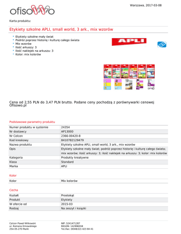 Warszawa, 2017-03-08 Karta produktu: Etykiety szkolne APLI, small world, 3 ark., mix wzorów Etykiety szkolne mały świat Podróż poprzez historię i kulturę całego świata Mix wzorów Ilość arkuszy: 3 Ilość naklejek na arkuszu: 3 Kolor: mix kolorów Cena od 2,55 PLN do 3,47 PLN brutto. Podane ceny pochodzą z porównywarki cenowej Ofisowo.pl Podstawowe parametry produktu Numer produktu w systemie 24354 Nr dostawcy AP13000 Nr Celcen 2366-00420-8 Kod kreskowy 8410782129479 Nazwa produktu Etykiety szkolne APLI, small world, 3 ark., mix wzorów Opis Etykiety szkolne mały świat; podróż poprzez historię i kulturę całego świata; mix wzorów; ilość arkuszy: 3; ilość naklejek na arkuszu: 3; kolor: mix kolorów Kategoria Produkty kreatywne Klasa Standard Marka APLI Kolor Kolor Mix kolorów Cecha Kształt Prostokąt Produkt Etykiety W ofercie od 2015-03 Rodzaj Na zeszyt i ksiązki Celcen Paweł Witkowski ul. Romana Dmowskiego 25A 05-270 Marki NIP: 5241471287 REGON: 142996558 Tel./fax: (0048/22) 423 84 41 Warszawa, 2017-03-08 Karta katalogowa produktu cd. Etykiety szkolne APLI, small world, 3 ark., mix wzorów Typ Szkolne Ilość Ilość arkuszy 3 Ilość etykiet na arkuszu 3 Certyfikaty Hit Standard Nowy produkt w ofercie Standard Wspólny słownik zamówień CPV 30192800-9 Serdecznie zapraszamy do współpracy zespół. Ofisowo.pl Celcen Paweł Witkowski ul. Romana Dmowskiego 25A 05-270 Marki NIP: 5241471287 REGON: 142996558 Tel./fax: (0048/22) 423 84 41