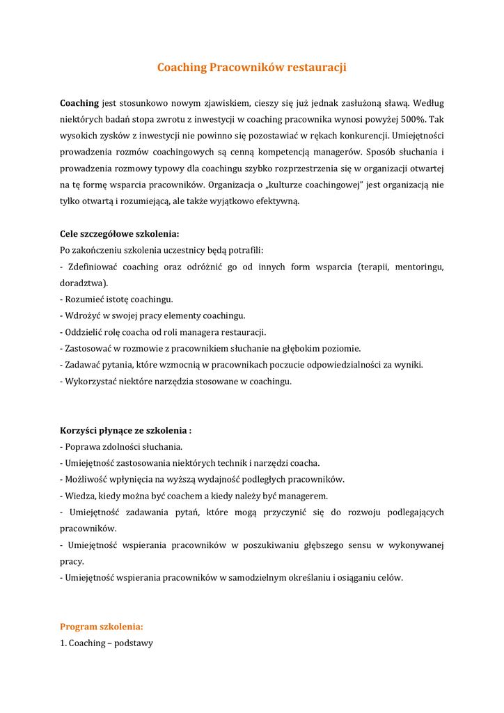 Coaching Pracowników restauracji Coaching jest stosunkowo nowym zjawiskiem, cieszy się już jednak zasłużoną sławą. Według niektórych badań stopa zwrotu z inwestycji w coaching pracownika wynosi powyżej 500%. Tak wysokich zysków z inwestycji nie powinno się pozostawiać w rękach konkurencji. Umiejętności prowadzenia rozmów coachingowych są cenną kompetencją managerów. Sposób słuchania i prowadzenia rozmowy typowy dla coachingu szybko rozprzestrzenia się w organizacji otwartej na tę formę wsparcia pracowników. Organizacja o „kulturze coachingowej” jest organizacją nie tylko otwartą i rozumiejącą, ale także wyjątkowo efektywną. Cele szczegółowe szkolenia: Po zakończeniu szkolenia uczestnicy będą potrafili: - Zdefiniować coaching oraz odróżnić go od innych form wsparcia (terapii, mentoringu, doradztwa). - Rozumieć istotę coachingu. - Wdrożyć w swojej pracy elementy coachingu. - Oddzielić rolę coacha od roli managera restauracji. - Zastosować w rozmowie z pracownikiem słuchanie na głębokim poziomie. - Zadawać pytania, które wzmocnią w pracownikach poczucie odpowiedzialności za wyniki. - Wykorzystać niektóre narzędzia stosowane w coachingu. Korzyści płynące ze szkolenia : - Poprawa zdolności słuchania. - Umiejętność zastosowania niektórych technik i narzędzi coacha. - Możliwość wpłynięcia na wyższą wydajność podległych pracowników. - Wiedza, kiedy można być coachem a kiedy należy być managerem. - Umiejętność zadawania pytań, które mogą przyczynić się do rozwoju podlegających pracowników. - Umiejętność wspierania pracowników w poszukiwaniu głębszego sensu w wykonywanej pracy. - Umiejętność wspierania pracowników w samodzielnym określaniu i osiąganiu celów. Program szkolenia: 1. Coaching – podstawy • - definicje coachingu • - odróżnienie coachingu od innych form wsparcia • - główne założenia coachingu • - coaching a psychologia pozytywna 2. Relacja w coachingu • - budowanie relacji • - koncentracja na kliencie coachingu • - słuchanie na głębokim poziomie 3. Modele coachingu • - model GROW • - inne modele 4.Mocne pytania • - pytania typowe dla coachingu • - budowanie pytań 5. Niektóre narzędzia wykorzystywane w coachingu 6. Kompetencje coacha. 7. Praca z oporem i ograniczającymi przekonania. 8. Coaching na poziomie wartości 9. Coach a MANAGER: • - części wspólne w rolach coacha i managera • - rozłączność roli coacha i roli managera 10.Budowanie kultury coachingowej w restauracji • - możliwości wykorzystania umiejętności coacha w restauracji