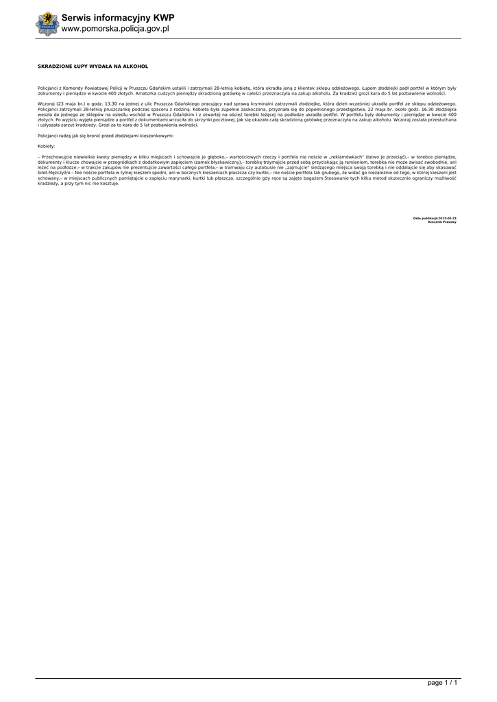 Serwis informacyjny KWP www.pomorska.policja.gov.pl SKRADZIONE ŁUPY WYDAŁA NA ALKOHOL Policjanci z Komendy Powiatowej Policji w Pruszczu Gdańskim ustalili i zatrzymali 28-letnią kobietę, która okradła jeną z klientek sklepu odzieżowego. Łupem złodziejki padł portfel w którym były dokumenty i pieniądze w kwocie 400 złotych. Amatorka cudzych pieniędzy skradzioną gotówkę w całości przeznaczyła na zakup alkoholu. Za kradzież grozi kara do 5 lat pozbawienie wolności. Wczoraj (23 maja br.) o godz. 13.30 na jednej z ulic Pruszcza Gdańskiego pracujący nad sprawą kryminalni zatrzymali złodziejkę, która dzień wcześniej ukradła portfel ze sklepu odzieżowego. Policjanci zatrzymali 28-letnią pruszczankę podczas spaceru z rodziną. Kobieta była zupełnie zaskoczona, przyznała się do popełnionego przestępstwa. 22 maja br. około godz. 16.30 złodziejka weszła do jednego ze sklepów na osiedlu wschód w Pruszczu Gdańskim i z otwartej na oścież torebki leżącej na podłodze ukradła portfel. W portfelu były dokumenty i pieniądze w kwocie 400 złotych. Po wyjściu wyjęła pieniądze a portfel z dokumentami wrzuciła do skrzynki pocztowej. Jak się okazało całą skradzioną gotówkę przeznaczyła na zakup alkoholu. Wczoraj została przesłuchana i usłyszała zarzut kradzieży. Grozi za to kara do 5 lat pozbawienia wolności. Policjanci radzą jak się bronić przed złodziejami kieszonkowymi: Kobiety: – Przechowujcie niewielkie kwoty pieniędzy w kilku miejscach i schowajcie je głęboko,– wartościowych rzeczy i portfela nie noście w „reklamówkach" (łatwo je przeciąć),– w torebce pieniądze, dokumenty i klucze chowajcie w przegródkach z dodatkowym zapięciem (zamek błyskawiczny),– torebkę trzymajcie przed sobą przyciskając ją ramieniem, torebka nie może zwisać swobodnie, ani leżeć na podłodze,– w trakcie zakupów nie prezentujcie zawartości całego portfela,– w tramwaju czy autobusie nie „zajmujcie" siedzącego miejsca swoją torebką i nie oddalajcie się aby skasować bilet.Mężczyźni:– Nie noście portfela w tylnej kieszeni spodni, ani w bocznych kieszeniach płaszcza czy kurtki,– nie noście portfela tak grubego, że widać go niezależnie od tego, w której kieszeni jest schowany,– w miejscach publicznych pamiętajcie o zapięciu marynarki, kurtki lub płaszcza, szczególnie gdy ręce są zajęte bagażem.Stosowanie tych kilku metod skutecznie ograniczy możliwość kradzieży, a przy tym nic nie kosztuje. Data publikacji:2013-05-23 Rzecznik Prasowy page 1 / 1 Powered by TCPDF (www.tcpdf.org)