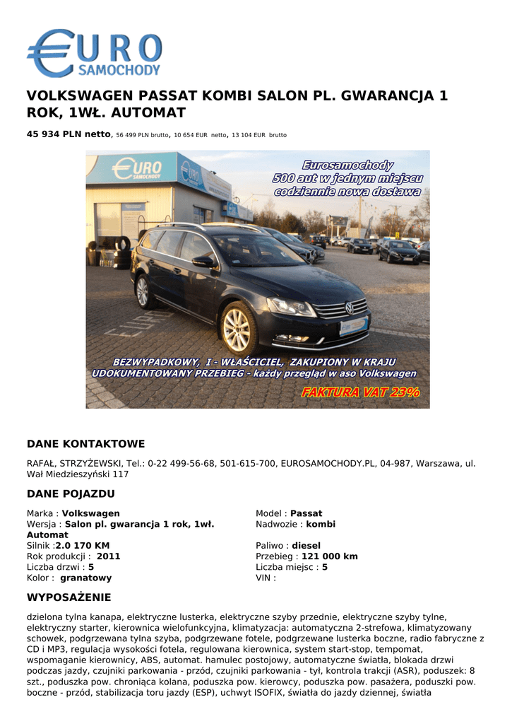 VOLKSWAGEN PASSAT KOMBI SALON PL. GWARANCJA 1 ROK, 1WŁ. AUTOMAT 45 934 PLN netto, 56 499 PLN brutto, 10 654 EUR netto, 13 104 EUR brutto DANE KONTAKTOWE RAFAŁ, STRZYŻEWSKI, Tel.: 0-22 499-56-68, 501-615-700, EUROSAMOCHODY.PL, 04-987, Warszawa, ul. Wał Miedzieszyński 117 DANE POJAZDU Marka : Volkswagen Wersja : Salon pl. gwarancja 1 rok, 1wł. Automat Silnik :2.0 170 KM Rok produkcji : 2011 Liczba drzwi : 5 Kolor : granatowy Model : Passat Nadwozie : kombi Paliwo : diesel Przebieg : 121 000 km Liczba miejsc : 5 VIN : WYPOSAŻENIE dzielona tylna kanapa, elektryczne lusterka, elektryczne szyby przednie, elektryczne szyby tylne, elektryczny starter, kierownica wielofunkcyjna, klimatyzacja: automatyczna 2-strefowa, klimatyzowany schowek, podgrzewana tylna szyba, podgrzewane fotele, podgrzewane lusterka boczne, radio fabryczne z CD i MP3, regulacja wysokości fotela, regulowana kierownica, system start-stop, tempomat, wspomaganie kierownicy, ABS, automat. hamulec postojowy, automatyczne światła, blokada drzwi podczas jazdy, czujniki parkowania - przód, czujniki parkowania - tył, kontrola trakcji (ASR), poduszek: 8 szt., poduszka pow. chroniąca kolana, poduszka pow. kierowcy, poduszka pow. pasażera, poduszki pow. boczne - przód, stabilizacja toru jazdy (ESP), uchwyt ISOFIX, światła do jazdy dziennej, światła przeciwmgielne, aluminiowe felgi, autoalarm, centralny zamek, immobiliser, komputer pokładowy, reflektory ksenonowe, wyjście aux, światła LED WYPOSAŻENIE DODATKOWE bezwypadkowy, gwarancja, książka serwisowa, możliwa zamiana, serwisowany w ASO, stan bardzo dobry OPIS POJAZDU Salon Polska WITAMY W NAJWIĘKSZYM W POLSCE SALONIE SAMOCHODÓW UŻYWANYCH ZADZWOŃ TERAZ!!! Rafał 501 615 700 Tomasz 512 345 150 Marcin 505 416 300 Piotr 501 087 038 Mariusz 500 130 727 SUPER PROMOCJA GWARANCJA TECHNICZNA NA 12 MIESIĘCY lub KOMPLET OPON ZIMOWYCH lub LETNICH GRATIS*(do wyczerpania zapasów, możliwość rozszerzenia gwarancji do 36 miesięcy) - 500 AUT Z GWARANCJĄ w jednym miejscu / różne marki , modele , wersje wyposażenia/ - 8 dni na zamianę auta - Sprawdzone pochodzenie pojazdów - bezwypadkowe - Gwarancja przebiegu - Gwarancja pełnej historii serwisowej - Samochody od I właściciela - dla klientów zamiejscowych rezerwacja auta do czasu przyjazdu - udzielamy 12-miesięcznej gwarancji technicznej, możliwość przedłużenia do 36-miesięcy /bez limitu kilometrów, ważna na terenie całej Polski + assistance- darmowe holowanie , potwierdzenie certyfikatem / Kupującemu oferujemy: 1. Jazdę próbną 2. Bezpłatny przegląd przedsprzedażowy obejmujący: - kontrolę amortyzatorów - hamulców - podwozia samochodu - pomiar geometrii - diagnoza komputerowa - pomiar grubości powłoki lakierniczej - możliwość sprawdzenia przed zakupem w serwisie lub stacji diagnostycznej lub za pośrednictwem niezależnego rzeczoznawcy na zlecenie kupującego /dla klientów zamiejscowych bez konieczności przyjazdu/. - wszystkie nasze samochody posiadają komplet dokumentów wymaganych do zarejestrowania bądź przerejestrowania samochodu - przyjmujemy auta w rozliczeniu oraz kupujemy /bez ograniczeń wiekowych/ - Zajmujemy się sprzedażą detaliczną oraz hurtową / zapraszamy do współpracy osoby prywatne, firmy również z branży i instytucje / -Kupujący otrzymuje fakturę VAT 23% /nie ponosi opłaty PCC w wysokości 2%/ -kredyt 0% wpłaty własnej,raty dopasowane do własnych potrzeb -leasing bez zaświadczeń ,również dla widniejących w BIK szybka obsługa na miejscu "Niniejsze ogłoszenia są wyłącznie informacją handlową i nie stanowią oferty w myśl art. 66, § 1. Kodeksu Cywilnego. Sprzedający nie odpowiada za ewentualne błędy lub nieaktualność ogłoszenia." Zapis ten został zamieszczony ze względu na możliwość niezamierzonych pomyłek. Jeżeli zauważysz nieścisłość napisz do nas. Szukasz pewnego używanego auta ? Tylko u nas sprawdzone samochody z polskich salonów To nie komis to salon aut używanych z wieloletnim doświadczeniem Więcej informacji na eurosamochody . pl ZADZWOŃ TERAZ!!! Rafał 501 615 700 Tomasz 512 345 150 Marcin 505 416 300 Piotr 501 087 038 Mariusz 500 130 727 QR CODE DLA OGŁOSZENIA Powered by TCPDF (www.tcpdf.org)