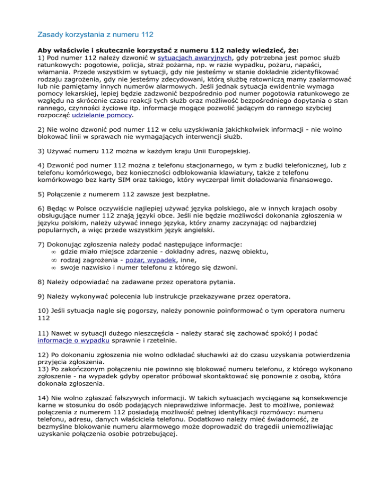 Zasady korzystania z numeru 112 Aby właściwie i skutecznie korzystać z numeru 112 należy wiedzieć, że: 1) Pod numer 112 należy dzwonić w sytuacjach awaryjnych, gdy potrzebna jest pomoc służb ratunkowych: pogotowie, policja, straż pożarna, np. w razie wypadku, pożaru, napaści, włamania. Przede wszystkim w sytuacji, gdy nie jesteśmy w stanie dokładnie zidentyfikować rodzaju zagrożenia, gdy nie jesteśmy zdecydowani, którą służbę ratowniczą mamy zaalarmować lub nie pamiętamy innych numerów alarmowych. Jeśli jednak sytuacja ewidentnie wymaga pomocy lekarskiej, lepiej będzie zadzwonić bezpośrednio pod numer pogotowia ratunkowego ze względu na skrócenie czasu reakcji tych służb oraz możliwość bezpośredniego dopytania o stan rannego, czynności życiowe itp. informacje mogące pozwolić jadącym do rannego szybciej rozpocząć udzielanie pomocy. 2) Nie wolno dzwonić pod numer 112 w celu uzyskiwania jakichkolwiek informacji - nie wolno blokować linii w sprawach nie wymagających interwencji służb. 3) Używać numeru 112 można w każdym kraju Unii Europejskiej. 4) Dzwonić pod numer 112 można z telefonu stacjonarnego, w tym z budki telefonicznej, lub z telefonu komórkowego, bez konieczności odblokowania klawiatury, także z telefonu komórkowego bez karty SIM oraz takiego, który wyczerpał limit doładowania finansowego. 5) Połączenie z numerem 112 zawsze jest bezpłatne. 6) Będąc w Polsce oczywiście najlepiej używać języka polskiego, ale w innych krajach osoby obsługujące numer 112 znają języki obce. Jeśli nie będzie możliwości dokonania zgłoszenia w języku polskim, należy używać innego języka, który znamy zaczynając od najbardziej popularnych, a więc przede wszystkim język angielski. 7) Dokonując zgłoszenia należy podać następujące informacje: • gdzie miało miejsce zdarzenie - dokładny adres, nazwę obiektu, • rodzaj zagrożenia - pożar, wypadek, inne, • swoje nazwisko i numer telefonu z którego się dzwoni. 8) Należy odpowiadać na zadawane przez operatora pytania. 9) Należy wykonywać polecenia lub instrukcje przekazywane przez operatora. 10) Jeśli sytuacja nagle się pogorszy, należy ponownie poinformować o tym operatora numeru 112 11) Nawet w sytuacji dużego nieszczęścia - należy starać się zachować spokój i podać informacje o wypadku sprawnie i rzetelnie. 12) Po dokonaniu zgłoszenia nie wolno odkładać słuchawki aż do czasu uzyskania potwierdzenia przyjęcia zgłoszenia. 13) Po zakończonym połączeniu nie powinno się blokować numeru telefonu, z którego wykonano zgłoszenie - na wypadek gdyby operator próbował skontaktować się ponownie z osobą, która dokonała zgłoszenia. 14) Nie wolno zgłaszać fałszywych informacji. W takich sytuacjach wyciągane są konsekwencje karne w stosunku do osób podających nieprawdziwe informacje. Jest to możliwe, ponieważ połączenia z numerem 112 posiadają możliwość pełnej identyfikacji rozmówcy: numeru telefonu, adresu, danych właściciela telefonu. Dodatkowo należy mieć świadomość, że bezmyślne blokowanie numeru alarmowego może doprowadzić do tragedii uniemożliwiając uzyskanie połączenia osobie potrzebującej. 15) Jeśli numer 112 wybrany został przez pomyłkę - nie wolno się rozłączać bez poinformowania operatora, że to pomyłka i nic się nie stało. Jeśli taka informacja nie zostanie podana - nastąpi lokalizowanie osoby dzwoniącej i sprawdzanie czy nie potrzebuje pomocy.