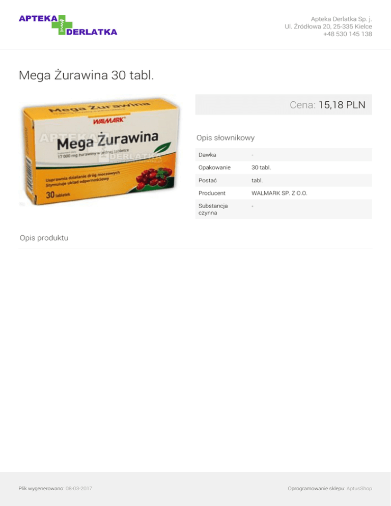 Apteka Derlatka Sp. j. Ul. Źródłowa 20, 25-335 Kielce +48 530 145 138 Mega Żurawina 30 tabl. Cena: 15,18 PLN Opis słownikowy Dawka - Opakowanie 30 tabl. Postać tabl. Producent WALMARK SP. Z O.O. Substancja czynna - Opis produktu Plik wygenerowano: 08-03-2017 Powered by TCPDF (www.tcpdf.org) Oprogramowanie sklepu: AptusShop