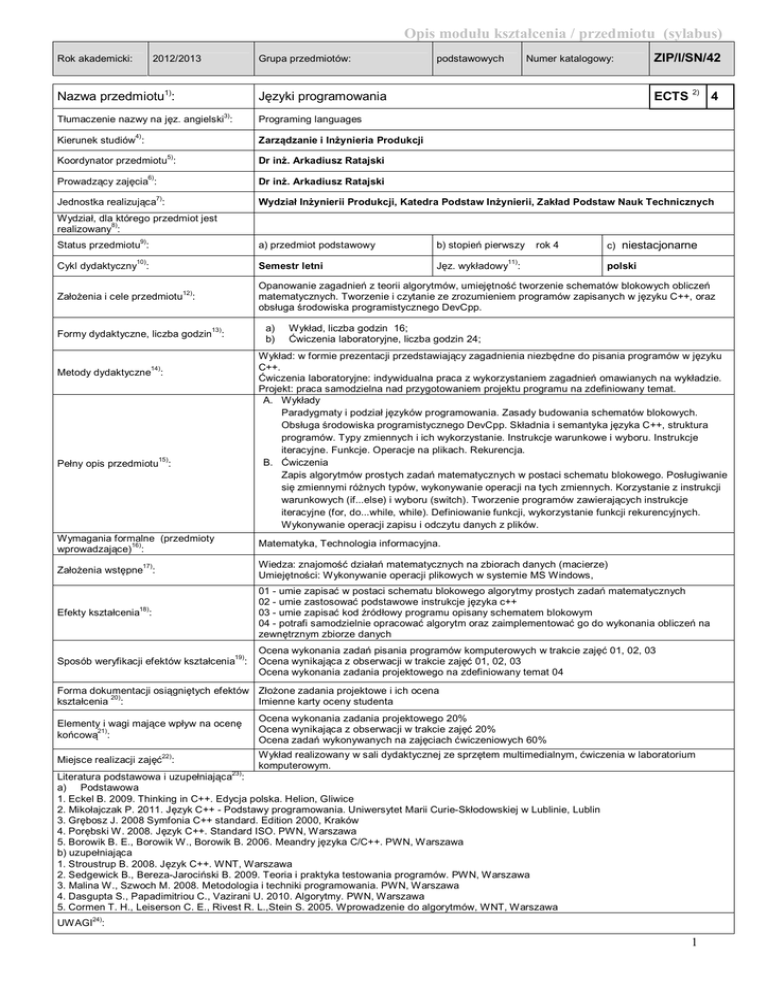 Opis modułu kształcenia / przedmiotu (sylabus) Rok akademicki: 2012/2013 Grupa przedmiotów: Nazwa przedmiotu1): podstawowych Numer katalogowy: ECTS 2) 4 Języki programowania 3) Tłumaczenie nazwy na jęz. angielski : ZIP/I/SN/42 Programing languages 4) Kierunek studiów : Zarządzanie i Inżynieria Produkcji 5) Koordynator przedmiotu : Dr inż. Arkadiusz Ratajski 6) Prowadzący zajęcia : Dr inż. Arkadiusz Ratajski 7) Jednostka realizująca : Wydział Inżynierii Produkcji, Katedra Podstaw Inżynierii, Zakład Podstaw Nauk Technicznych Wydział, dla którego przedmiot jest 8) realizowany : 9) Status przedmiotu : 10) Cykl dydaktyczny : a) przedmiot podstawowy b) stopień pierwszy Semestr letni Jęz. wykładowy : rok 4 11) c) niestacjonarne polski Opanowanie zagadnień z teorii algorytmów, umiejętność tworzenie schematów blokowych obliczeń matematycznych. Tworzenie i czytanie ze zrozumieniem programów zapisanych w języku C++, oraz obsługa środowiska programistycznego DevCpp. 12) Założenia i cele przedmiotu : a) b) 13) Formy dydaktyczne, liczba godzin : Wykład, liczba godzin 16; Ćwiczenia laboratoryjne, liczba godzin 24; Wykład: w formie prezentacji przedstawiający zagadnienia niezbędne do pisania programów w języku C++. Ćwiczenia laboratoryjne: indywidualna praca z wykorzystaniem zagadnień omawianych na wykładzie. Projekt: praca samodzielna nad przygotowaniem projektu programu na zdefiniowany temat. A. Wykłady Paradygmaty i podział języków programowania. Zasady budowania schematów blokowych. Obsługa środowiska programistycznego DevCpp. Składnia i semantyka języka C++, struktura programów. Typy zmiennych i ich wykorzystanie. Instrukcje warunkowe i wyboru. Instrukcje iteracyjne. Funkcje. Operacje na plikach. Rekurencja. B. Ćwiczenia Zapis algorytmów prostych zadań matematycznych w postaci schematu blokowego. Posługiwanie się zmiennymi różnych typów, wykonywanie operacji na tych zmiennych. Korzystanie z instrukcji warunkowych (if...else) i wyboru (switch). Tworzenie programów zawierających instrukcje iteracyjne (for, do...while, while). Definiowanie funkcji, wykorzystanie funkcji rekurencyjnych. Wykonywanie operacji zapisu i odczytu danych z plików. 14) Metody dydaktyczne : 15) Pełny opis przedmiotu : Wymagania formalne (przedmioty 16) wprowadzające) : Matematyka, Technologia informacyjna. Wiedza: znajomość działań matematycznych na zbiorach danych (macierze) Umiejętności: Wykonywanie operacji plikowych w systemie MS Windows, 17) Założenia wstępne : 01 - umie zapisać w postaci schematu blokowego algorytmy prostych zadań matematycznych 02 - umie zastosować podstawowe instrukcje języka c++ 03 - umie zapisać kod źródłowy programu opisany schematem blokowym 04 - potrafi samodzielnie opracować algorytm oraz zaimplementować go do wykonania obliczeń na zewnętrznym zbiorze danych 18) Efekty kształcenia : 19) Sposób weryfikacji efektów kształcenia : Ocena wykonania zadań pisania programów komputerowych w trakcie zajęć 01, 02, 03 Ocena wynikająca z obserwacji w trakcie zajęć 01, 02, 03 Ocena wykonania zadania projektowego na zdefiniowany temat 04 Forma dokumentacji osiągniętych efektów Złożone zadania projektowe i ich ocena 20) kształcenia : Imienne karty oceny studenta Elementy i wagi mające wpływ na ocenę 21) końcową : Ocena wykonania zadania projektowego 20% Ocena wynikająca z obserwacji w trakcie zajęć 20% Ocena zadań wykonywanych na zajęciach ćwiczeniowych 60% Wykład realizowany w sali dydaktycznej ze sprzętem multimedialnym, ćwiczenia w laboratorium komputerowym. 22) Miejsce realizacji zajęć : 23) Literatura podstawowa i uzupełniająca : a) Podstawowa 1. Eckel B. 2009. Thinking in C++. Edycja polska. Helion, Gliwice 2. Mikołajczak P. 2011. Język C++ - Podstawy programowania. Uniwersytet Marii Curie-Skłodowskiej w Lublinie, Lublin 3. Grębosz J. 2008 Symfonia C++ standard. Edition 2000, Kraków 4. Porębski W. 2008. Język C++. Standard ISO. PWN, Warszawa 5. Borowik B. E., Borowik W., Borowik B. 2006. Meandry języka C/C++. PWN, Warszawa b) uzupełniająca 1. Stroustrup B. 2008. Język C++. WNT, Warszawa 2. Sedgewick B., Bereza-Jarociński B. 2009. Teoria i praktyka testowania programów. PWN, Warszawa 3. Malina W., Szwoch M. 2008. Metodologia i techniki programowania. PWN, Warszawa 4. Dasgupta S., Papadimitriou C., Vazirani U. 2010. Algorytmy. PWN, Warszawa 5. Cormen T. H., Leiserson C. E., Rivest R. L.,Stein S. 2005. Wprowadzenie do algorytmów, WNT, Warszawa 24) UWAGI : 1 Wskaźniki ilościowe charakteryzujące moduł/przedmiot 25) : Szacunkowa sumaryczna liczba godzin pracy studenta (kontaktowych i pracy własnej) niezbędna dla osiągnięcia zakładanych efektów kształcenia18) - na tej podstawie należy wypełnić pole ECTS2: Łączna liczba punktów ECTS, którą student uzyskuje na zajęciach wymagających bezpośredniego udziału nauczycieli akademickich: Łączna liczba punktów ECTS, którą student uzyskuje w ramach zajęć o charakterze praktycznym, takich jak zajęcia laboratoryjne, projektowe, itp.: Tabela zgodności kierunkowych efektów kształcenia efektami przedmiotu Nr /symbol efektu 01 02 03 04 26) 105 h 2,0 ECTS 2,2 ECTS : Wymienione w wierszu efekty kształcenia: umie zapisać w postaci schematu blokowego algorytmy prostych zadań matematycznych umie zastosować podstawowe instrukcje języka c++ umie zapisać kod źródłowy programu opisany schematem blokowym potrafi samodzielnie opracować algorytm oraz zaimplementować go do wykonania obliczeń na zewnętrznym zbiorze danych Odniesienie do efektów dla programu kształcenia na kierunku K_U08 K_U07 K_U07 K_U15 2
