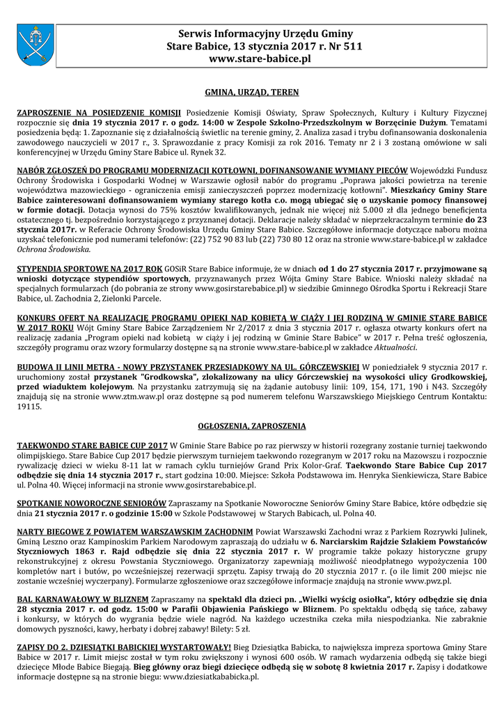 Serwis Informacyjny Urzędu Gminy Stare Babice, 13 stycznia 2017 r. Nr 511 www.stare-babice.pl GMINA, URZĄD, TEREN ZAPROSZENIE NA POSIEDZENIE KOMISJI Posiedzenie Komisji Oświaty, Spraw Społecznych, Kultury i Kultury Fizycznej rozpocznie się dnia 19 stycznia 2017 r. o godz. 14:00 w Zespole Szkolno-Przedszkolnym w Borzęcinie Dużym. Tematami posiedzenia będą: 1. Zapoznanie się z działalnością świetlic na terenie gminy, 2. Analiza zasad i trybu dofinansowania doskonalenia zawodowego nauczycieli w 2017 r., 3. Sprawozdanie z pracy Komisji za rok 2016. Tematy nr 2 i 3 zostaną omówione w sali konferencyjnej w Urzędu Gminy Stare Babice ul. Rynek 32. NABÓR ZGŁOSZEŃ DO PROGRAMU MODERNIZACJI KOTŁOWNI, DOFINANSOWANIE WYMIANY PIECÓW Wojewódzki Fundusz Ochrony Środowiska i Gospodarki Wodnej w Warszawie ogłosił nabór do programu „Poprawa jakości powietrza na terenie województwa mazowieckiego - ograniczenia emisji zanieczyszczeń poprzez modernizację kotłowni”. Mieszkańcy Gminy Stare Babice zainteresowani dofinansowaniem wymiany starego kotła c.o. mogą ubiegać się o uzyskanie pomocy finansowej w formie dotacji. Dotacja wynosi do 75% kosztów kwalifikowanych, jednak nie więcej niż 5.000 zł dla jednego beneficjenta ostatecznego tj. bezpośrednio korzystającego z przyznanej dotacji. Deklaracje należy składać w nieprzekraczalnym terminie do 23 stycznia 2017r. w Referacie Ochrony Środowiska Urzędu Gminy Stare Babice. Szczegółowe informacje dotyczące naboru można uzyskać telefonicznie pod numerami telefonów: (22) 752 90 83 lub (22) 730 80 12 oraz na stronie www.stare-babice.pl w zakładce Ochrona Środowiska. STYPENDIA SPORTOWE NA 2017 ROK GOSiR Stare Babice informuje, że w dniach od 1 do 27 stycznia 2017 r. przyjmowane są wnioski dotyczące stypendiów sportowych, przyznawanych przez Wójta Gminy Stare Babice. Wnioski należy składać na specjalnych formularzach (do pobrania ze strony www.gosirstarebabice.pl) w siedzibie Gminnego Ośrodka Sportu i Rekreacji Stare Babice, ul. Zachodnia 2, Zielonki Parcele. KONKURS OFERT NA REALIZACJĘ PROGRAMU OPIEKI NAD KOBIETĄ W CIĄŻY I JEJ RODZINĄ W GMINIE STARE BABICE W 2017 ROKU Wójt Gminy Stare Babice Zarządzeniem Nr 2/2017 z dnia 3 stycznia 2017 r. ogłasza otwarty konkurs ofert na realizację zadania „Program opieki nad kobietą w ciąży i jej rodziną w Gminie Stare Babice” w 2017 r. Pełna treść ogłoszenia, szczegóły programu oraz wzory formularzy dostępne są na stronie www.stare-babice.pl w zakładce Aktualności. BUDOWA II LINII METRA - NOWY PRZYSTANEK PRZESIADKOWY NA UL. GÓRCZEWSKIEJ W poniedziałek 9 stycznia 2017 r. uruchomiony został przystanek "Grodkowska", zlokalizowany na ulicy Górczewskiej na wysokości ulicy Grodkowskiej, przed wiaduktem kolejowym. Na przystanku zatrzymują się na żądanie autobusy linii: 109, 154, 171, 190 i N43. Szczegóły znajdują się na stronie www.ztm.waw.pl oraz dostępne są pod numerem telefonu Warszawskiego Miejskiego Centrum Kontaktu: 19115. OGŁOSZENIA, ZAPROSZENIA TAEKWONDO STARE BABICE CUP 2017 W Gminie Stare Babice po raz pierwszy w historii rozegrany zostanie turniej taekwondo olimpijskiego. Stare Babice Cup 2017 będzie pierwszym turniejem taekwondo rozegranym w 2017 roku na Mazowszu i rozpocznie rywalizację dzieci w wieku 8-11 lat w ramach cyklu turniejów Grand Prix Kolor-Graf. Taekwondo Stare Babice Cup 2017 odbędzie się dnia 14 stycznia 2017 r., start godzina 10:00. Miejsce: Szkoła Podstawowa im. Henryka Sienkiewicza, Stare Babice ul. Polna 40. Więcej informacji na stronie www.gosirstarebabice.pl. SPOTKANIE NOWOROCZNE SENIORÓW Zapraszamy na Spotkanie Noworoczne Seniorów Gminy Stare Babice, które odbędzie się dnia 21 stycznia 2017 r. o godzinie 15:00 w Szkole Podstawowej w Starych Babicach, ul. Polna 40. NARTY BIEGOWE Z POWIATEM WARSZAWSKIM ZACHODNIM Powiat Warszawski Zachodni wraz z Parkiem Rozrywki Julinek, Gminą Leszno oraz Kampinoskim Parkiem Narodowym zapraszają do udziału w 6. Narciarskim Rajdzie Szlakiem Powstańców Styczniowych 1863 r. Rajd odbędzie się dnia 22 stycznia 2017 r. W programie także pokazy historyczne grupy rekonstrukcyjnej z okresu Powstania Styczniowego. Organizatorzy zapewniają możliwość nieodpłatnego wypożyczenia 100 kompletów nart i butów, po wcześniejszej rezerwacji sprzętu. Zapisy trwają do 20 stycznia 2017 r. (o ile limit 200 miejsc nie zostanie wcześniej wyczerpany). Formularze zgłoszeniowe oraz szczegółowe informacje znajdują na stronie www.pwz.pl. BAL KARNAWAŁOWY W BLIZNEM Zapraszamy na spektakl dla dzieci pn. „Wielki wyścig osiołka”, który odbędzie się dnia 28 stycznia 2017 r. od godz. 15:00 w Parafii Objawienia Pańskiego w Bliznem. Po spektaklu odbędą się tańce, zabawy i konkursy, w których do wygrania będzie wiele nagród. Na każdego uczestnika czeka miła niespodzianka. Nie zabraknie domowych pyszności, kawy, herbaty i dobrej zabawy! Bilety: 5 zł. ZAPISY DO 2. DZIESIĄTKI BABICKIEJ WYSTARTOWAŁY! Bieg Dziesiątka Babicka, to największa impreza sportowa Gminy Stare Babice w 2017 r. Limit miejsc został w tym roku zwiększony i wynosi 600 osób. W ramach wydarzenia odbędą się także biegi dziecięce Młode Babice Biegają. Bieg główny oraz biegi dziecięce odbędą się w sobotę 8 kwietnia 2017 r. Zapisy i dodatkowe informacje dostępne są na stronie biegu: www.dziesiatkababicka.pl.