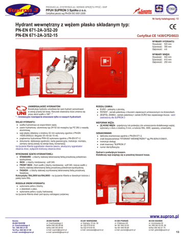 ZARZĄDZANIA SYSTEM PRODUKCJA, DYSTRYBUCJA i SERWIS SPRZĘTU PPOŻ. i BHP PPUH SUPRON 3 Spółka z o.o. Certyfikowany na zgodność z: Certyfikat jakości wg PN-EN ISO 9001:2009 PN-EN ISO 9001:2009 Nr karty katalogowej: 13 Hydrant wewnętrzny z wężem płasko składanym typ: PN-EN 671-2A-3/52-20 PN-EN 671-2A-3/52-15 Certyfikat CE 1438/CPD/0023 WYMIARY HYDRANTU: Wysokość: 520 mm Szerokość: 390 mm Głębokość: n/d WYMIARY WNĘKI: Wysokość: 540 mm Szerokość: 410 mm Głębokość: 250 mm UNIWERSALNOŚĆ HYDRANTÓW: Konstrukcja hydrantu umożliwia ten sam hydrant zamontować w wersji prawej lub lewej. Kierunek otwierania drzwi zmienia się przez obrót szafki o 180°. * * - innowacyjne rozwiązanie stosowane tylko w naszych hydrantach RODZAJ ZAMKA: · EURO - pokrętny z plombą, · PATENT - zamek patentowy z kluczem zapasowym umieszczonym na drzwiczkach, · ZESPÓŁ ZAMKA - zamek patentowy+ zamek EURO bez zapasowego klucza - wzór zastrzeżony dla SUPRON 3 SKŁAD HYDRANTU: · szafka hydrantowa ze wspornikiem węża, · zawór hydrantowy: aluminiowy typ ZH 52 lub mosiężny typ PZ 28U z nasadą aluminiową, · wąż płasko składany o średnicy 52 mm wykonany zgodnie z PN-EN 14540:2005(U) i długości 20 mb lub 15 mb, · prądownica hydrantowa PWh-52 wykonana zgodnie z PN-EN 671-2, · dokumenty: deklaracja zgodności, karta gwarancyjna, instrukcje: montażu, zamiany wersji prawej na wersje lewą, konserwacji, na życzenie Klienta sygnalizator otwarcia zaworu, akustyczny sygnalizator otwarcia drzwi, wyłącznik krańcowy otwarcia drzwi WSPORNIK WĘŻA: · [3] KOSZ WĘŻA - pojedynczy lub podwójny (do umieszczenia dodatkowego węża), wykonany z drutu o średnicy 5 mm, w kolorze RAL 3000, spawany, uniwersalny WYKONANIE SZAFKI HYDRANTOWEJ: · STANDARD - z blachy stalowej lakierowanej farbą proszkową poliestrowoepoksydową · INOX - z blachy nierdzewnej - szlif 240, · FRONT INOX - front szafki z blachy nierdzewnej - szlif 240, korpus szafki z blachy stalowej lakierowanej farbą proszkową poliestrowo-epoksydową · FASADA - z blachy stalowej ocynkowanej lakierowanej farbą proszkową fasadową Kolorystyka: RAL3000 lub RAL9003 - na życzenie Klienta w dowolnym kolorze z palety barw RAL OZNAKOWANIE: · tabliczka znamionowa zgodnie z PN-EN 671-2, · znak bezpieczeństwa "HYDRANT WEWNĘTRZNY" wg PN-92/N-01256/01, · instrukcja obsługi, · znak towarowy "SUPRON 3" · numer identyfikacyjny Hydrant z podwójnym koszem. Dodatkowy wąż znajduję się w przedniej kieszeni kosza. RODZAJE DRZWI HYDRANTU: · wykonanie pełne z blachy, · z okienkiem z plexi, · wykonanie pełne z szyby hartowanej na życzenie Klienta otwór pod ręczny ostrzegacz pożarowy www.supron.pl Serwis: 26-600 RADOM ul. Czachowskiego 4 Tel.: 048 363 21 85 Tel./Fax: 048 363 21 86 e-mail: [email protected] 26-600 RADOM ul. Czachowskiego 4 tel/fax 048 363 89 98 tel/fax 048 363 99 65 e-mail: [email protected] e-mail: [email protected] 03-481 WARSZAWA ul. Szanajcy 16 lok. 56 tel. 022 618 93 63 fax 022 619 80 05 e-mail: [email protected] 61-003 POZNAŃ ul. Chlebowa 4/8 tel. 061 842 23 00 fax 061 840 06 88 e-mail: [email protected] 80-530 GDAŃSK ul. Uczniowska 52 tel. 058 340 03 55, 56 tel/fax 058 342 91 75 e-mail: [email protected] 13 WŁAŚCIWOŚCI HYDRAULICZNE Ciśnienie robocze: od 0,2 MPa do 0,7 MPa Prąd wody rozproszony stożkowy - nie mniejszy niż 45 stopni. UWAGA: Zależność natężenia przepływu Q od ciśnienia P przedstawia równanie: Q=K 10P, gdzie Q wyraża się w litrach/minutę,a P w megapaskalach. PRZYKŁADY NAWINIĘCIA WĘŻA: (TYP WSPORNIKA WĘŻA) [1] [2] WĄŻ NAWINIĘTY NA ZWIJADLE [3] WĄŻ UŁOŻONY WARSTWOWO WĄŻ ZWINIĘTY W PODWÓJNY KRĄG I UMIESZCZONY W KOSZU PRZYKŁADY WYKONANIA SZAFEK STANDARD INOX FRONT INOX FASADA szafka przykładowa - kolor RAL 3000 szafka przykładowa - szlif 240 szafka przykładowa - szlif 240 szafka przykładowa - kolor RAL 9006 RODZAJ ZAMKA EURO PATENT ZESPÓŁ ZAMKA