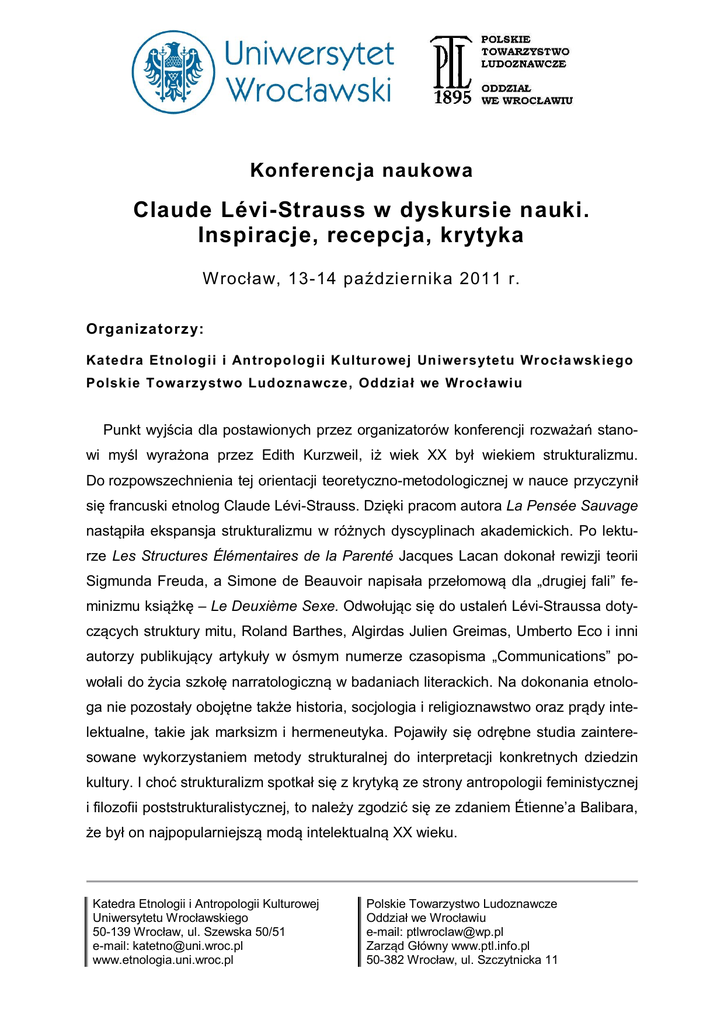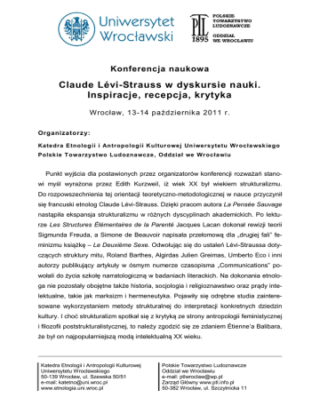 Konferencja naukowa Claude Lévi-Strauss w dyskursie nauki. Inspiracje, recepcja, krytyka W rocław, 13-14 października 2011 r. Organizatorzy: Katedra Etnolog ii i An tropo log ii K ultur owej Un iwersytetu Wr ocła wsk iego Polsk ie T owarzyst wo Lud oznawcze, Oddział we Wr ocławiu Punkt wyjścia dla postawionych przez organizatorów konferencji rozważań stanowi myśl wyrażona przez Edith Kurzweil, iż wiek XX był wiekiem strukturalizmu. Do rozpowszechnienia tej orientacji teoretyczno-metodologicznej w nauce przyczynił się francuski etnolog Claude Lévi-Strauss. Dzięki pracom autora La Pensée Sauvage nastąpiła ekspansja strukturalizmu w różnych dyscyplinach akademickich. Po lekturze Les Structures Élémentaires de la Parenté Jacques Lacan dokonał rewizji teorii Sigmunda Freuda, a Simone de Beauvoir napisała przełomową dla „drugiej fali” feminizmu książkę – Le Deuxième Sexe. Odwołując się do ustaleń Lévi-Straussa dotyczących struktury mitu, Roland Barthes, Algirdas Julien Greimas, Umberto Eco i inni autorzy publikujący artykuły w ósmym numerze czasopisma „Communications” powołali do życia szkołę narratologiczną w badaniach literackich. Na dokonania etnologa nie pozostały obojętne także historia, socjologia i religioznawstwo oraz prądy intelektualne, takie jak marksizm i hermeneutyka. Pojawiły się odrębne studia zainteresowane wykorzystaniem metody strukturalnej do interpretacji konkretnych dziedzin kultury. I choć strukturalizm spotkał się z krytyką ze strony antropologii feministycznej i filozofii poststrukturalistycznej, to należy zgodzić się ze zdaniem Étienne’a Balibara, że był on najpopularniejszą modą intelektualną XX wieku. Katedra Etnologii i Antropologii Kulturowej Uniwersytetu Wrocławskiego 50-139 Wrocław, ul. Szewska 50/51 e-mail: [email protected] www.etnologia.uni.wroc.pl Polskie Towarzystwo Ludoznawcze Oddział we Wrocławiu e-mail: [email protected] Zarząd Główny www.ptl.info.pl 50-382 Wrocław, ul. Szczytnicka 11 W związku ze zbliżającą się drugą rocznicą śmierci Lévi-Straussa zapraszamy Państwa do wzięcia udziału w konferencji naukowej poświęconej twórczości wybitnego etnologa. Pragniemy by tematem konferencji, prócz dorobku Lévi-Straussa, stał się namysł nad zasięgiem oddziaływania strukturalizmu w dyskursie nauki. Dlatego też zaproszenie kierujemy nie tylko do etnologów, lecz także do przedstawicieli innych dyscyplin naukowych. Podczas konferencji chcielibyśmy zastanowić się dodatkowo nad ograniczeniami strukturalizmu i podejmowanymi aktualnymi próbami ich przezwyciężania. Konferencja odbędzie się w dniach 13 i 14 października 2011 r. w Katedrze Etnologii i Antropologii Kulturowej Uniwersytetu Wrocławskiego. Bardzo prosimy o nadsyłanie propozycji tematów referatów wraz z abstraktem do 15 lipca 2011 r. na adres: [email protected]. Referaty zostaną opublikowane w specjalnym numerze „Zeszytów Etnologii Wrocławskiej”, www.zew.info.pl. Opłata konferencyjna wynosi 100 zł i obejmuje materiały konferencyjne, catering oraz uroczystą kolację w pierwszym dniu konferencji. Szczegółowe informacje dotyczące konferencji zostaną przesłane pocztą elektroniczną po otrzymaniu formularza zgłoszeniowego. W imieniu organizatorów, dr Michał Mokrzan [email protected] dr Mirosław Marczyk [email protected] Katedra Etnologii i Antropologii Kulturowej Uniwersytetu Wrocławskiego 50-139 Wrocław, ul. Szewska 50/51 e-mail: [email protected] www.etnologia.uni.wroc.pl Polskie Towarzystwo Ludoznawcze Oddział we Wrocławiu e-mail: [email protected] Zarząd Główny www.ptl.info.pl 50-382 Wrocław, ul. Szczytnicka 11