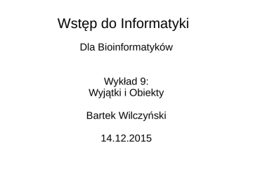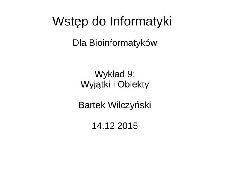 Wstęp do Informatyki Dla Bioinformatyków Wykład 9: Wyjątki i Obiekty Bartek Wilczyński 14.12.2015 Plan na dziś ● Słów kilka o historii jezyków obiektowych ● Wszystko w pythonie jest obiektem ● Klasy a typy (Jak rozpoznać typa wśród klasy?) ● O problemach dziedziczenia ● Metody specjalne i operatory ● O sprawach prywatnych i publicznych ● Sytuacje wyjątkowe nie są wcale takie wyjątkowe Kilka nazw z historii ● ● ● ● Simula 67 - Ole-Johan Dahl, Kristen Nygaard, rozszerzenie języka Algol 60 Bezpośredni wpływ na języki strukturalnoobiektowe tj. C++ (1979,1983), Java (1995), itp. Równolegle rozwój dynamicznych języków obiektowych: Smalltalk (1972,1980), Eiffel (1985) Obecnie także bardzo popularne są języki skryptowe czerpiące z obu wzorców: python (1991) i ruby (1995) Obiekty w pythonie ● ● ● ● Mówiliśmy o różnych typach wartości w pythonie: liczby, napisy, słowniki, listy, wyrażenia regularne, etc. pamiętamy, że zmienne nie mają typu, ale wartości tak Okazuje się, że typy zmiennych też mają swój typ – są klasami Klasy z kolei są obiektami typu type (kto jeszcze się nie zgubił?) Jak sprawdzić typa? ● ● ● ● Możemy używać funkcji wbudowanej type np: type(5)->int, type(“ala”)->str, type([1])->list Co ciekawe, typy zmiennych mają też swój typ: type(int)->type, type(str)->type, type(type)->type Zwróćmy uwagę zwłaszcza na tę ostatnią linijkę: type(type)==type. Czy to nie za dużo typów? No i jak to działa, że wywołujemy te typy zupełnie jak funkcje? Skąd obiekty wiedzą jakiego są typu? ● Przyjrzyjmy się atrybutowi __class__: ● Przy okazji zauważmy nowe słowo atrybut Obiekty, atrybuty, metody ● Każdy obiekt ma swoją przestrzeń nazw ● Jeśli atrybut jest funkcją nazywamy go metodą Co prywatne, co publiczne ● Atrybuty rozpoczynające się od __ uważane są za prywatne, ale w pythonie jest to tylko konwencja Czy możemy stworzyć nową klasę? ● Możemy teraz użyć klasy Kwadrat, żeby stworzyć instancję k: Co się dzieje z atrybutami instancji? ● Zaczynamy z atrybutem bok=1 w klasie Kwadrat Coś o dziedziczeniu ● Klasy mogą dziedziczyć po sobie atrybuty I metody Używanie instancji podklas ● Używając podklas, możemy liczyć pola różnych figur Specjalna metoda __init__ ● Metoda __init__(self, ….) pozwala na inicjowanie instancji: ● Możemy to wykorzystać do inicjalizacji wartości: ● I potem tego użyć: Dziedziczenie z wielu stron ● ● ● Możemy dziedziczyć z wielu klas Dzięki temu dziedziczymy atrybuty i metody ze wszystkich nadklas Kolejność dziedziczenia ma znaczenie Sytuacje wyjątkowe ● ● Możemy reagować na sytuacje “wyjątkowe” poprzez przechwytywanie wyjątków Możemy też zgłaszać wyjątki Podsumowanie - obiekty ● ● ● ● Klasy są uogólnieniem typu obiektów, a instancje są w pewnym sensie uogólnieniem wartości Atrybuty i metody(atrybuty funkcyjne) są definiowane na poziomie klasy a używane zwykle na poziomie instancji Prywatne atrybuty mają nazwy rozpoczynające się od __ i niepowinny być wywoływane spoza danej definicji klasy (w pythonie jest to konwencja) Dziedziczenie pomiędzy klasami pozwala na używanie w podklasach atrybutów i metod zdefiniowanych w nadklasie Hierarchia wyjątków w pythonie Podsumowanie - wyjątki ● ● ● ● ● ● Możemy zgłaszać wyjątki różnych rodzajów przy pomocy raise Te wyjątki mogą być “chwytane” przy pomocy klauzuli try: … except: …. w sposób specyficzny (z podaniem typu wyjątku lub bez) Ten proces działa kaskadowo, jeśli jedna klauzula try nie złapała tego konkretnego wyjątku jest on przekazywany “wyżej” Wyjątki “nie złapane” powodują zakończenie programu Można konstruować własne klasy dziedziczące z istniejących klas wyjątków Można chwytać nadklasy wyjątków np. except ArtithmeticError:
