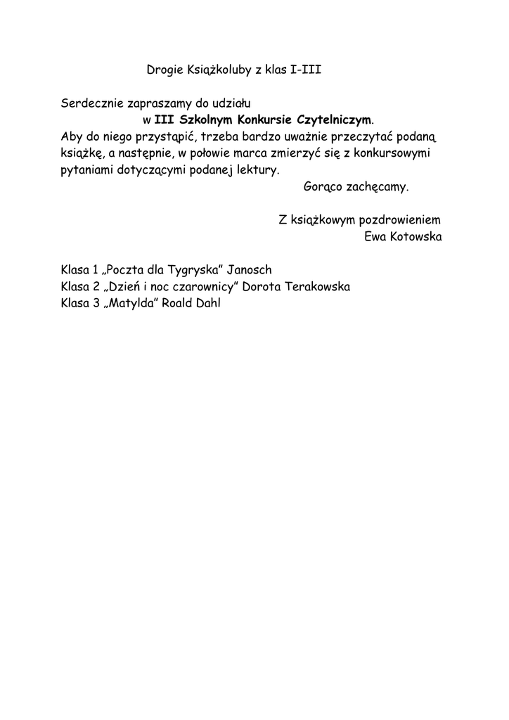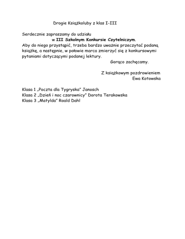 Drogie Książkoluby z klas I-III Serdecznie zapraszamy do udziału w III Szkolnym Konkursie Czytelniczym. Aby do niego przystąpić, trzeba bardzo uważnie przeczytać podaną książkę, a następnie, w połowie marca zmierzyć się z konkursowymi pytaniami dotyczącymi podanej lektury. Gorąco zachęcamy. Z książkowym pozdrowieniem Ewa Kotowska Klasa 1 „Poczta dla Tygryska” Janosch Klasa 2 „Dzień i noc czarownicy” Dorota Terakowska Klasa 3 „Matylda” Roald Dahl