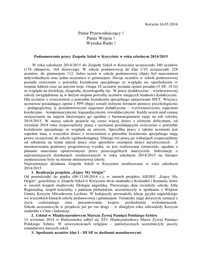 Korycin 16.05.2016 Panie Przewodniczący ! Panie Wójcie ! Wysoka Rado ! Podsumowanie pracy Zespołu Szkół w Korycinie w roku szkolnym 2014/2015 W roku szkolnym 2014/2015 do Zespołu Szkół w Korycinie uczęszczało 340 uczniów (176 chłopców, 164 dziewcząt). W szkole podstawowej do klas I-VI uczęszczało 228 uczniów, do gimnazjum 112. Jeden uczeń w szkole podstawowej objęty był nauczaniem indywidualnym oraz jedna uczennica w gimnazjum. Dwoje uczniów w szkole podstawowej posiada orzeczenie o potrzebie kształcenia specjalnego ze względu na: upośledzenie w stopniu lekkim oraz na autyzm troje. Grupa 18 uczniów posiada opinie poradni (5 SP, 18 G) ze względu na dysleksję, dysgrafię, dysortografię itp. W pracy dydaktyczno – wychowawczej szkoły uwzględnione są w dużym stopniu potrzeby uczniów mających trudności dydaktyczne. Dla uczniów z orzeczeniem o potrzebie kształcenia specjalnego opracowano IPET. Wszyscy uczniowie posiadający opinie z PPP objęci zostali różnymi formami pomocy psychologiczno – pedagogicznej, tj. przedmiotowymi zajęciami dydaktyczno – wyrównawczymi, zajęciami korekcyjno – kompensacyjnymi, logopedycznymi, rewalidacyjnymi. Każdy uczeń miał szansę uczęszczania na zajęcia interesujące go zgodnie z harmonogramem zajęć na rok szkolny 2014/2015. W naszej szkole pojawia się coraz więcej dzieci z różnymi deficytami, od września 2014 roku rozpoczęliśmy pracę z uczniami posiadającymi orzeczenie o potrzebie kształcenia specjalnego ze względu na autyzm. Specyfika pracy z takimi uczniami jest zupełnie inna, a wszystkie dzieci z orzeczeniem o potrzebie kształcenia specjalnego mają prawo uczęszczać do szkoły ogólnodostępnej. Dlatego też pracę po wakacjach rozpoczęliśmy od szkolenia na temat metod pracy oraz sposobów oceniania dzieci autystycznych. Z monitorowania podstawy programowej wynika, że jest realizowana rytmicznie, zgodnie z planami nauczania opracowanymi przez poszczególnych nauczycieli. Informacje o najważniejszych działaniach zrealizowanych w roku szkolnym 2014/2015 na bieżąco zamieszczane były na stronie internetowej szkoły. Najważniejsze działania Zespołu Szkół w Korycinie zrealizowane w roku szkolnym 2014/2015 1. Realizacja projektu „Enjoy My Origin” Od poniedziałki do piątku (08-12.09.2014 r.), w ramach projektu AIESEC „Enjoy My Origin”, gościliśmy w Zespole Szkół w Korycinie dwie studentki z Kolumbii i Rumunii, które w swoich krajach studiowały filologię angielską. Pierwszego dnia zwiedziły szkołę, Izbę Regionalną, zespół kościelny z parkiem plebańskim, uczestniczyły w spotkaniu z Wójtem Gminy Korycin Mirosławem Lechem. W kolejnych, prowadziły lekcje języka angielskiego we wszystkich klasach szkoły podstawowej i gimnazjum. Tematyka zajęć dotyczyła sytuacji z życia codziennego oraz prezentowania krajów pochodzenia wolontariuszek. Szkoła uczestniczyła w projekcie już po raz drugi – w ubiegłym roku odwiedziły Korycin studentki z Chin i Indonezji. 2. Udział w Międzynarodowym Marszu Żywej Pamięci Polskiego Sybiru 12 września 2014 w Białymstoku odbył się XIV Międzynarodowy Marsz Żywej Pamięci Polskiego Sybiru. W uroczystościach religijno - patriotycznych uczestniczyły poczty sztandarowe naszych szkół. 3. Spotkanie uczniów klas I - III SP ze służbami mundurowymi 18 września 2014 uczniowie klas I - III uczestniczyli w spotkaniu z policjantami Komendy Powiatowej w Sokółce i Posterunku Policji w Janowie oraz strażakami OSP w Korycinie. Wszystko w ramach akcji "Bezpieczna droga do szkoły/domu". Mundurowi przypominali najmłodszym podstawowe zasady bezpieczeństwa w ruchu drogowym oraz codziennym życiu, a także wręczali serduszka w związku z kampanią "Kochasz? Powiedz STOP Wariatom drogowym". Nie obyło się bez prezentacji motocykla i samochodu policyjnego, wozu strażackiego oraz pokazu tresury psa. 4. Podsumowanie ogólnopolskich konkursów organizowanych przez Towarzystwo Gimnazjów Poszukujących z Małych Miast i Wsi W dniu 29.09.2014 r. uczniowie - laureaci oraz troje nauczycieli uczestniczyło w uroczystym podsumowaniu ogólnopolskich konkursów organizowanych przez TGPzMMiW Wydarzenie miało miejsce w Sali Kolumnowej w budynku Sejmu Rzeczypospolitej. Izabela Jurguć z kl. IIIB zajęła trzecie miejsce w konkursie literackim "Świat wiejskich wartości źródłem mojego wzrastania" oraz Weronika Wiesławska i Basia Minczewska uczennice kl. IIIA - obie uzyskały wyróżnienie w w/w konkursie. Natomiast Urszula Kopciewska i Dominika Kosiło otrzymały wyróżnienie za pracę naukowo - badawczą. Dyrektor oraz nauczyciele pod kierunkiem, których powstałe te prace otrzymali podziękowania. Nagrodzone prace opublikowane zostały w tomie "Młodzież wobec wartości wiejskich" oraz "Praca naukowo - badawcza gimnazjalisty". Wiceminister Tadeusz Sławecki podkreślił znaczenie roli rodziców, opiekunów i wychowawców, którzy jako pierwsi swoją postawą kreują wzorce swoich podopiecznych, a tym samym mają wpływ na postrzeganie przez nich świata. Dodał również, że młodzież potrafi we wspaniały sposób wykorzystać walory środowiska wiejskiego, przy tworzeniu oryginalnych pracy badawczych, literackich i artystycznych. Ponadto zapewnił o stałym wsparciu wszelkich działań mających na celu wychowanie ku wartościom wiejskim i ochronę dziedzictwa kulturowego wsi. 5. Udział w ogólnopolskiej akcji pod hasłem „Śniadanie Daje Moc" W dniu 7 listopada 2014 roku z okazji Europejskiego Dnia Zdrowego Jedzenia i Gotowania klasy I-III Szkoły Podstawowej przystąpiły do ogólnopolskiej akcji pod hasłem „Śniadanie Daje Moc”. W salach od samego rana trwały przygotowania do wspólnego śniadania. Przy pięknie udekorowanych stołach uczestnicy projektu z dużym apetytem zjedli pożywne kanapki, których uzupełnieniem były zdrowe owoce i soki owocowo - warzywne. Celem programu jest uświadomienie, że śniadan