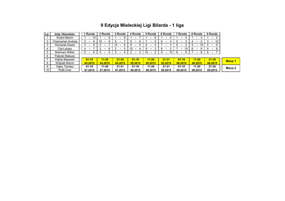9 Edycja Mieleckiej Ligi Bilarda - 1 liga Lp. 1 2 3 4 5 6 7 8 9 10 Imię i Nazwisko Wydro Marcin Chalczyński Andrzej Romanek Dawid Cija Łukasz Mamcarz Wiktor Paterak Mateusz Kalicki Sławomir Wójciak Marcin Gajny Tomasz Walk-Over 1 Runda 1 - 10 2 - 9 3 - 8 4 - 7 5 - 6 2 Runda 1 - 9 10 - 8 2 - 7 3 - 6 4 - 5 3 Runda 1 - 8 9 - 7 10 - 6 2 - 5 3 - 4 4 Runda 1 - 7 8 - 6 9 - 5 10 - 4 2 - 3 5 Runda 1 - 6 7 - 5 8 - 4 9 - 3 10 - 2 6 Runda 1 - 5 6 - 4 7 - 3 8 - 2 9 - 10 7 Runda 1 - 4 5 - 3 6 - 2 7 - 10 8 - 9 8 Runda 1 - 3 4 - 2 5 - 10 6 - 9 7 - 8 9 Runda 1 - 2 3 - 10 4 - 9 5 - 8 6 - 7 01-10 04.2015 01-10 07.2015 11-20 04.2015 11-20 07.2015 21-30 04.2015 21-31 07.2015 01-10 05.2015 01-10 08.2015 11-20 05.2015 11-20 08.2015 21-31 05.2015 21-31 08.2015 01-10 06.2015 01-10 09.2015 11-20 06.2015 11-20 09.2015 21-30 06.2015 21-30 09.2015 Mecz 1 Mecz 2