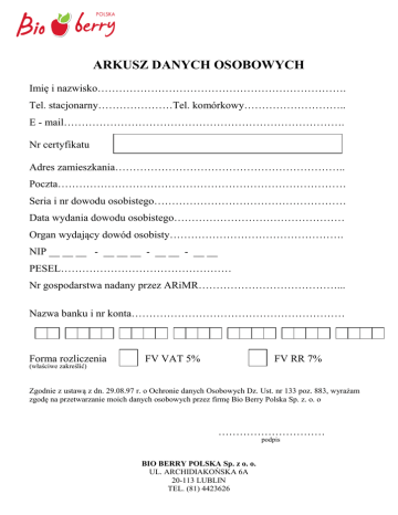 ARKUSZ DANYCH OSOBOWYCH Imię i nazwisko……………………………………………………………. Tel. stacjonarny…………………Tel. komórkowy……………………….. E - mail……………………………………………………………………. Nr certyfikatu Adres zamieszkania……………………………………………………….. Poczta……………………………………………………………………… Seria i nr dowodu osobistego……………………………………………… Data wydania dowodu osobistego………………………………………… Organ wydający dowód osobisty…………………………………………. NIP __ __ __ - __ __ __ - __ __ - __ __ PESEL………………………………………… Nr gospodarstwa nadany przez ARiMR…………………………………... Nazwa banku i nr konta…………………………………………………… Forma rozliczenia (właściwe zakreślić) FV VAT 5% FV RR 7% Zgodnie z ustawą z dn. 29.08.97 r. o Ochronie danych Osobowych Dz. Ust. nr 133 poz. 883, wyrażam zgodę na przetwarzanie moich danych osobowych przez firmę Bio Berry Polska Sp. z. o. o ………………………… podpis BIO BERRY POLSKA Sp. z o. o. UL. ARCHIDIAKOŃSKA 6A 20-113 LUBLIN TEL. (81) 4423626