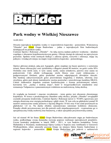 środa, 14 września 2011 www.ebuilder.pl Park wodny w Wielkiej Nieszawce 14.09.2011 Otwarto największy kompleks wodny w województwie kujawsko - pomorskim. Wykonawcą "Olendra" jest Alstal Grupa Budowlana – jedna z największych firm budowlanych działających na polskim rynku. Centrum Sportu i Rekreacji „Olender" - bo taką nazwę nadano parkowi wodnemu - idealnie współgra z obszarem krajobrazotwórczym gminy. Oferuje dostęp do rekreacji na najwyższym poziomie. Spełnia wiele istotnych funkcji z zakresu sportu, rozrywki i rekreacji, stając się jednym z wiodących miejsc na mapie województwa kujawsko - pomorskiego. Oprócz głównej atrakcji, jaką jest Aquapark, gdzie znajduje się basen sportowy z sześcioma torami, basen rekreacyjny oraz zjeżdżalnię o długości ponad 80 metrów, na gości czeka SPA Orchidea oraz strefa saun, w tym: sauny suche, sauna solankowa, parowa oraz sauna na podczerwień. Cały obiekt wzbogacają: strefa fitness oraz część relaksacyjna z podgrzewanymi fotelami, gdzie posłuchać można odprężających dźwięków muzyki. Dla bardziej zaktywizowanych gości przewidziano kręgielnię z klubem, siłownię oraz strzelnicę, gdzie pod okiem instruktorów można postrzelać z prawdziwego karabinu HK416. Całość znakomicie dopełnia centrum konferencyjnie z trzema przestronnymi salami, kawiarnia tzw. „suchej i mokrej stopy", hotel w trzygwiazdkowym standardzie oraz restauracja Tulipanowa z panoramicznym widokiem na malowniczą, leśną okolicę. Ze względu na lesistość i znaczne zwydmienie - teren gminy jest obszarem chronionego krajobrazu. W trosce o proekologiczny charakter całej okolicy, projekt „Olendra" uwzględnił czynniki przyjazne środowisku. Centrum Sportu i Rekreacji nawet w 70-80% ogrzewany jest energią słoneczną oraz energią pochodzącą z głębi ziemi. W tym celu na głębokości ponad 50 metrów umieszczono sondy pionowe o łącznej długości 10 km oraz 4 km sond poziomych na głębokości 1,8 m. Na dachu obiektu zamontowano natomiast kolektory słoneczne. Ponadto obiekt przystosowany jest dla potrzeb osób niepełnosprawnych - wyposażono go w specjalistyczną windę osobową oraz basenową, a także specjalnie przystosowaną szatnię. Już od niemal 40 lat firma Alstal Grupa Budowlana zdecydowanie stąpa po budowlanym rynku, podkreślając swoją dynamikę rozwoju poprzez realizacje największych projektów. Liczne kontrakty podpisane w latach 2009 - 2011, w tym budowa kompleksu Termy Maltańskie w Poznaniu, modernizacja Opery Leśnej w Sopocie oraz Amfiteatru w Gorzowie Wielkopolskim, silnie umocniły pozycję Grupy na miejscu lidera branży budowlanej w regionie kujawsko - pomorskim. Alstal Grupa Budowlana jest jednym z najlepszych specjalistów w budowie basenów i parków wodnych. W 2011 roku odda do użytku dwa Aquaparki oraz 3 kryte pływalnie, każda z częścią rekreacyjną. Aktualnie firma jest w trakcie realizacji Term Maltańskich w Poznaniu, największego Aquaparku w Polsce i drugiego, co do wielkości w Europie.