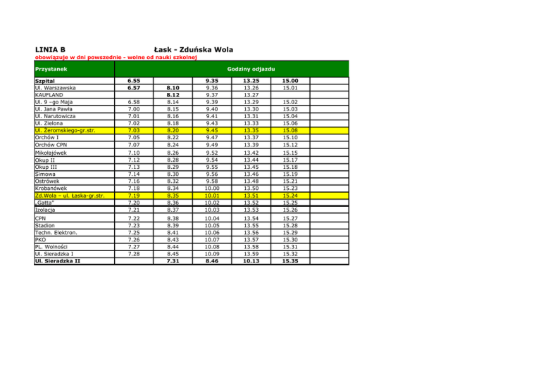 LINIA B Łask - Zduńska Wola obowiązuje w dni powszednie - wolne od nauki szkolnej Przystanek Godziny odjazdu Szpital Ul. Warszawska KAUFLAND Ul. 9 –go Maja Ul. Jana Pawła Ul. Narutowicza Ul. Zielona Ul. Żeromskiego-gr.str. Orchów I Orchów CPN 6.55 6.57 9.35 9.36 9.37 9.39 9.40 9.41 9.43 9.45 9.47 9.49 13.25 13.26 13.27 13.29 13.30 13.31 13.33 13.35 13.37 13.39 15.00 15.01 6.58 7.00 7.01 7.02 7.03 7.05 7.07 8.10 8.12 8.14 8.15 8.16 8.18 8.20 8.22 8.24 Mikołajówek Okup II Okup III Simowa Ostrówek Krobanówek Zd.Wola – ul. Łaska-gr.str. „Gatta” Izolacja 7.10 7.12 7.13 7.14 7.16 7.18 7.19 7.20 7.21 8.26 8.28 8.29 8.30 8.32 8.34 8.35 8.36 8.37 9.52 9.54 9.55 9.56 9.58 10.00 10.01 10.02 10.03 13.42 13.44 13.45 13.46 13.48 13.50 13.51 13.52 13.53 15.15 15.17 15.18 15.19 15.21 15.23 15.24 15.25 15.26 CPN Stadion Techn. Elektron. PKO PL. Wolności Ul. Sieradzka I Ul. Sieradzka II 7.22 7.23 7.25 7.26 7.27 7.28 8.38 8.39 8.41 8.43 8.44 8.45 7.31 10.04 10.05 10.06 10.07 10.08 10.09 8.46 13.54 13.55 13.56 13.57 13.58 13.59 10.13 15.27 15.28 15.29 15.30 15.31 15.32 15.35 15.02 15.03 15.04 15.06 15.08 15.10 15.12