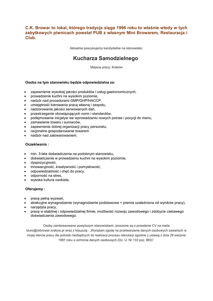 C.K. Browar to lokal, którego tradycja sięga 1996 roku to właśnie wtedy w tych zabytkowych piwnicach powstał PUB z własnym Mini Browarem, Restauracja i Club. Aktualnie poszukujemy kandydatów na stanowisko: Kucharza Samodzielnego Miejsce pracy: Kraków Osoba na tym stanowisku będzie odpowiedzialna za: zapewnienie wysokiej jakości produktów i usług gastronomicznych, prowadzenie kuchni na wysokim poziomie, nadzór nad procedurami GMP/GHP/HACCP, umiejętność kierowania pracą własną i zespołu, nadzorowanie jakości serwowanych dań, przestrzeganie obowiązujących norm i standardów, podejmowanie inicjatyw we wprowadzaniu nowych potraw i pozycji do menu, zamawianie towaru i surowców, zapewnienie dobrej organizacji pracy personelu, racjonalne gospodarowanie towarem nadzór nad zatowarowaniem. Oczekiwania : min. 3-lata doświadczenia na podobnym stanowisku, doświadczenie w prowadzeniu kuchni na wysokim poziomie, dyspozycyjność, innowacyjność, kreatywność i pomysłowość, odpowiedzialność i chęć do pracy, odporność na stres, wysoka kultura osobista. Oferujemy : pracę pełną wyzwań, atrakcyjne wynagrodzenie (wynagrodzenie podstawowe + premia uzależniona od wyników pracy), narzędzia pracy, pracę w stabilnej i odpowiedzialnej firmie, możliwość rozwoju zawodowego i zdobycie ciekawego doświadczenia zawodowego. Osoby zainteresowane powyższym stanowiskiem, proszone są o przesłanie CV na meila [email protected] wraz z klauzulą : „Wyrażam zgodę na przetwarzanie danych osobowych zawartych w mojej ofercie pracy dla potrzeb niezbędnych do realizacji procesu rekrutacji zgodnie z ustawą z dnia 29 sierpnia 1997 roku o ochronie danych osobowych (Dz. U. Nr 133 poz. 883)”.
