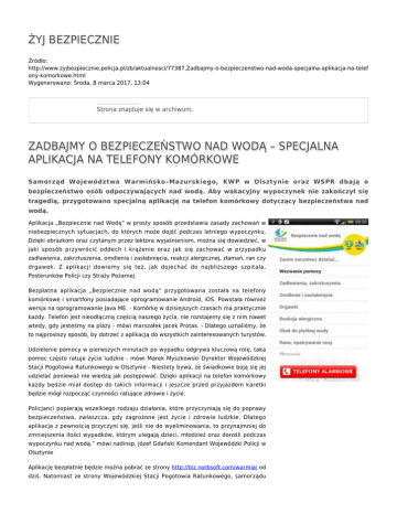 ŻYJ BEZPIECZNIE Źródło: http://www.zyjbezpiecznie.policja.pl/zb/aktualnosci/77387,Zadbajmy-o-bezpieczenstwo-nad-woda-specjalna-aplikacja-na-telef ony-komorkowe.html Wygenerowano: Środa, 8 marca 2017, 13:04 Strona znajduje się w archiwum. ZADBAJMY O BEZPIECZEŃSTWO NAD WODĄ – SPECJALNA APLIKACJA NA TELEFONY KOMÓRKOWE Samorząd Województwa Warmińsko–Mazurskiego, KWP w Olsztynie oraz WSPR dbają o bezpieczeństwo osób odpoczywających nad wodą. Aby wakacyjny wypoczynek nie zakończył się tragedią, przygotowano specjalną aplikację na telefon komórkowy dotyczący bezpieczeństwa nad wodą. Aplikacja „Bezpiecznie nad Wodą” w prosty sposób przedstawia zasady zachowań w niebezpiecznych sytuacjach, do których może dojść podczas letniego wypoczynku. Dzięki obrazkom oraz czytanym przez lektora wyjaśnieniom, można się dowiedzieć, w jaki sposób przywrócić oddech i krążenie oraz jak się zachować w przypadku zadławienia, zakrztuszenia, omdlenia i zasłabnięcia, reakcji alergicznej, złamań, ran czy drgawek. Z aplikacji dowiemy się też, jak dojechać do najbliższego szpitala, Posterunków Policji czy Straży Pożarnej. Bezpłatna aplikacja „Bezpiecznie nad wodą” przygotowana została na telefony komórkowe i smartfony posiadające oprogramowanie Android, iOS. Powstała również wersja na oprogramowanie Java ME. - Komórkę w dzisiejszych czasach ma praktycznie każdy. Telefon jest nieodłączną częścią naszego życia, nie rozstajemy się z nim nawet wtedy, gdy jesteśmy na plaży - mówi marszałek Jacek Protas. - Dlatego uznaliśmy, że to najprostszy sposób, by dotrzeć z aplikacją do wszystkich zainteresowanych turystów. Udzielenie pomocy w pierwszych minutach po wypadku odgrywa kluczową rolę, taka pomoc często ratuje życie ludzkie - mówi Marek Myszkowski Dyrektor Wojewódzkiej Stacji Pogotowia Ratunkowego w Olsztynie - Niestety bywa, że świadkowie boją się jej udzielać ponieważ nie wiedzą jak postępować. Dzięki aplikacji na telefon komórkowy każdy będzie miał dostęp do takich informacji i jeszcze przed przyjazdem karetki będzie mógł rozpocząć czynności ratujące zdrowie i życie. Policjanci popierają wszelkiego rodzaju działania, które przyczyniają się do poprawy bezpieczeństwa, zwłaszcza, gdy zagrożone jest życie i zdrowie ludzkie. Dlatego aplikacja z pewnością przyczyni się, jeśli nie do wyeliminowania, to przynajmniej do zmniejszenia ilości wypadków, którym ulegają dzieci, młodzież oraz dorośli podczas wypoczynku nad wodą.” mówi nadinsp. Józef Gdański Komendant Wojewódzki Policji w Olsztynie Aplikację bezpłatnie będzie można pobrać ze strony http://biz.norbsoft.com/warmia/ od dziś. Natomiast ze strony Wojewódzkiej Stacji Pogotowia Ratunkowego, samorządu województwa oraz Komendy Wojewódzkiej Policji od najbliższego weekendu (wersja na telefony z system Android oraz Java). Wersja aplikacji na iPhona będzie dostępna za kilka dni z App Store. Aplikacja zostanie też rozesłana do mediów, samorządów lokalnych, pozostałych służb, szkół oraz organizacji turystycznych z prośbą o zamieszczanie na stronach internetowych i dystrybucję. Aplikacja będzie również dostępna w sklepach Google Play, Nokia Ovi Store. Inicjatorem projektu jest Wojewódzka Stacja Pogotowia Ratunkowego oraz samorząd województwa warmińsko-mazurskiego, który finansuje jego realizację. W rozpowszechnianie aplikacji aktywnie włączyła się Komenda Wojewódzka Policji w Olsztynie. Wykonawcą aplikacji jest warszawska firma Norbsoft Sp. z o.o., natomiast głosu użyczył Cezary Ilczyna, aktor olsztyńskiego Teatru im. Stefana Jaracza. (KWP w Olsztynie / pt) Ocena: 5/5 (2) Tweetnij