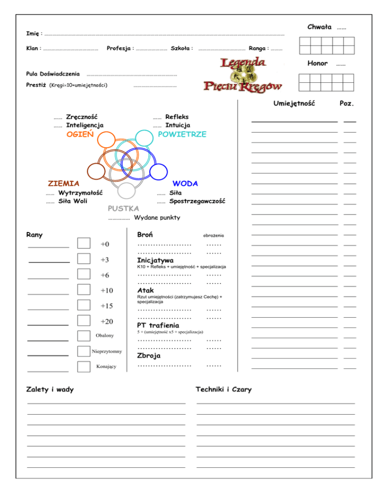 Imię : ………………………………………………………………………………………………………………………………………………………………… Klan : …………………………………… Chwała …… Profesja : …………………… Szkoła : ……………………………… Ranga : ……… Honor Pula Doświadczenia …………………………………………………………… Prestiż (Kręgi×10+umiejętności) …………………………… Umiejętność …… Zręczność …… Inteligencja …… Refleks …… Intuicja OGIEŃ POWIETRZE ZIEMIA …… Wytrzymałość …… Siła Woli WODA PUSTKA …… Siła …… Spostrzegawczość …………… Wydane punkty Rany Broń +0 ………………… ………………… +3 Inicjatywa obrażenia …… …… K10 + Refleks + umiejętność + specjalizacja +6 ………………… ………………… +10 Atak +15 +20 Obalony Nieprzytomny Konający Zalety i wady …… …… …… Rzut umiejętności (zatrzymujesz Cechę) + specjalizacja ………………… ………………… …… …… PT trafienia 5 + (umiejętność x5 + specjalizacja) ………………… ………………… …… …… Zbroja ………………… …… Techniki i Czary Poz. Ekwipunek Skaza Cienia …… Notatki Historia i czyny chwalebne Sojusznicy Wrogowie