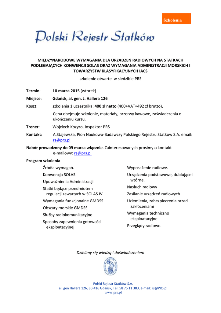 Szkolenia MIĘDZYNARODOWE WYMAGANIA DLA URZĄDZEŃ RADIOWYCH NA STATKACH PODLEGAJĄCYCH KONWENCJI SOLAS ORAZ WYMAGANIA ADMINISTRACJI MORSKICH I TOWARZYSTW KLASYFIKACYJNYCH IACS szkolenie otwarte w siedzibie PRS Termin: 10 marca 2015 (wtorek) Miejsce: Gdańsk, al. gen. J. Hallera 126 Koszt: szkolenia 1 uczestnika: 400 zł netto (400+VAT=492 zł brutto), Cena obejmuje szkolenie, materiały, przerwy kawowe, zaświadczenia o ukończeniu kursu. Trener: Wojciech Kozyro, Inspektor PRS Kontakt: A.Stajewska, Pion Naukowo-Badawczy Polskiego Rejestru Statków S.A. email: [email protected] Nabór prowadzony do 09 marca włącznie. Zainteresowanych prosimy o kontakt e-mailowy: [email protected] Program szkolenia Źródła wymagań. Wyposażenie radiowe. Konwencja SOLAS Urządzenia podstawowe, dublujące i wtórne. Upoważnienia Administracji. Statki będące przedmiotem regulacji zawartych w SOLAS IV Nasłuch radiowy Wymagania funkcjonalne GMDSS Uziemienia, zabezpieczenia przed zakłóceniami Obszary morskie GMDSS Służby radiokomunikacyjne Sposoby zapewnienia gotowości eksploatacyjnej Zasilanie urządzeń radiowych Wymagania techniczno eksploatacyjne Przeglądy radiowe. Dzielimy się wiedzą i doświadczeniem Polski Rejestr Statków S.A. al. gen Hallera 126, 80-416 Gdańsk, Tel: 58 75 11 383, e-mail: [email protected] www.prs.pl