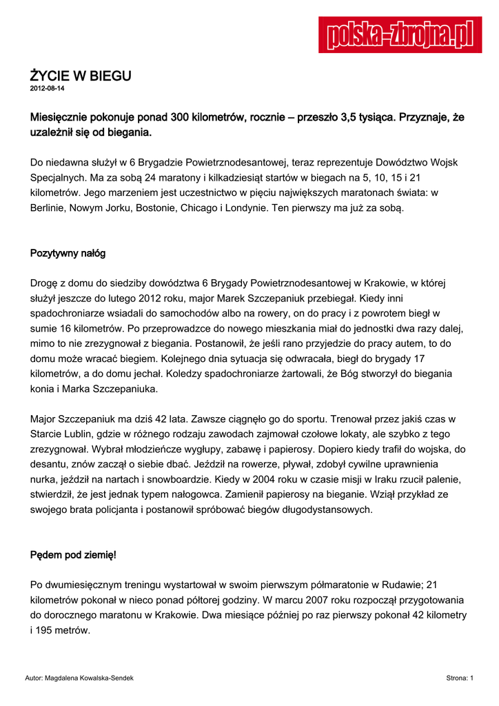 ŻYCIE W BIEGU 2012-08-14 Miesięcznie pokonuje ponad 300 kilometrów, rocznie – przeszło 3,5 tysiąca. Przyznaje, że uzależnił się od biegania. Do niedawna służył w 6 Brygadzie Powietrznodesantowej, teraz reprezentuje Dowództwo Wojsk Specjalnych. Ma za sobą 24 maratony i kilkadziesiąt startów w biegach na 5, 10, 15 i 21 kilometrów. Jego marzeniem jest uczestnictwo w pięciu największych maratonach świata: w Berlinie, Nowym Jorku, Bostonie, Chicago i Londynie. Ten pierwszy ma już za sobą. Pozytywny nałóg Drogę z domu do siedziby dowództwa 6 Brygady Powietrznodesantowej w Krakowie, w której służył jeszcze do lutego 2012 roku, major Marek Szczepaniuk przebiegał. Kiedy inni spadochroniarze wsiadali do samochodów albo na rowery, on do pracy i z powrotem biegł w sumie 16 kilometrów. Po przeprowadzce do nowego mieszkania miał do jednostki dwa razy dalej, mimo to nie zrezygnował z biegania. Postanowił, że jeśli rano przyjedzie do pracy autem, to do domu może wracać biegiem. Kolejnego dnia sytuacja się odwracała, biegł do brygady 17 kilometrów, a do domu jechał. Koledzy spadochroniarze żartowali, że Bóg stworzył do biegania konia i Marka Szczepaniuka. Major Szczepaniuk ma dziś 42 lata. Zawsze ciągnęło go do sportu. Trenował przez jakiś czas w Starcie Lublin, gdzie w różnego rodzaju zawodach zajmował czołowe lokaty, ale szybko z tego zrezygnował. Wybrał młodzieńcze wygłupy, zabawę i papierosy. Dopiero kiedy trafił do wojska, do desantu, znów zaczął o siebie dbać. Jeździł na rowerze, pływał, zdobył cywilne uprawnienia nurka, jeździł na nartach i snowboardzie. Kiedy w 2004 roku w czasie misji w Iraku rzucił palenie, stwierdził, że jest jednak typem nałogowca. Zamienił papierosy na bieganie. Wziął przykład ze swojego brata policjanta i postanowił spróbować biegów długodystansowych. Pędem pod ziemię! Po dwumiesięcznym treningu wystartował w swoim pierwszym półmaratonie w Rudawie; 21 kilometrów pokonał w nieco ponad półtorej godziny. W marcu 2007 roku rozpoczął przygotowania do dorocznego maratonu w Krakowie. Dwa miesiące później po raz pierwszy pokonał 42 kilometry i 195 metrów. Autor: Magdalena Kowalska-Sendek Strona: 1 Do najtrudniejszych startów zalicza między innymi Maraton Wyszehradzki ze słowackiej miejscowości Podoliniec do miasteczka Rytro w Polsce. „To był spory wysiłek, bo prawie 7 kilometrów na trasie prowadziło pod górę”, opowiada. Osiągnął bardzo dobry wynik: na 300 uczestników zajął trzecie miejsce. Bardzo ciężki, wyczerpujący i wymagający był także Maraton Komandosa, w którym startował dwukrotnie, w 2008 roku i 2009 roku. W pierwszym wywalczył razem z drużyną pierwsze miejsce, rok później w kategorii open był drugi. „Spadło już trochę śniegu, a na plecach nieśliśmy 10 kilogramów. Łatwo nie było”. Major uczestniczył także w drużynowym biegu, który co roku jest organizowany 212 metrów pod ziemią w kopalni soli w Bochni. Zwycięstwo wywalczyło tam czterech spadochroniarzy, którzy pokonali 202 kilometry w 12 godzin. „Byliśmy wykończeni. Każdy z nas w szybkim tempie przebiegł po 50 kilometrów. Poza tym w kopalni były duże różnice temperatur i zwycięstwo przypłaciliśmy chorobą. W tym roku odpuszczamy”. Wersja hard Kręcą go nie tylko klasyczne maratony, lecz także nieco zmodyfikowane konkurencje wymagające od zawodników ogromnej woli walki. Przykładem Autor: Magdalena Kowalska-Sendek Strona: 2 takich zmagań jest Bieg Rzeźnika, w którym startował w 2009 roku w parze z innym biegaczem z desantu – starszym chorążym Mariuszem Szostakiem. Pokonali wówczas 80 kilometrów w Bieszczadach i z czasem 9 godzin i 24 minuty zajęli drugie miejsce. „To fajny facet, zdeterminowany i skupiony na wyznaczonych przez siebie celach. Ja na co dzień służę w Bielsku-Białej, on w Krakowie, ale nasze drogi spotkały się już kilkakrotnie”, opowiada bielszczanin. Startowali razem w Jurajskim Półmaratonie w Rudawie, w Biegu Rzeźnika, a także w maratonach w Berlinie i Frankfurcie nad Menem. „Dobrze mieć takich zawodników w drużynie. Marek jest spokojny, opanowany, ale w razie kryzysu doskonale potrafi zmotywować”. Major Szczepaniuk prowadzi dzienniki biegowe, z których wynika, że rocznie pokonuje 3,5 tysiąca kilometrów, czyli przeszło 300 kilometrów miesięcznie. Nie ćwiczy pod okiem specjalisty, ale wie, że trening musi być odpowiednio ułożony. Czasami korzysta z podpowiedzi kolegów zawodników i profesjonalistów, czasami sięga do internetu. „To już szósty rok uprawiania tego sportu. Nadal mnie to cieszy i przynosi dużą satysfakcję, ale nigdy nie wychodzę z domu, żeby po prostu pobiegać. Wszystko jest zaplanowane. Musi takie być, jeśli chce się coś osiągnąć”. Dlaczego dotąd nie wyłapał go żaden łowca talentów? „Nie jestem żadnym talentem. To po prostu konsekwentna praca”, odpowiada z uśmiechem. Zaraźliwa pasja Miłością do sportu próbował zarazić najbliższych. Początki nie były jednak najlepsze: kiedy odprowadzał do domu swoją przyszłą żonę, zaproponował jej zamiast jazdy windą bieg na dwunaste piętro wieżowca. Myślał, że i ona polubi bieganie. Osiągnął efekt przeciwny do zamierzonego. Zachęcał także synów, ale oni, choć próbowali sił w minimaratonie (4,2 kilometra), ostatecznie wybrali sporty zimowe. „Trudno mi usiąść przed telewizorem w kapciach, bo nie umiem się przez dłuższy czas skupić. Już wolę iść do kina. Po seansie żona wraca do domu samochodem, a ja kilkanaście kilometrów biegnę. I wszyscy są zadowoleni”. Kiedy służył w 6 Brygadzie, kilka razy w tygodniu biegał dookoła sztabu. 70 okrążeń wokół budynku robiło wrażenie na przypadkowych obserwatorach, ale on sam tego rodzaju treningów wyjątkowo nie lubił. Z czasem inni spadochroniarze złapali bakcyla. „Zaraziłem wielu swoją pasją. Biega