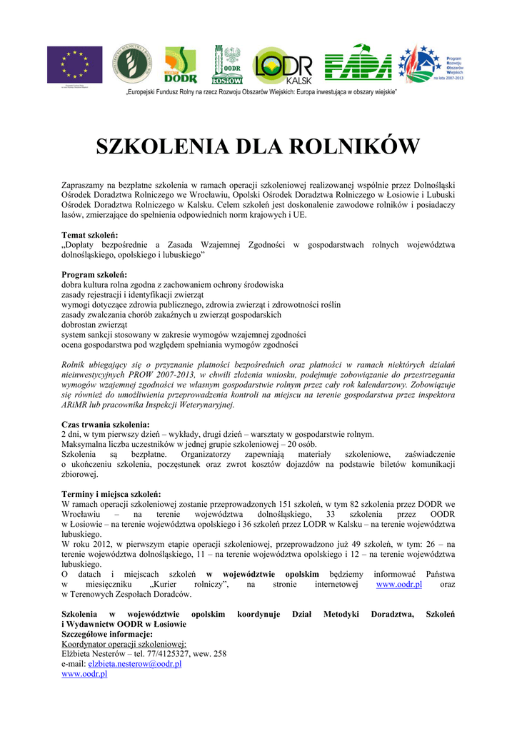 „Europejski Fundusz Rolny na rzecz Rozwoju Obszarów Wiejskich: Europa inwestująca w obszary wiejskie” SZKOLENIA DLA ROLNIKÓW Zapraszamy na bezpłatne szkolenia w ramach operacji szkoleniowej realizowanej wspólnie przez Dolnośląski Ośrodek Doradztwa Rolniczego we Wrocławiu, Opolski Ośrodek Doradztwa Rolniczego w Łosiowie i Lubuski Ośrodek Doradztwa Rolniczego w Kalsku. Celem szkoleń jest doskonalenie zawodowe rolników i posiadaczy lasów, zmierzające do spełnienia odpowiednich norm krajowych i UE. Temat szkoleń: „Dopłaty bezpośrednie a Zasada Wzajemnej Zgodności w gospodarstwach rolnych województwa dolnośląskiego, opolskiego i lubuskiego” Program szkoleń: dobra kultura rolna zgodna z zachowaniem ochrony środowiska zasady rejestracji i identyfikacji zwierząt wymogi dotyczące zdrowia publicznego, zdrowia zwierząt i zdrowotności roślin zasady zwalczania chorób zakaźnych u zwierząt gospodarskich dobrostan zwierząt system sankcji stosowany w zakresie wymogów wzajemnej zgodności ocena gospodarstwa pod względem spełniania wymogów zgodności Rolnik ubiegający się o przyznanie płatności bezpośrednich oraz płatności w ramach niektórych działań nieinwestycyjnych PROW 2007-2013, w chwili złożenia wniosku, podejmuje zobowiązanie do przestrzegania wymogów wzajemnej zgodności we własnym gospodarstwie rolnym przez cały rok kalendarzowy. Zobowiązuje się również do umożliwienia przeprowadzenia kontroli na miejscu na terenie gospodarstwa przez inspektora ARiMR lub pracownika Inspekcji Weterynaryjnej. Czas trwania szkolenia: 2 dni, w tym pierwszy dzień – wykłady, drugi dzień – warsztaty w gospodarstwie rolnym. Maksymalna liczba uczestników w jednej grupie szkoleniowej – 20 osób. Szkolenia są bezpłatne. Organizatorzy zapewniają materiały szkoleniowe, zaświadczenie o ukończeniu szkolenia, poczęstunek oraz zwrot kosztów dojazdów na podstawie biletów komunikacji zbiorowej. Terminy i miejsca szkoleń: W ramach operacji szkoleniowej zostanie przeprowadzonych 151 szkoleń, w tym 82 szkolenia przez DODR we Wrocławiu – na terenie województwa dolnośląskiego, 33 szkolenia przez OODR w Łosiowie – na terenie województwa opolskiego i 36 szkoleń przez LODR w Kalsku – na terenie województwa lubuskiego. W roku 2012, w pierwszym etapie operacji szkoleniowej, przeprowadzono już 49 szkoleń, w tym: 26 – na terenie województwa dolnośląskiego, 11 – na terenie województwa opolskiego i 12 – na terenie województwa lubuskiego. O datach i miejscach szkoleń w województwie opolskim będziemy informować Państwa w miesięczniku „Kurier rolniczy”, na stronie internetowej www.oodr.pl oraz w Terenowych Zespołach Doradców. Szkolenia w województwie opolskim i Wydawnictw OODR w Łosiowie Szczegółowe informacje: Koordynator operacji szkoleniowej: Elżbieta Nesterów – tel. 77/4125327, wew. 258 e-mail: [email protected] www.oodr.pl koordynuje Dział Metodyki Doradztwa, Szkoleń Operacja szkoleniowa „Dopłaty bezpośrednie a Zasada Wzajemnej Zgodności w gospodarstwach rolnych województwa dolnośląskiego, opolskiego i lubuskiego” realizowana przez konsorcjum: Dolnośląski Ośrodek Doradztwa Rolniczego we Wrocławiu – lider oraz dwie instytucje partnerskie: Opolski Ośrodek Doradztwa Rolniczego w Łosiowie i Lubuski Ośrodek Doradztwa Rolniczego w Kalsku. Współfinansowana ze środków Unii Europejskiej w ramach działania 111 „Szkolenia zawodowe dla osób zatrudnionych w rolnictwie i leśnictwie” objętego Programem Rozwoju Obszarów Wiejskich na lata 2007-2013, zgodnie z umową o przyznanie pomocy nr 00001-6900-FA1900365/11. Instytucja Zarządzająca Programem Rozwoju Obszarów Wiejskich na lata 2007-2013 – Minister Rolnictwa i Rozwoju Wsi Podmiot Wdrażający – Fundacja Programów Pomocy dla Rolnictwa FAPA Przydatne informacje na temat programów operacyjnych i funduszy znajdują się na stronach: www.funduszeeuropejskie.gov.pl www.minrol.gov.pl