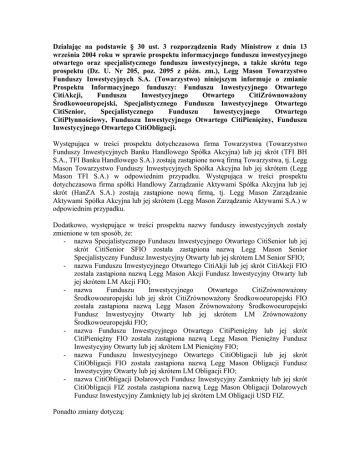 Działając na podstawie § 30 ust. 3 rozporządzenia Rady Ministrow z dnia 13 września 2004 roku w sprawie prospektu informacyjnego funduszu inwestycyjnego otwartego oraz specjalistycznego funduszu inwestycyjnego, a także skrótu tego prospektu (Dz. U. Nr 205, poz. 2095 z późn. zm.), Legg Mason Towarzystwo Funduszy Inwestycyjnych S.A. (Towarzystwo) niniejszym informuje o zmianie Prospektu Informacyjnego funduszy: Funduszu Inwestycyjnego Otwartego CitiAkcji, Funduszu Inwestycyjnego Otwartego CitiZrównoważony Środkowoeuropejski, Specjalistycznego Funduszu Inwestycyjnego Otwartego CitiSenior, Specjalistycznego Funduszu Inwestycyjnego Otwartego CitiPłynnościowy, Funduszu Inwestycyjnego Otwartego CitiPieniężny, Funduszu Inwestycyjnego Otwartego CitiObligacji. Występująca w treści prospektu dotychczasowa firma Towarzystwa (Towarzystwo Funduszy Inwestycyjnych Banku Handlowego Spółka Akcyjna) lub jej skrót (TFI BH S.A., TFI Banku Handlowego S.A.) zostają zastąpione nową firmą Towarzystwa, tj. Legg Mason Towarzystwo Funduszy Inwestycyjnych Spółka Akcyjna lub jej skrótem (Legg Mason TFI S.A.) w odpowiednim przypadku. Występująca w treści prospektu dotychczasowa firma spółki Handlowy Zarządzanie Aktywami Spółka Akcyjna lub jej skrót (HanZA S.A.) zostają zastąpione nową firmą, tj. Legg Mason Zarządzanie Aktywami Spółka Akcyjna lub jej skrótem (Legg Mason Zarządzanie Aktywami S.A.) w odpowiednim przypadku. Dodatkowo, występujące w treści prospektu nazwy funduszy inwestycyjnych zostały zmienione w ten sposób, że: - nazwa Specjalistycznego Funduszu Inwestycyjnego Otwartego CitiSenior lub jej skrót CitiSenior SFIO została zastąpiona nazwą Legg Mason Senior Specjalistyczny Fundusz Inwestycyjny Otwarty lub jej skrótem LM Senior SFIO; - nazwa Funduszu Inwestycyjnego Otwartego CitiAkji lub jej skrót CitiAkcji FIO została zastąpiona nazwą Legg Mason Akcji Fundusz Inwestycyjny Otwarty lub jej skrótem LM Akcji FIO; - nazwa Funduszu Inwestycyjnego Otwartego CitiZrównoważony Środkowoeuropejski lub jej skrót CitiZrównoważony Środkowoeuropejski FIO została zastąpiona nazwą Legg Mason Zrównoważony Środkowoeuropejski Fundusz Inwestycyjny Otwarty lub jej skrótem LM Zrównoważony Środkowoeuropejski FIO; - nazwa Funduszu Inwestycyjnego Otwartego CitiPieniężny lub jej skrót CitiPieniężny FIO została zastąpiona nazwą Legg Mason Pieniężny Fundusz Inwestycyjny Otwarty lub jej skrótem LM Pieniężny FIO; - nazwa Funduszu Inwestycyjnego Otwartego CitiObligacji lub jej skrót CitiObligacji FIO została zastąpiona nazwą Legg Mason Obligacji Fundusz Inwestycyjny Otwarty lub jej skrótem LM Obligacji FIO; - nazwa CitiObligacji Dolarowych Fundusz Inwestycyjny Zamknięty lub jej skrót CitiObligacji FIZ została zastąpiona nazwą Legg Mason Obligacji Dolarowych Fundusz Inwestycyjny Zamknięty lub jej skrótem LM Obligacji USD FIZ. Ponadto zmiany dotyczą: 1. Strona tytułowa otrzymuje brzmienie: „Prospekt Informacyjny Legg Mason Akcji Funduszu Inwestycyjnego Otwartego Fundusz może używać nazwy LM Akcji FIO Do 1 października 2006 roku Fundusz działał pod nazwą Fundusz Inwestycyjny Otwarty CitiAkcji Do 25 marca 2002 Fundusz działał pod nazwą Otwarty Fundusz Inwestycyjny Akcji Kapitał Handlowy II Legg Mason Zrównoważony Środkowoeuropejski Funduszu Inwestycyjnego Otwartego Fundusz może używać nazwy LM Zrównoważony Środkowoeuropejski FIO Do 1 października 2006 roku Fundusz działał pod nazwą Fundusz Inwestycyjny Otwarty CitiZrównoważony Środkowoeuropejski Do 25 marca 2002 Fundusz działał pod nazwą Otwarty Fundusz Inwestycyjny Zrównoważony Kapitał Handlowy I, natomiast od 26 marca 2002 do 3 sierpnia 2004 pod nazwą CitiZrównoważony FIO Legg Mason Senior Specjalistycznego Funduszu Inwestycyjnego Otwartego Fundusz może używać nazwy LM Senior SFIO Do 1 października 2006 roku Fundusz działał pod nazwą Specjalistyczny Fundusz Inwestycyjny Otwarty CitiSenior Do 25 marca 2002 Fundusz działał pod nazwą Specjalistyczny Otwarty Fundusz Inwestycyjny Kapitał Handlowy Senior Specjalistycznego Funduszu Inwestycyjnego Otwartego CitiPłynnościowy Fundusz może używać nazwy CitiPłynnościowy SFIO Legg Mason Pieniężny Funduszu Inwestycyjnego Otwartego Fundusz może używać nazwy LM Pieniężny FIO Do 1 października 2006 roku Fundusz działał pod nazwą Fundusz Inwestycyjny Otwarty CitiPieniężny Do 25 marca 2002 Fundusz działał pod nazwą Otwarty Fundusz Inwestycyjny Rynku Pieniężnego Kapitał Handlowy IV Legg Mason Obligacji Funduszu Inwestycyjnego Otwartego Fundusz może używać nazwy LM Obligacji FIO Do 1 października 2006 roku Fundusz działał pod nazwą Fundusz Inwestycyjny Otwarty CitiObligacji Do 25 marca 2002 Fundusz działał pod nazwą Otwarty Fundusz Inwestycyjny Papierów Dłużnych Kapitał Handlowy III Organem wyżej wskazanych Funduszy jest Legg Mason Towarzystwo Funduszy Inwestycyjnych Spółka Akcyjna z siedzibą w Warszawie i adresem: ul. Traugutta 7/9, 00-067 Warszawa („Towarzystwo”) Strona internetowa www.citifundusze.pl Fundusze inwestycyjne otwarte, objęte niniejszym Prospektem, prowadzą działalność zgodnie z prawem wspólnotowym regulującym zasady zbiorowego inwestowania w papiery wartościowe. Niniejszy prospekt informacyjny został sporządzony na podstawie art. 220 ustawy z dnia 27 maja 2004 r. o funduszach inwestycyjnych (Dz. U. Nr 146, poz. 1546, z późn. zm.) oraz Rozporządzenia Rady Ministrów z dnia 13 września 2004 r. w sprawie prospektu informacyjnego funduszu inwestycyjnego otwartego oraz specjalistycznego funduszu inwestycyjnego otwartego, a także skrótu tego prospektu (Dz. U. Nr 205, poz. 2095), z uwzględnieniem zmian wynikających z Rozporządzenia Rady Ministrów z dnia 4 maja 2006 r. zmieniającego rozporządzenie w sprawie prospektu informacyjnego funduszu inwestycyjnego otwartego oraz specjalistycznego funduszu inwestycyjnego otwartego, a także sk