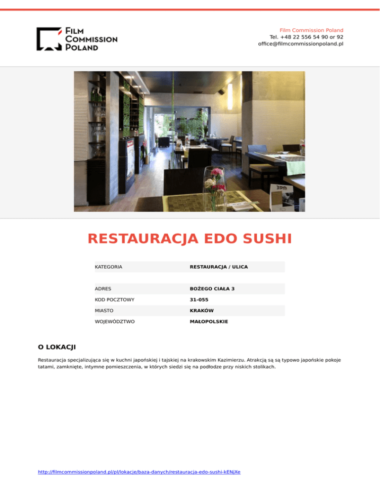 Film Commission Poland Tel. +48 22 556 54 90 or 92 office@filmcommissionpoland.pl RESTAURACJA EDO SUSHI KATEGORIA RESTAURACJA / ULICA ADRES BOŻEGO CIAŁA 3 KOD POCZTOWY 31-055 MIASTO KRAKÓW WOJEWÓDZTWO MAŁOPOLSKIE O LOKACJI Restauracja specjalizująca się w kuchni japońskiej i tajskiej na krakowskim Kazimierzu. Atrakcją są są typowo japońskie pokoje tatami, zamknięte, intymne pomieszczenia, w których siedzi się na podłodze przy niskich stolikach. http://filmcommissionpoland.pl/pl/lokacje/baza-danych/restauracja-edo-sushi-kENjXe