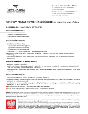 Kancelaria Notarialna Paweł Kania ul. Kasprowicza 45/47 piętro I lok. 3 01-836 Warszawa tel./fax: 22 834 12 40 oraz 864 81 15 e-mail: [email protected] www.notariusz-kania.com UMOWY MAJĄTKOWE MAŁŻEŃSKIE po zawarciu małżeństwa rozdzielność majątkowa - intercyza Potrzebne dokumenty: dowody osobiste małżonków, skrócony odpis aktu małżeństwa, Potrzebne informacje: określenie, czy Strony chcą: ustanowić rozdzielność majątkową, ograniczyć wspólność ustawową, rozszerzyć wspólność ustawową, ustanowić rozdzielność majątkową z wyrównaniem dorobków. wskazanie przedmiotów, które mają zostać wyłączone z majątku wspólnego (dot. ograniczenia wspólności ustawowej), wskazanie przedmiotów, które mają zostać włączone do majątku wspólnego (dot. rozszerzenia wspólności ustawowej). podział majątku dorobkowego: dowody osobiste małżonków, dpis wyroku rozwiązującego związek małżeński – w przypadku rozwodu lub orzeczenie o separacji, jeżeli o jest ona powodem ustania wspólności ustawowej, ypis z umowy majątkowej małżeńskiej, jeżeli taka była zawarta (przed zawarciem małżeństwa lub w jego w trakcie). Potrzebne informacje: wskazanie przedmiotów umowy (składników dzielonego majątku), określenie sposobu podziału majątku (komu ma przypaść dany przedmiot i czy w całości czy w udziałach, a jeżeli w udziałach, to w jakiej wysokości), określenie, czy podział majątku następuje ze spłatą / dopłatą na rzecz któregoś z małżonków, jeżeli tak, to w jakiej wysokości i na jakich warunkach, wartość rynkowa przedmiotu / przedmiotów umowy (szacunkowa), termin wydania przedmiotu / przedmiotów umowy w posiadanie nabywcy. UWAGI: Umowa podziału majątku może dotyczy wyłącznie przedmiotów objętych wspólnością majątkową. Osoby dzielące wspólny majątek nie mają obowiązku dokonywania wyceny u rzeczoznawcy majątkowego, ani angażowania pełnomocników, zwłaszcza jeżeli nie istnieje pomiędzy nimi spór w kwestii podziału. W trakcie dokonywania podziału notariusz udziela stronom niezbędnych wyjaśnień dotyczących prawnych skutków podziału i zadba o bezpieczeństwo interesów obydwu Stron. Do każdej czynności notarialnej wymagany jest dokument tożsamości, którym jest dowód osobisty lub paszport. Notariusz zawsze prosi o ich okazanie podczas czynności. Uprzejmie prosimy o podanie danych osobowych Stron czynności notarialnej przed umówionym terminem czynności notarialnej. Pozwoli nam to na przygotowanie maksymalnie kompletnego projektu aktu notarialnego, co przełoży się na szybkość i sprawność Państwa obsługi w Kancelarii. Dane osobowe można podać telefonicznie, pocztą elektroniczną lub faksem (skan /kserokopia dokumentów tożsamości lub w treści e-maila/faksu podanie: imienia/ imion, nazwisk, imion rodziców, adresu zamieszkania, numerów dowodów osobistych lub paszportów, numerów PESEL oraz stanu cywilnego). Zachęcamy również Państwa do skorzystania z naszego FORMULARZA.