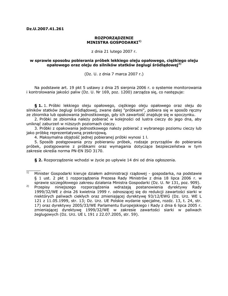 Dz.U.2007.41.261 ROZPORZĄDZENIE MINISTRA GOSPODARKI1) z dnia 21 lutego 2007 r. w sprawie sposobu pobierania próbek lekkiego oleju opałowego, ciężkiego oleju opałowego oraz oleju do silników statków żeglugi śródlądowej2) (Dz. U. z dnia 7 marca 2007 r.) Na podstawie art. 19 pkt 5 ustawy z dnia 25 sierpnia 2006 r. o systemie monitorowania i kontrolowania jakości paliw (Dz. U. Nr 169, poz. 1200) zarządza się, co następuje: § 1. 1. Próbki lekkiego oleju opałowego, ciężkiego oleju opałowego oraz oleju do silników statków żeglugi śródlądowej, zwane dalej "próbkami", pobiera się w sposób ręczny ze zbiornika lub opakowania jednostkowego, gdy ich zawartość znajduje się w spoczynku. 2. Próbki ze zbiornika należy pobierać w kolejności od lustra cieczy do jego dna, aby uniknąć zaburzeń w niższych poziomach cieczy. 3. Próbki z opakowania jednostkowego należy pobierać z wybranego poziomu cieczy lub jako próbkę reprezentatywną przekrojową. 4. Maksymalna objętość jednej pobieranej próbki wynosi 1 l. 5. Sposób postępowania przy pobieraniu próbek, rodzaje przyrządów do pobierania próbek, postępowanie z próbkami oraz wymagania dotyczące bezpieczeństwa w tym zakresie określa norma PN-EN ISO 3170. § 2. Rozporządzenie wchodzi w życie po upływie 14 dni od dnia ogłoszenia. ______ 1) Minister Gospodarki kieruje działem administracji rządowej - gospodarka, na podstawie § 1 ust. 2 pkt 1 rozporządzenia Prezesa Rady Ministrów z dnia 18 lipca 2006 r. w sprawie szczegółowego zakresu działania Ministra Gospodarki (Dz. U. Nr 131, poz. 909). 2) Przepisy niniejszego rozporządzenia wdrażają postanowienia dyrektywy Rady 1999/32/WE z dnia 26 kwietnia 1999 r. odnoszącej się do redukcji zawartości siarki w niektórych paliwach ciekłych oraz zmieniającej dyrektywę 93/12/EWG (Dz. Urz. WE L 121 z 11.05.1999, str. 13; Dz. Urz. UE Polskie wydanie specjalne, rozdz. 13, t. 24, str. 17) oraz dyrektywy 2005/33/WE Parlamentu Europejskiego i Rady z dnia 6 lipca 2005 r. zmieniającej dyrektywę 1999/32/WE w zakresie zawartości siarki w paliwach żeglugowych (Dz. Urz. UE L 191 z 22.07.2005, str. 59).